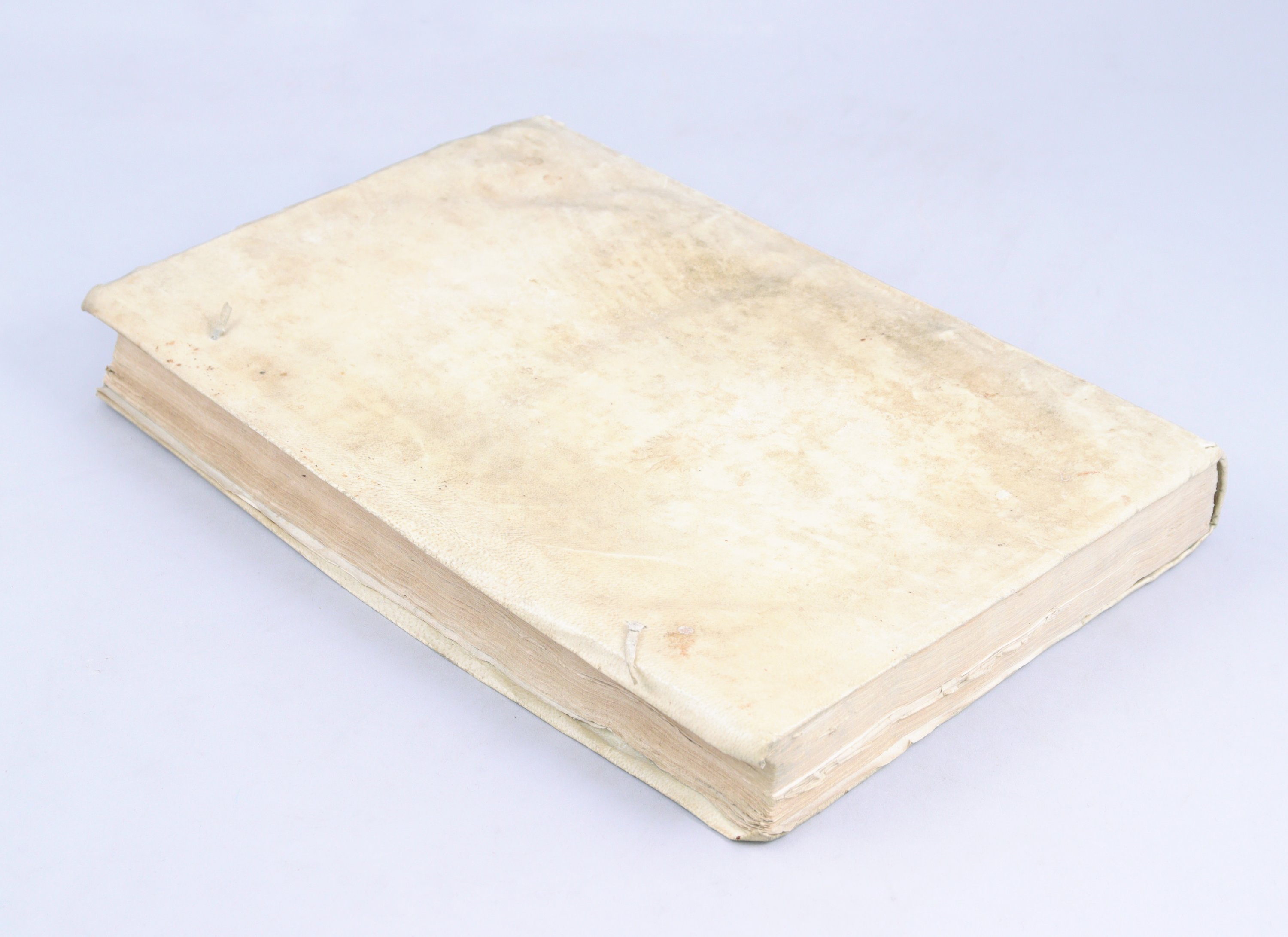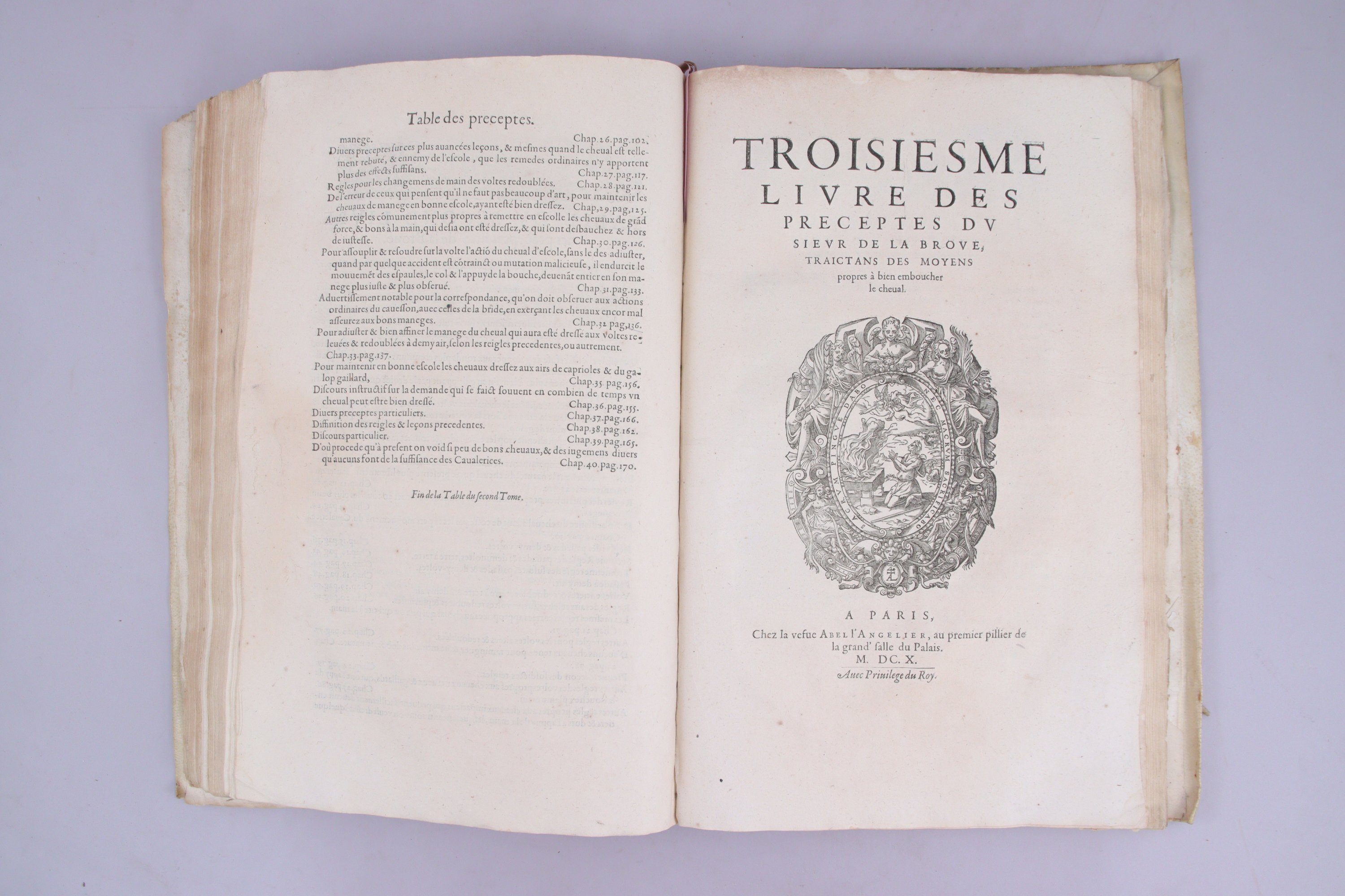 3 tomes en 1 volume in-folio (390 X 260 mm). Titre gravé sur cuivre par de Mallery, (4 ff), 177 pages. 178 pages et (1 f). 105 pages, (1 f) et 23 pages. Plein vélin souple ivoire à petits recouvrements. Traces de lacets. (Papier de la moitié des cahiers du Premier Livre uniformémént roussi. Galerie de ver dans la marge inférieure d'une trentaine de feuillets du Troisième Livre, touchant au texte d'une douzaine de feuillets. Les 3 derniers cahiers +, ++, et +++ qui portent le titre "Avis du Sieur de La Broue sur le debvoir de l'escuyer de grande escuyrie", paginés 1 à 23, sont uniformément roussis, et souffrent d'une galerie de ver touchant au texte sur 20 pages).