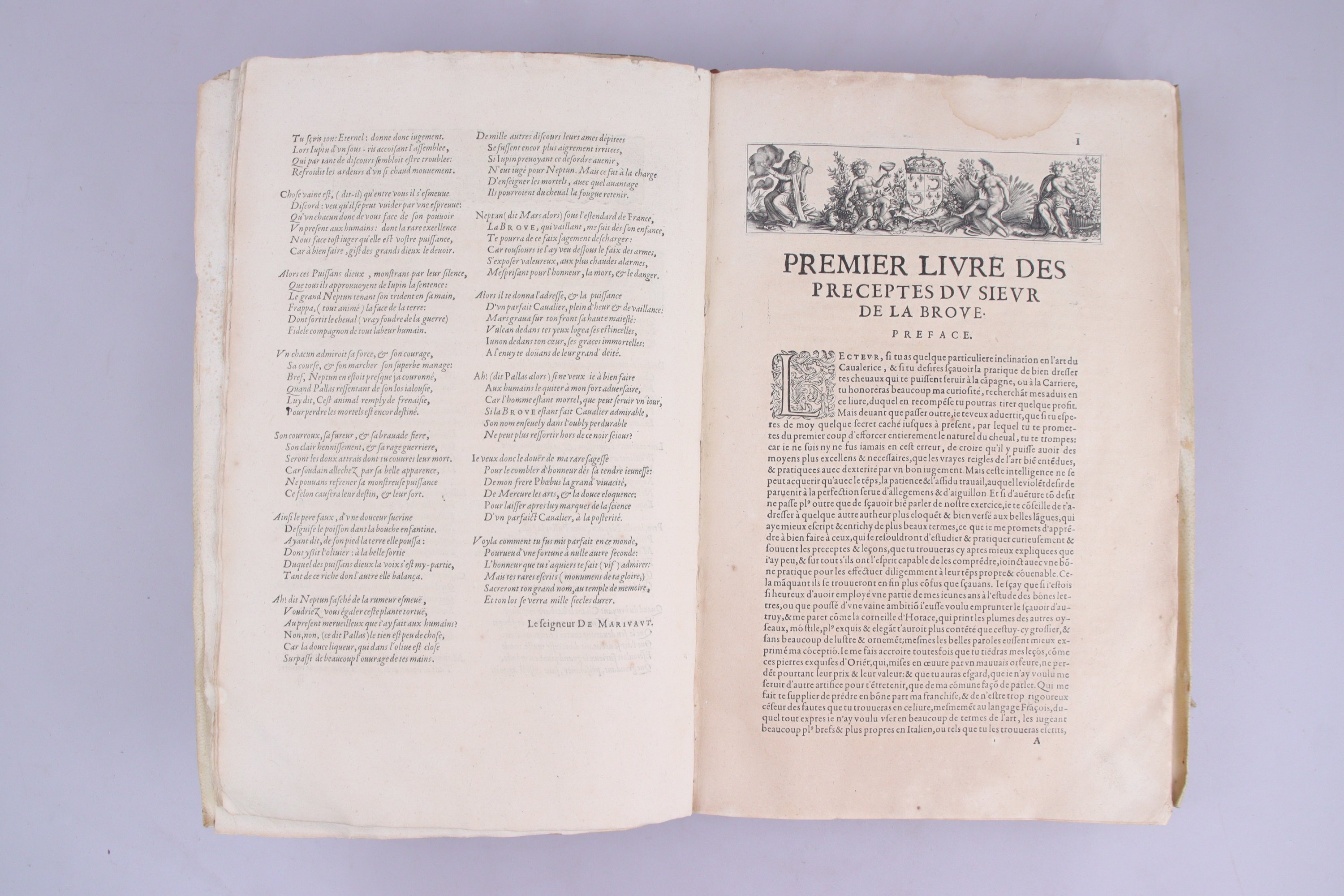 "Premier traité d'équitation composé par un Français, élève de Giambattista Pignatelli à Naples, puis écuyer ordinaire à la Grande Ecurie, sur le modèle des traités italiens.". (Balsamo et Simonin). Il est illustré de nombreuses figures sur bois in-texte.