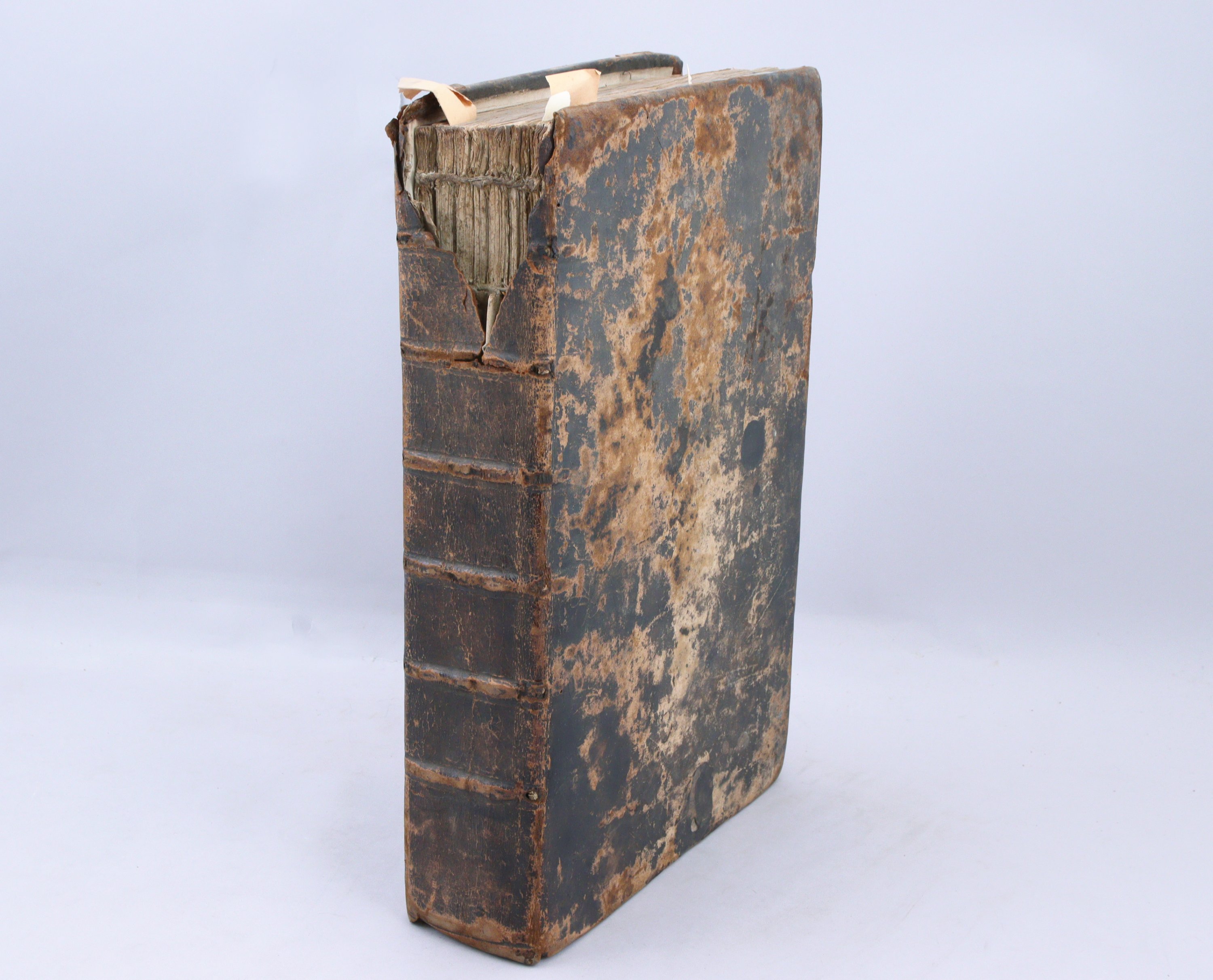 Grand et fort in-folio (410 X 265 mm), XXXVIII pages, 838, 4 et 4 pages. Veau du temps, dos muet. (Reliure très endommagée ; corps d'ouvrage déboîté ; manque 2 caissons au dos. Couture des cahiers un peu relâchée.)