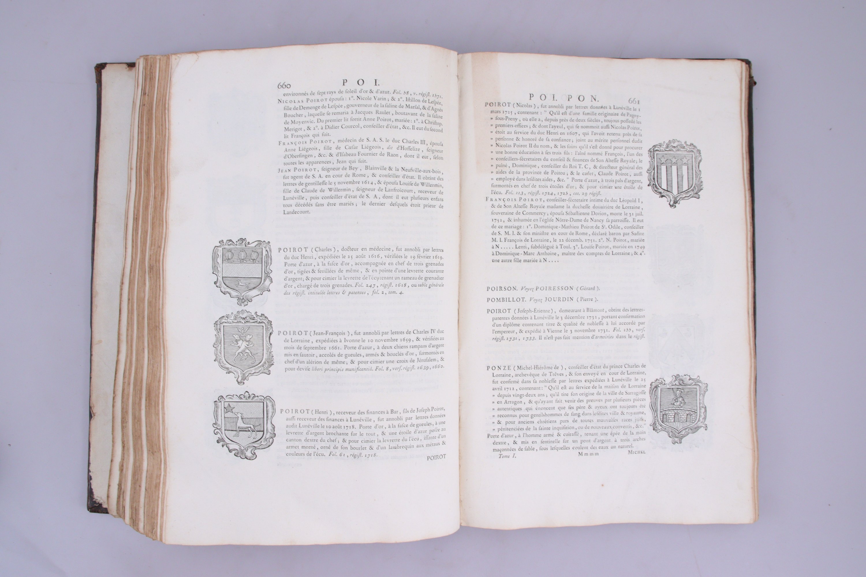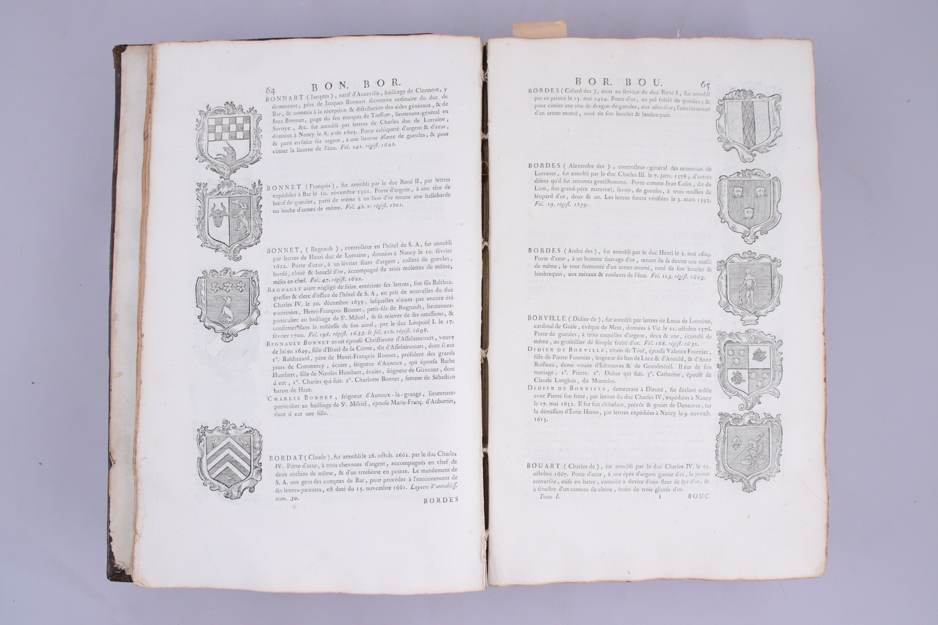 Important ouvrage de généalogie lorraine, très abondamment illustré dans les marges d'environ 1000 blasons. Seul tome publié au XVIIIème siècle, la publication étant interrompue par la mort de l'auteur ; les autres volumes ont été publiés en 1974, sous forme de fac-simile du manuscrit préparatoire, après son acquisition par la Bibliothèque de Nancy.