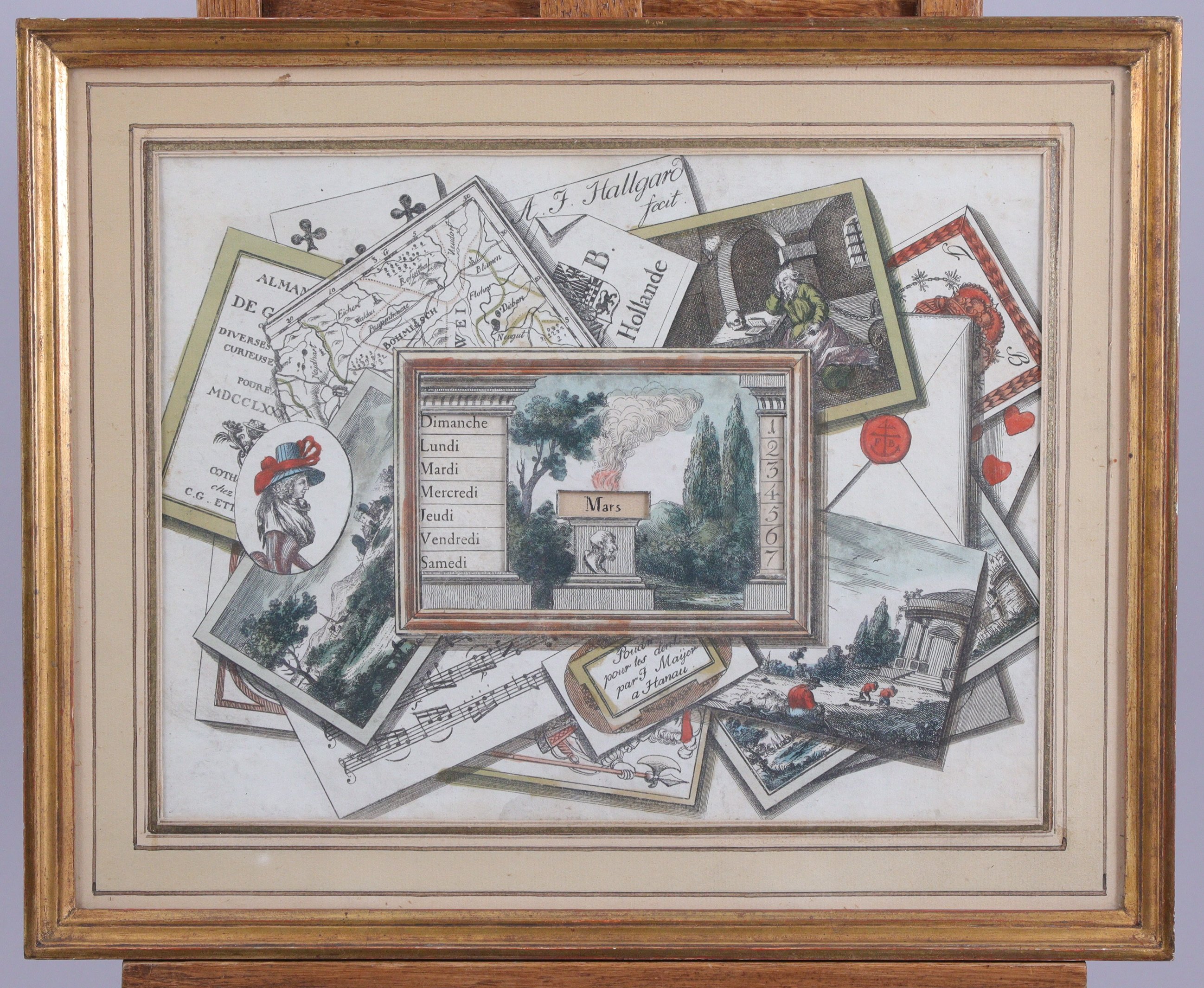 On y distingue diverses signatures telles : "A.F Hallgard fecit", des cartes, partitions, pli cacheté etc.
