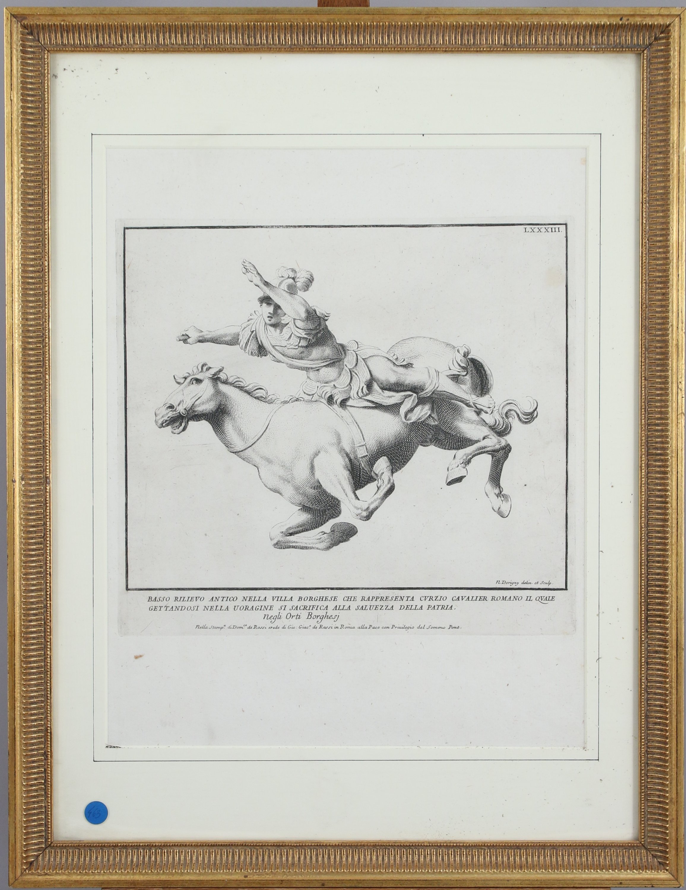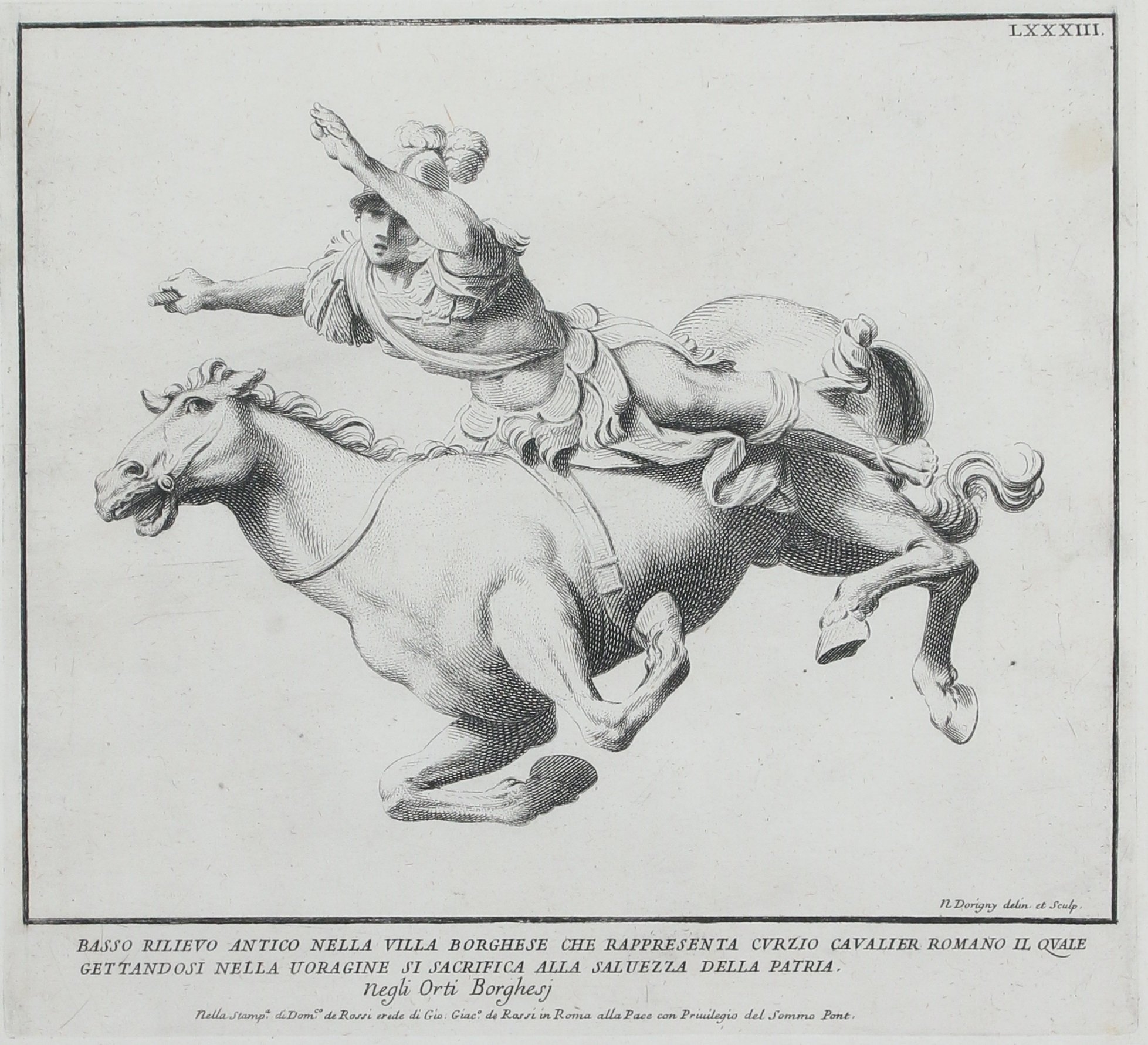 Titrée "Basso rilievo antico nella villa Borghese che rappresenta cvrzio cavalier romano il qvale gettandosi nella uoragine si sacrifica alla saluezza della patria. Negli Orti Borghesj, nella satmpa di Domenico de Rossi erede di Gio : Giac°. de Rossi in Roma alla Pace con Privilegio del Sommo Pont."