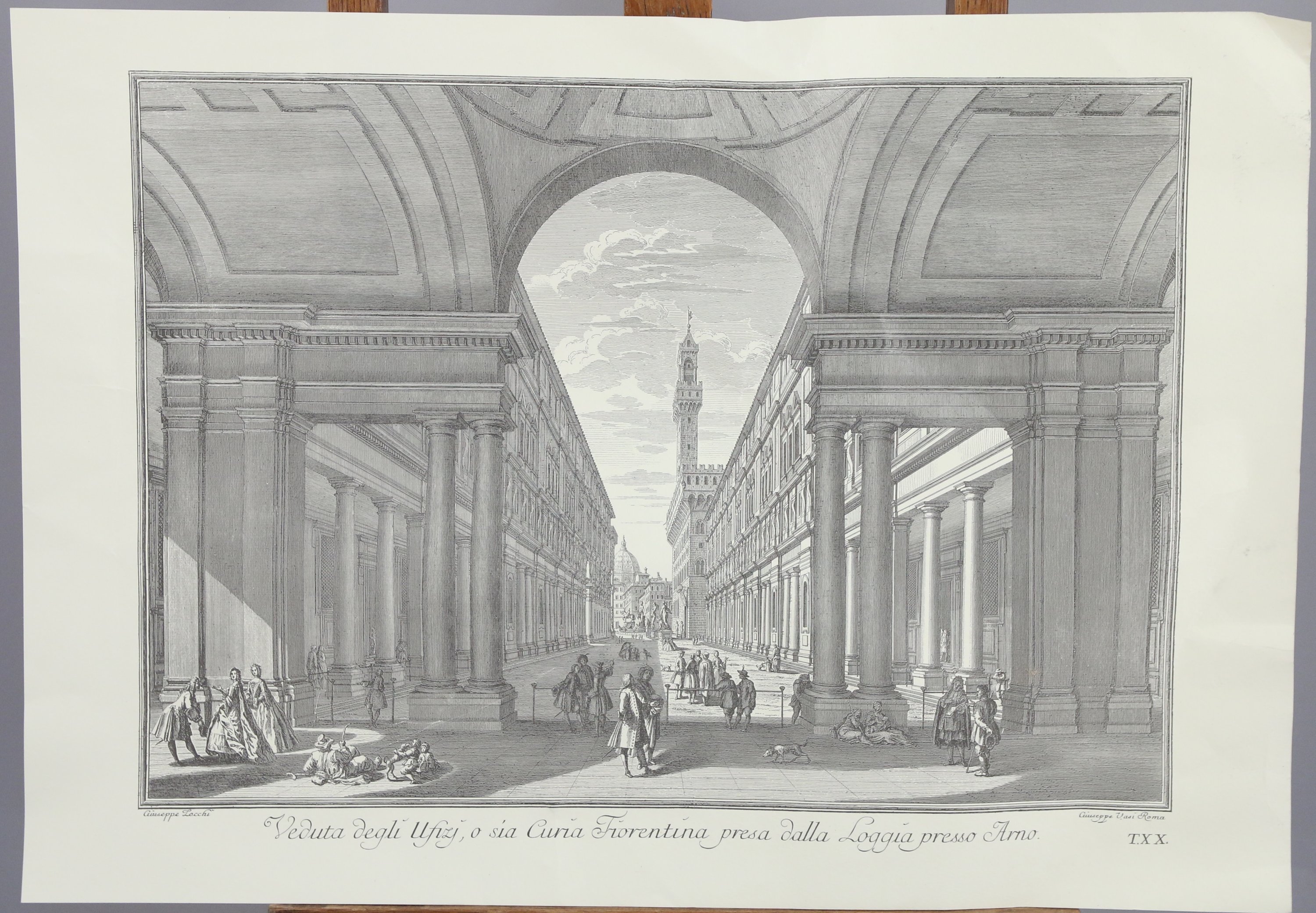 JOINT : Giuseppe LOCCHI & Giuseppe VASI (d'après), Veduta des Offices à Florence, estampe. Haut. 34,5, Larg. 49,5 cm. (Pliures)