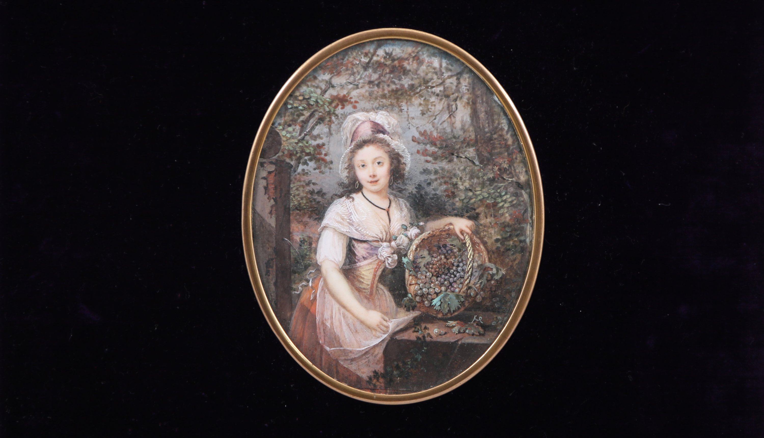 la couverture, foncée d'un velours cramoisi, est ornée d'une belle miniature ovale sur ivoire figurant une jeune vendangeuse (Haut. 13,2, Larg. 10,5 cm).