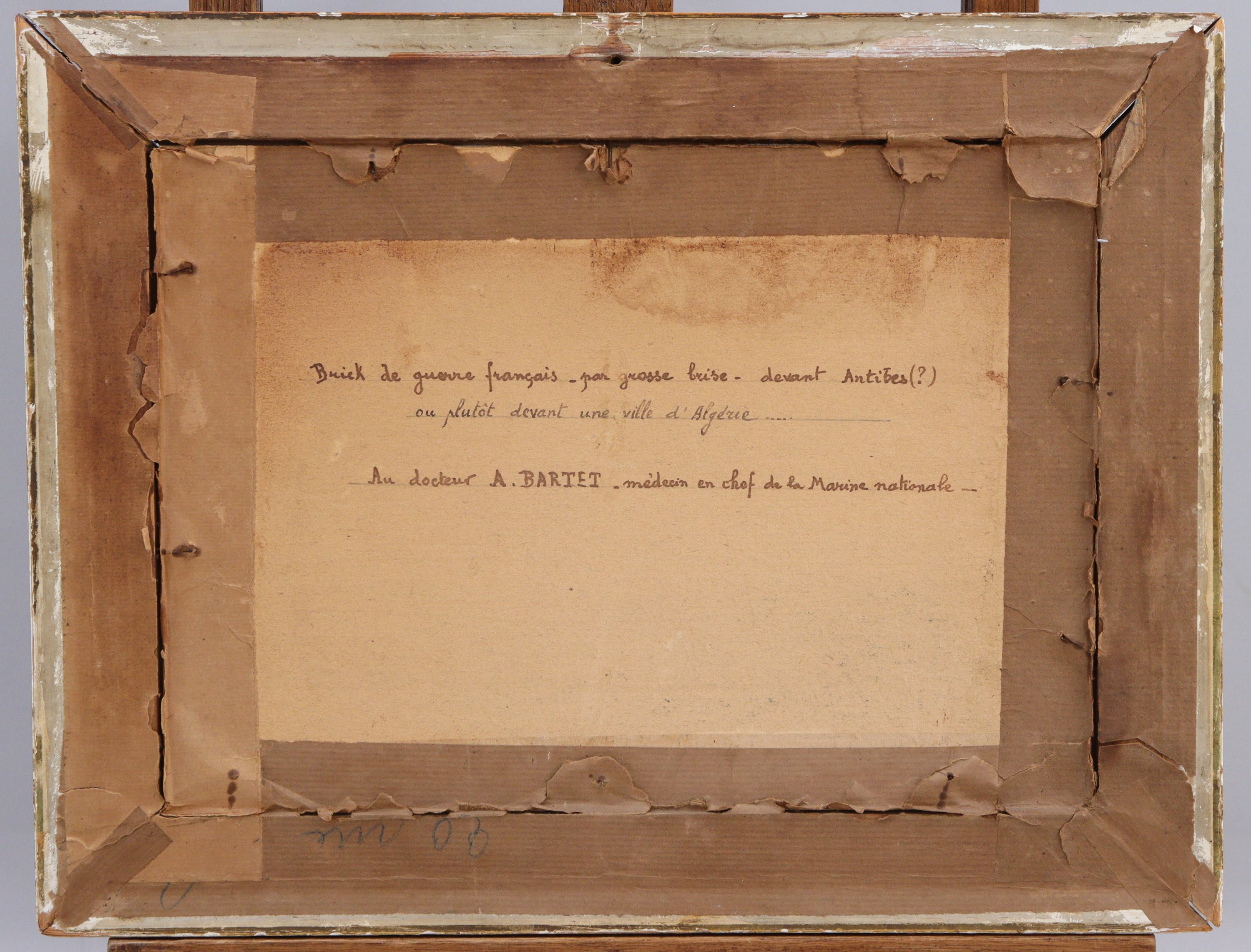 Brick de guerre français par grosse brise devant Antibes ou une ville dAlgérie.