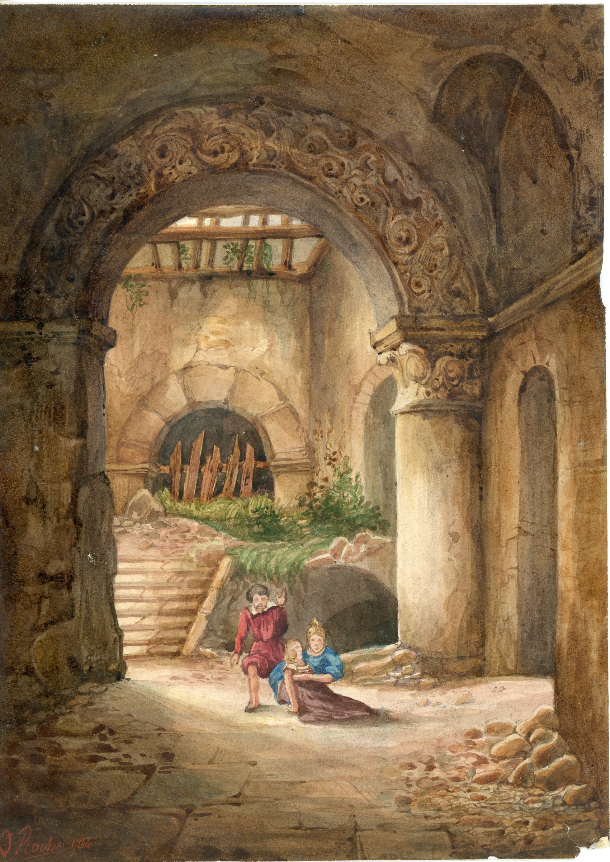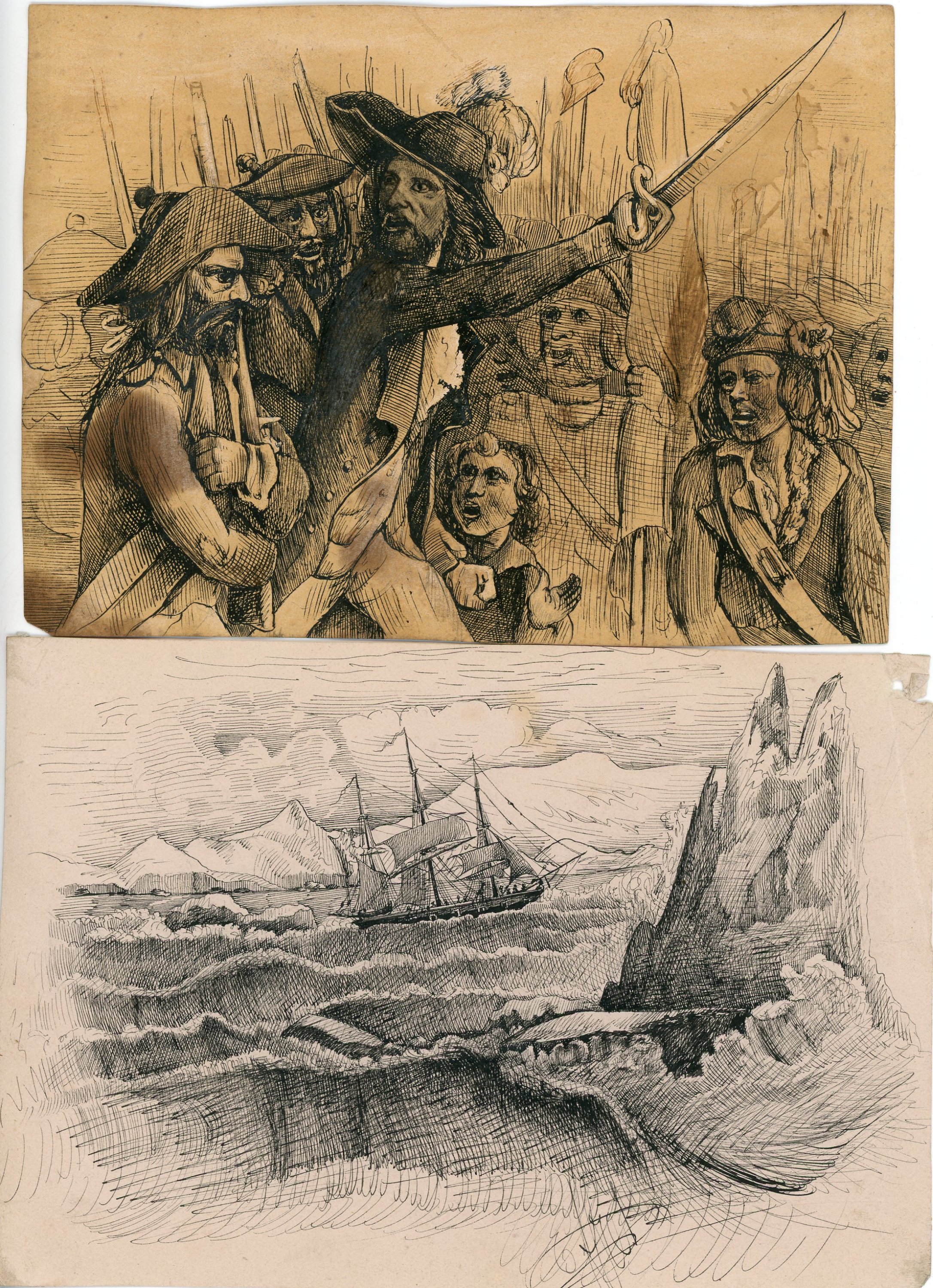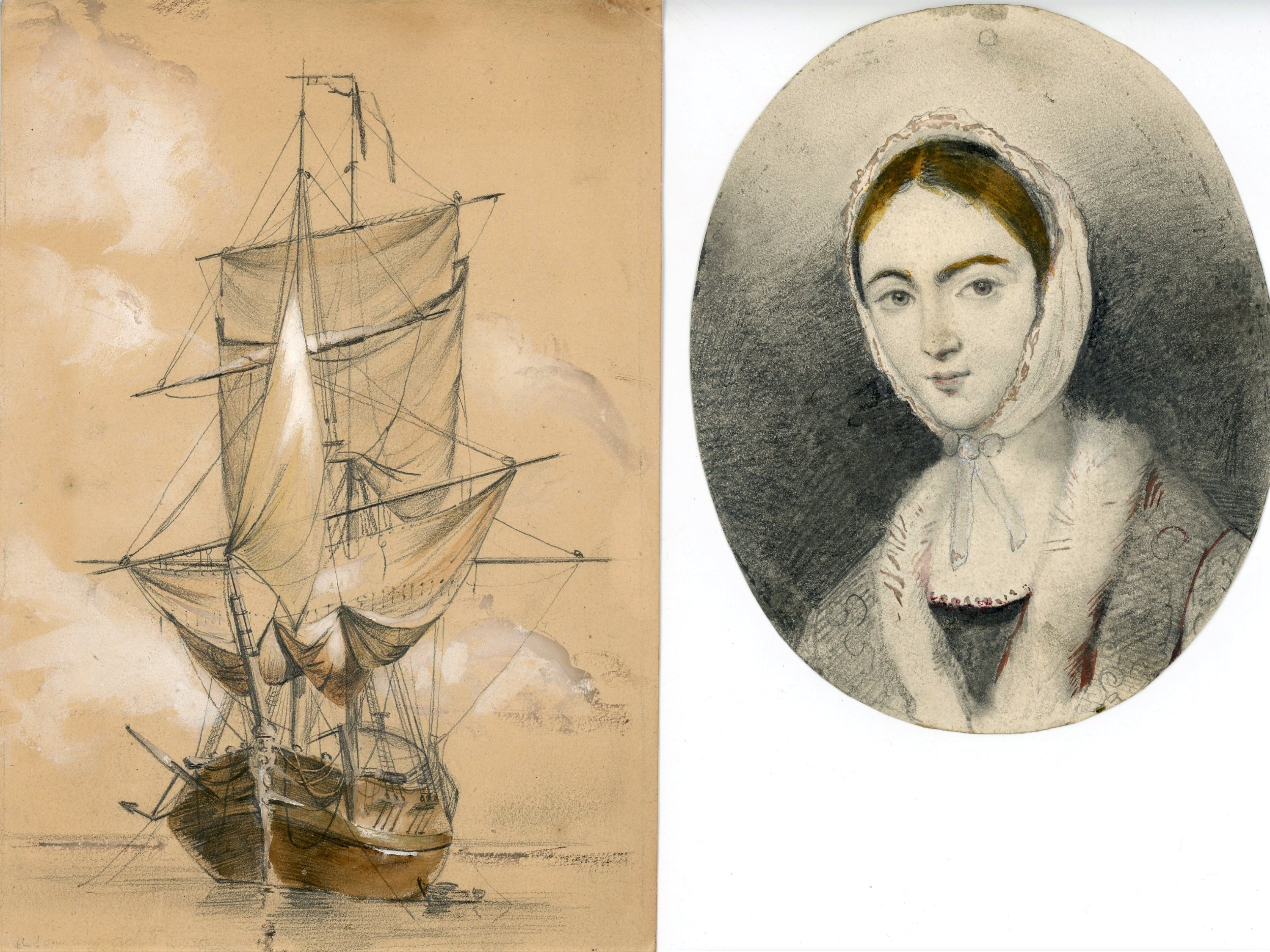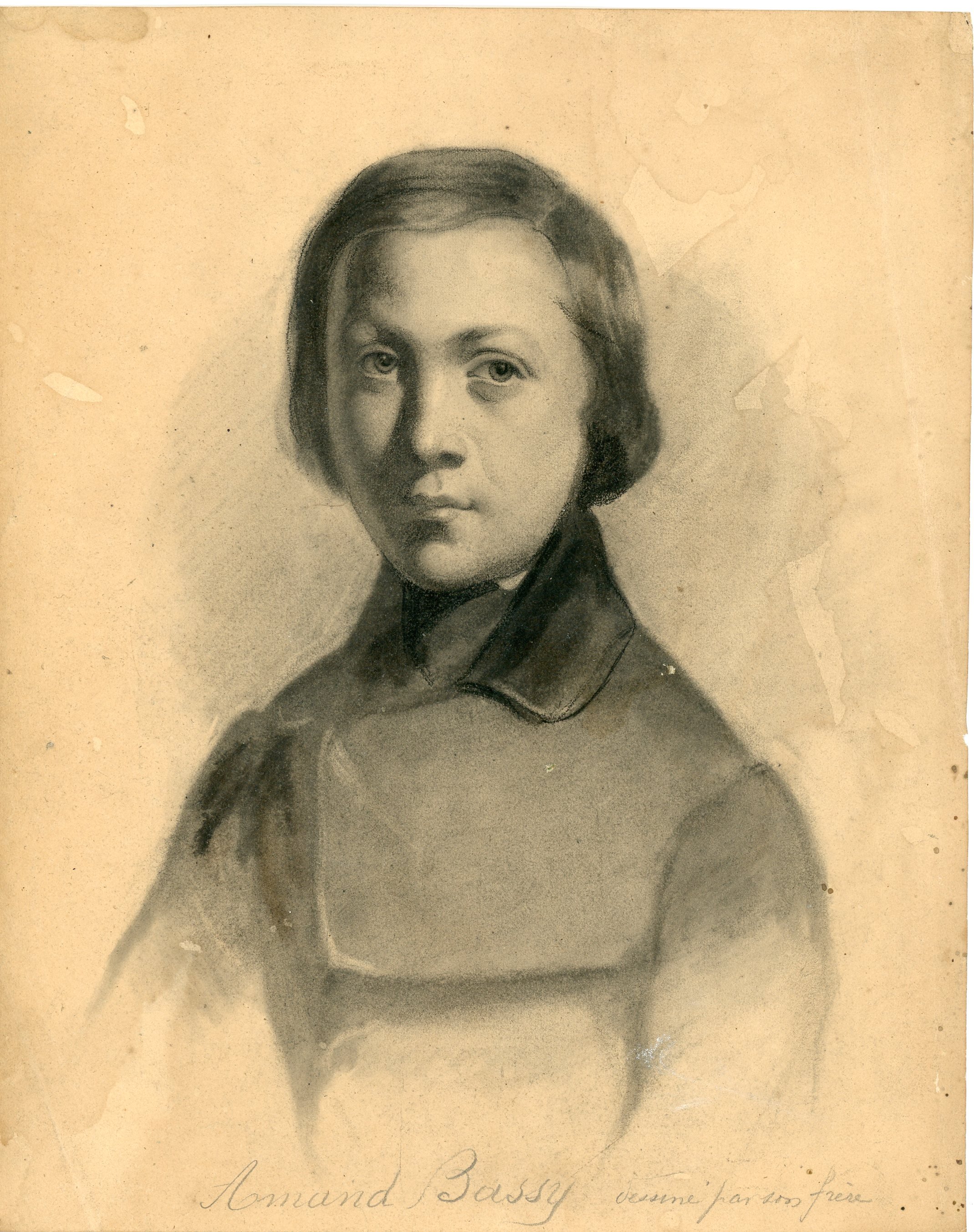 Dont 12 dessins au crayon, aquarelle et gouache par Achille BASSY, milieu XIXe et portrait de jeune fille (attribué à Gavarni ?, mention manuscrite au dos : « donné par Chevalier 31 août 1859 »).