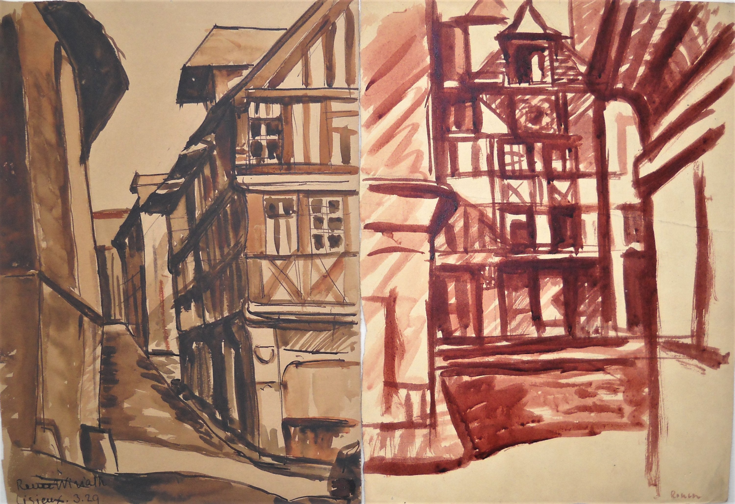 Rue à Lisieux, lavis, datée mars 1929 et signée. Haut. 33, Larg. 23 cm.