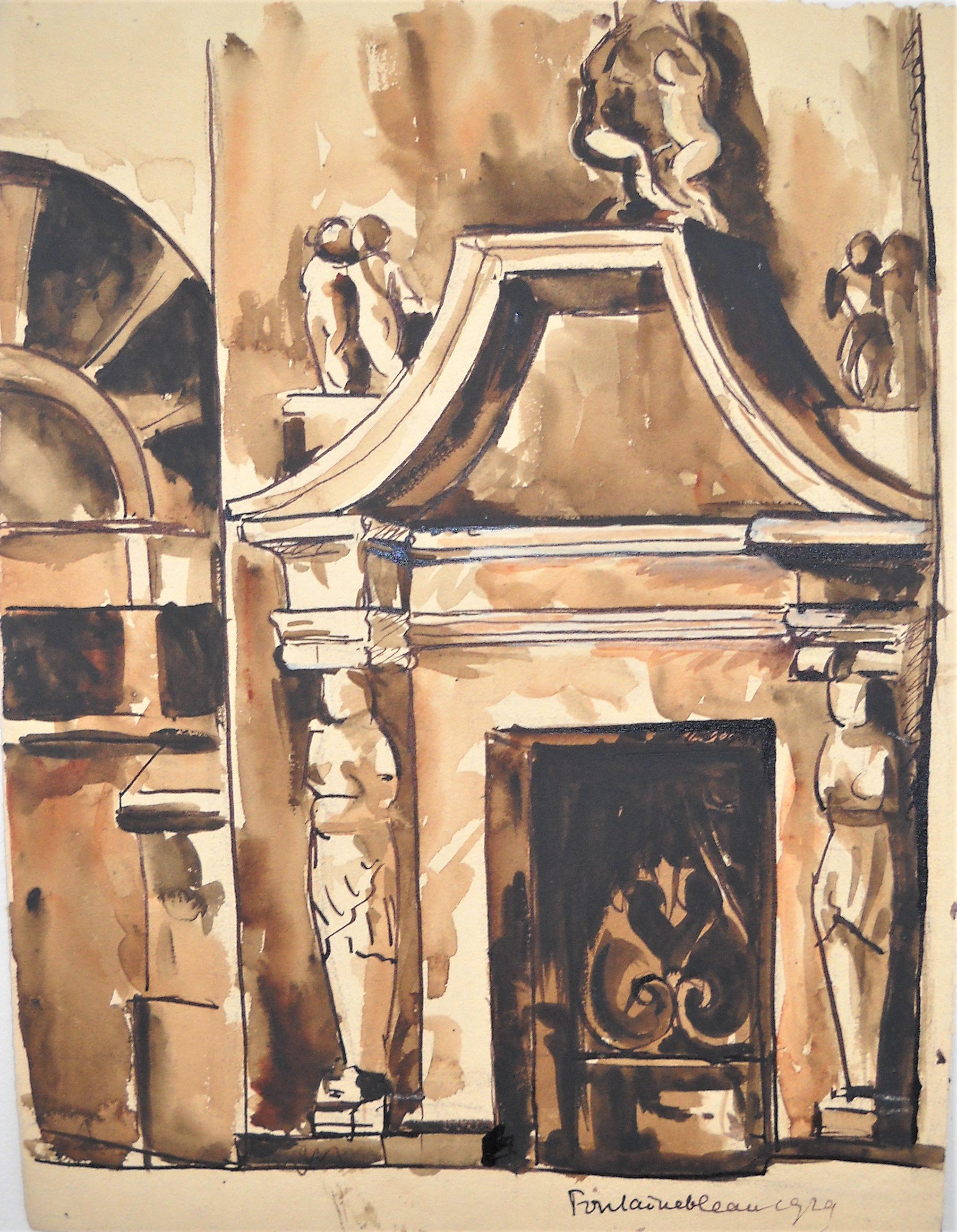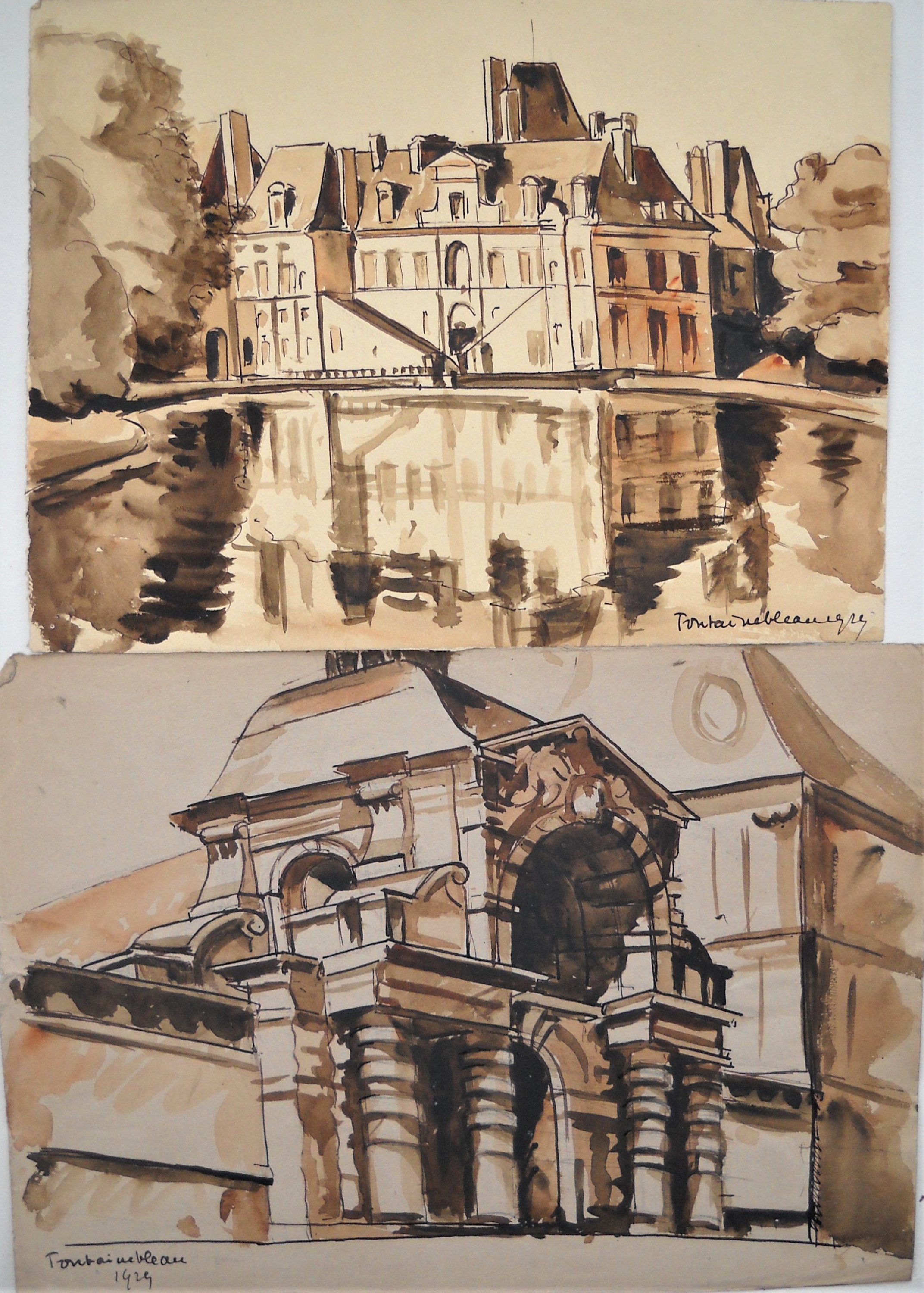 3 vues du château de Fontainebleau, lavis, datées 1929. Haut. 25, Larg. 34 cm.