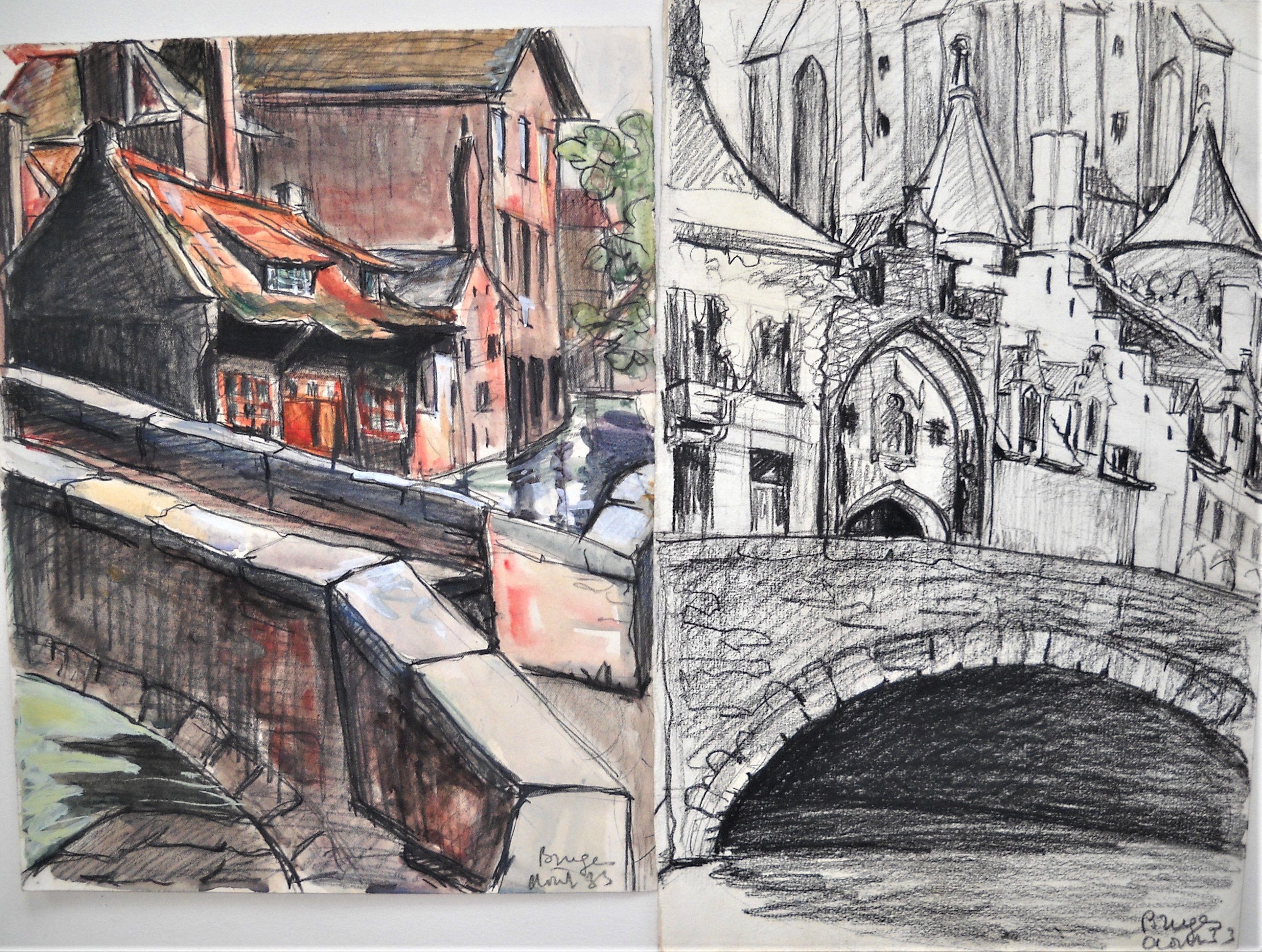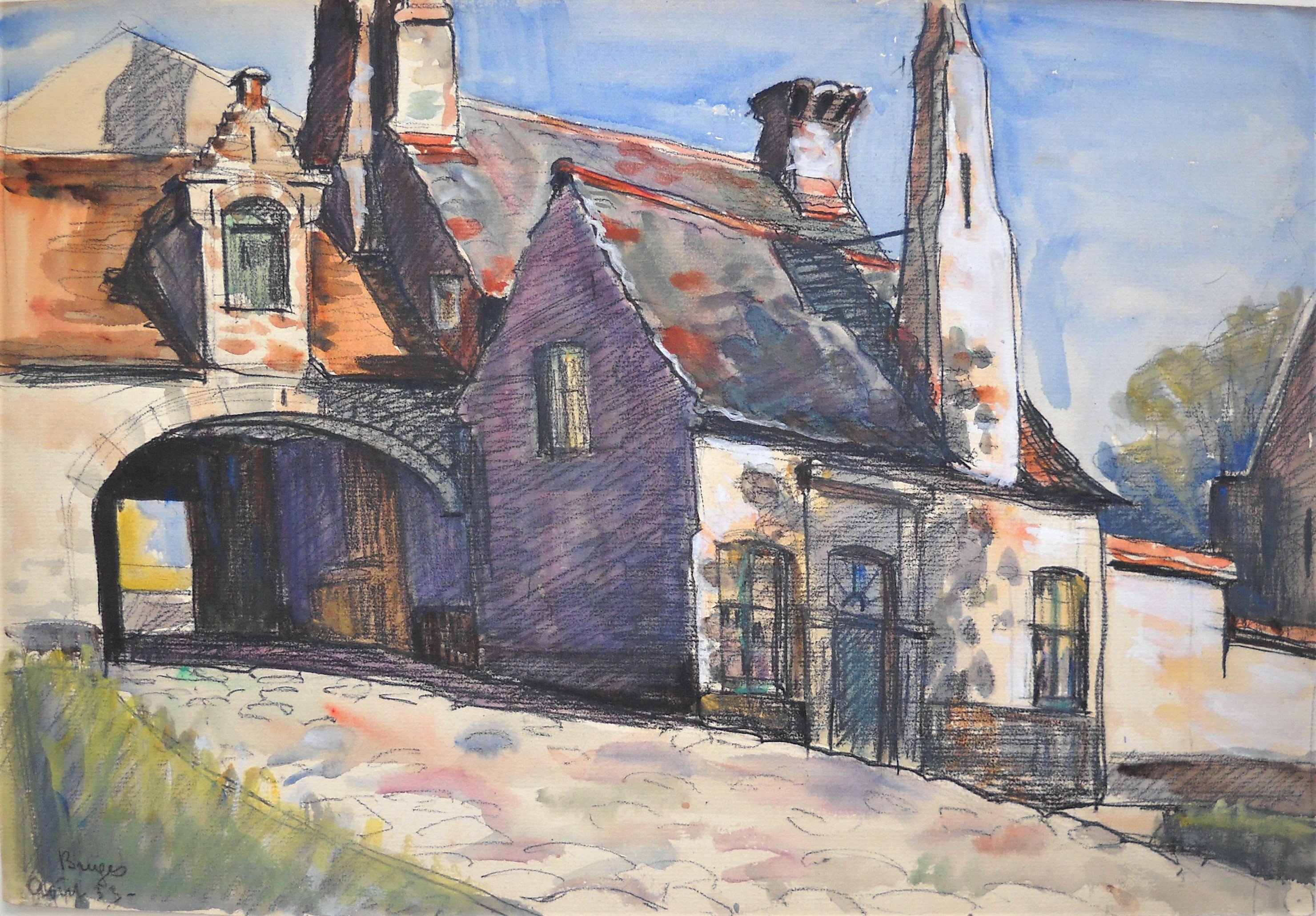 4 vues de Bruges, aquarelle et fusain, datées « Août 33 » et signées. Haut. 32, Larg. 47 cm pour la plus grande.