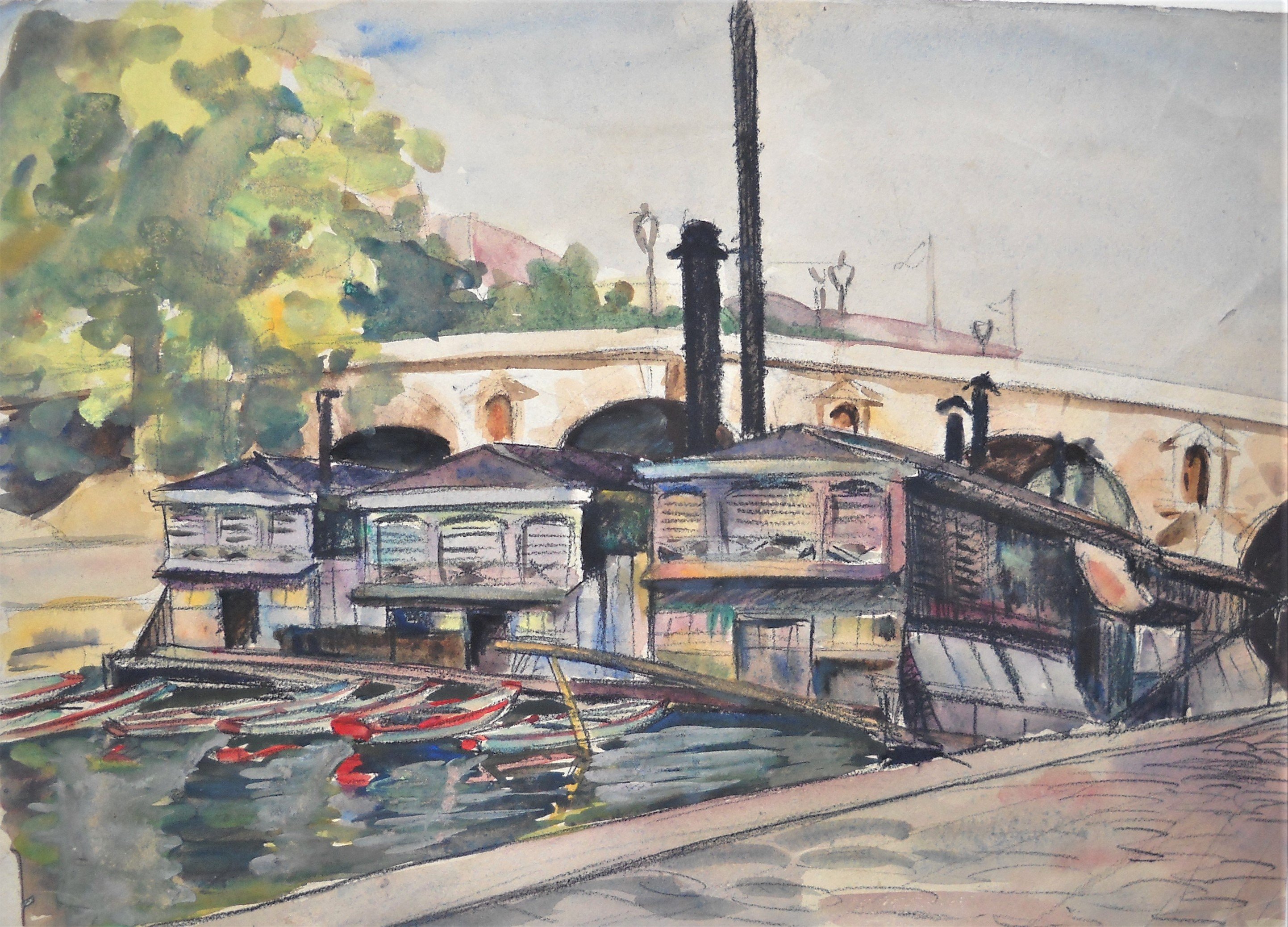 Les bateaux lavoirs, aquarelle et fusain. Haut. 27, Larg. 37 cm.
