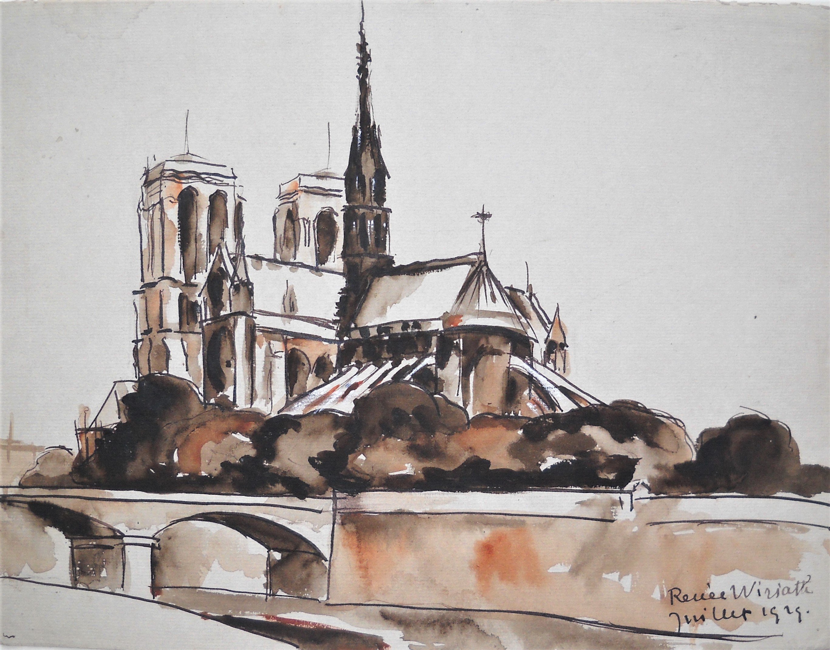 Notre-Dame de Paris, lavis, signée et datée en bas à droite. Haut. 24, Larg. 31 cm.