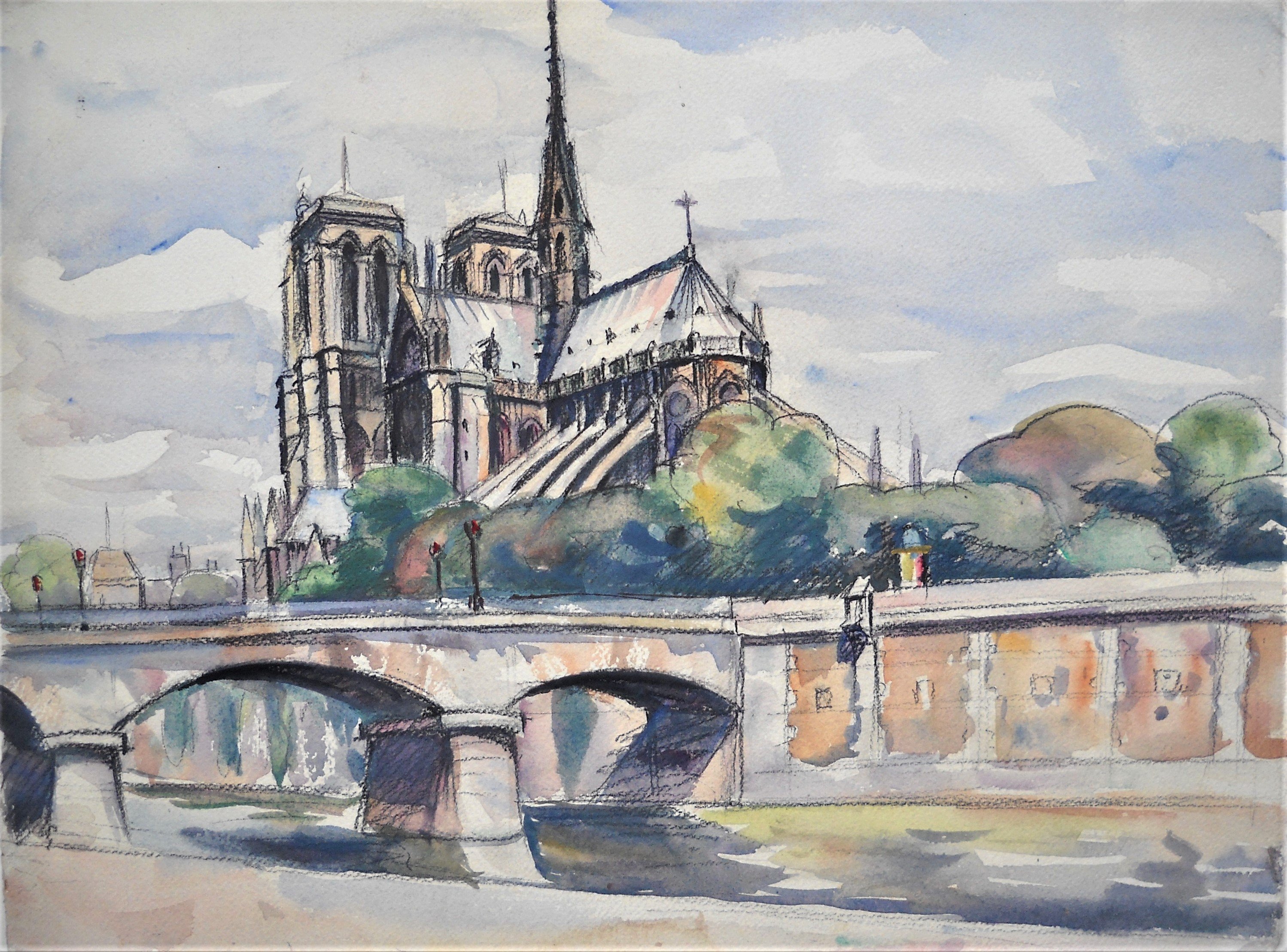 Notre-Dame de Paris, aquarelle et fusain. Haut. 29, Larg. 38 cm.