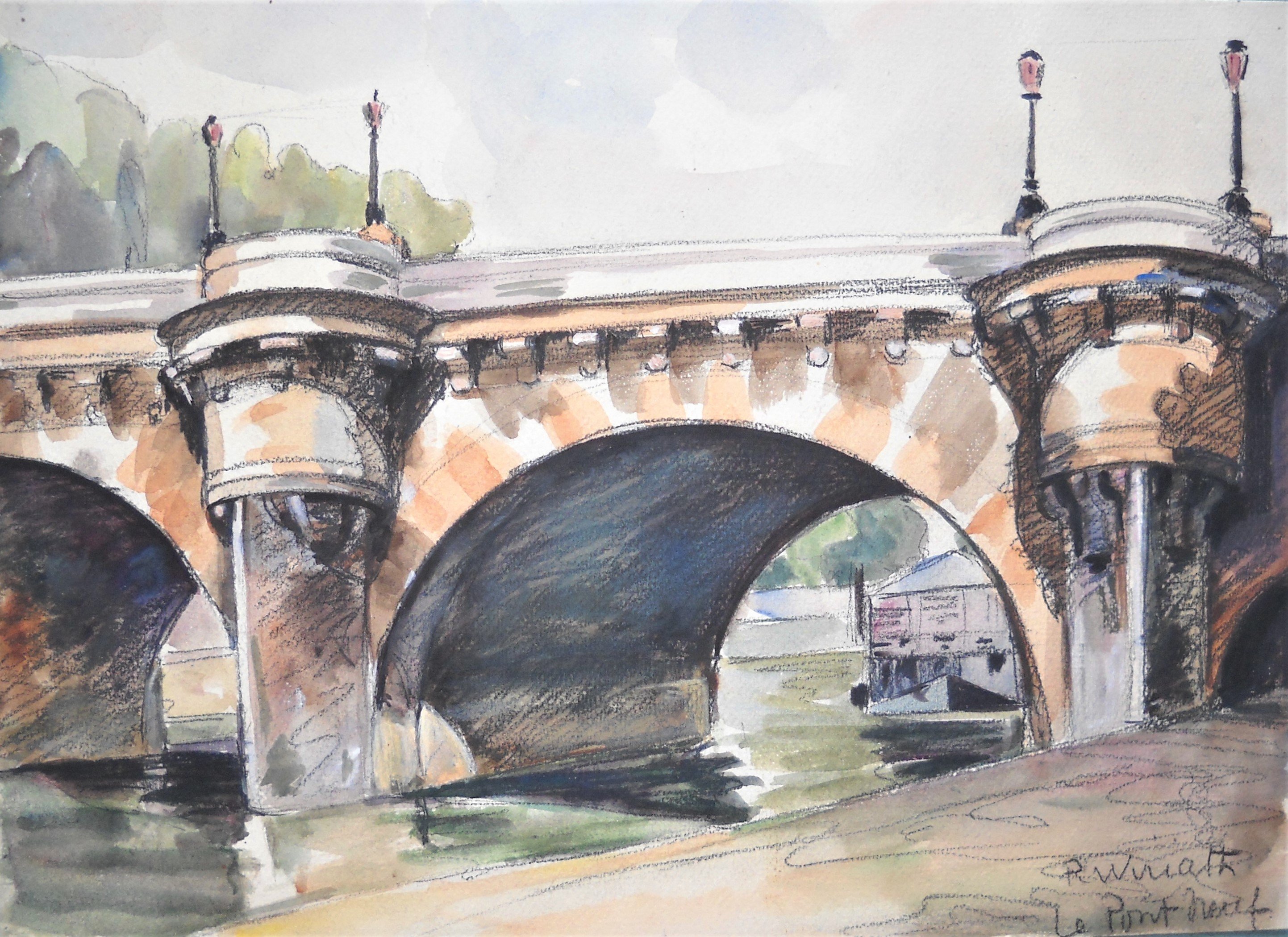 Le Pont Neuf, aquarelle et fusain, signée en bas à droite. Haut. 27, Larg. 37 cm.