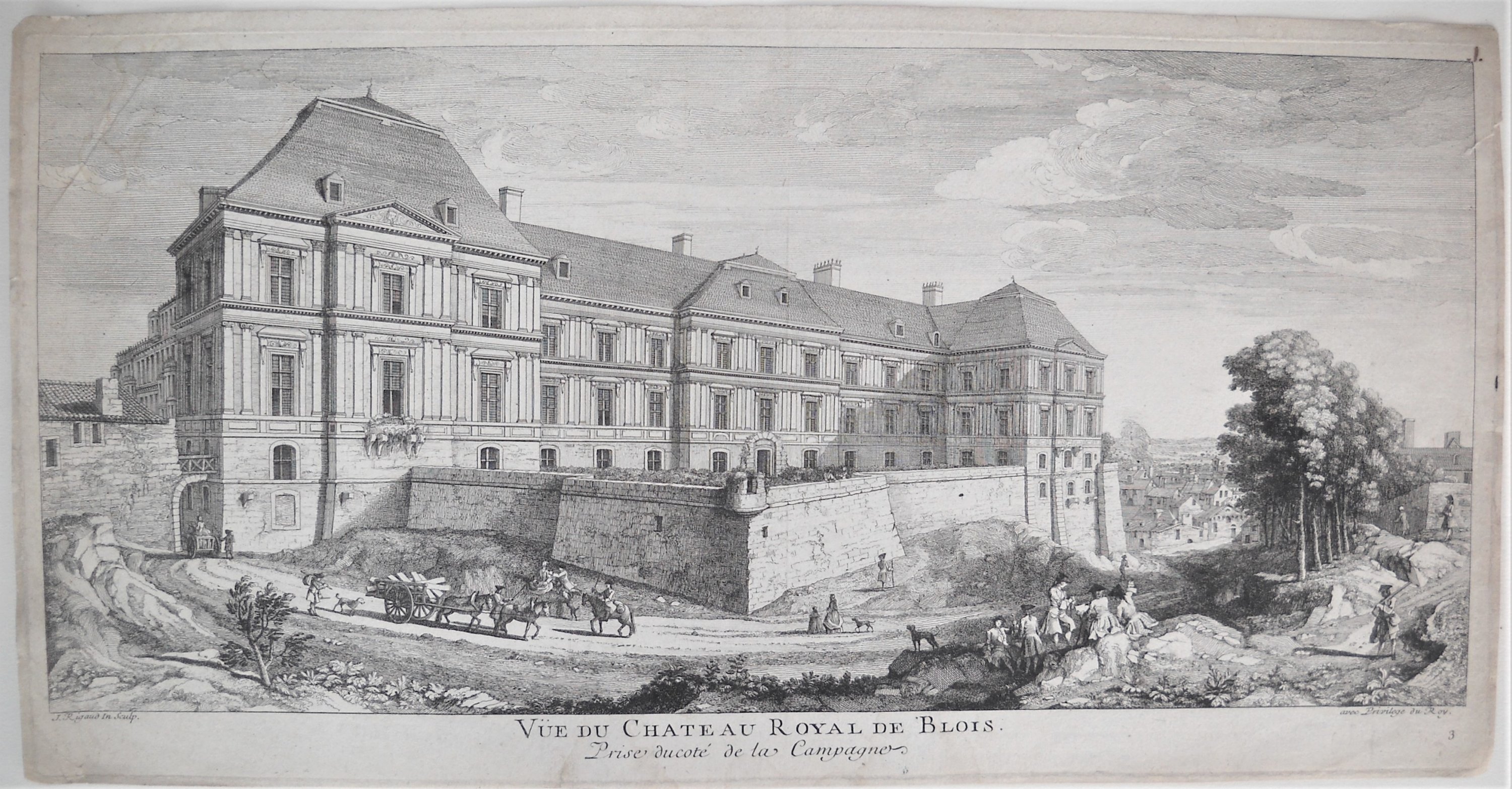 Réunion de + de 25 estampes, XVIIIe au XXe siècle, dont « Vue du château royal de Blois, prise du côté de la campagne », par Jacques RIGAUD (1680-1754), 24,5 x 48,5 cm (petits accidents).
