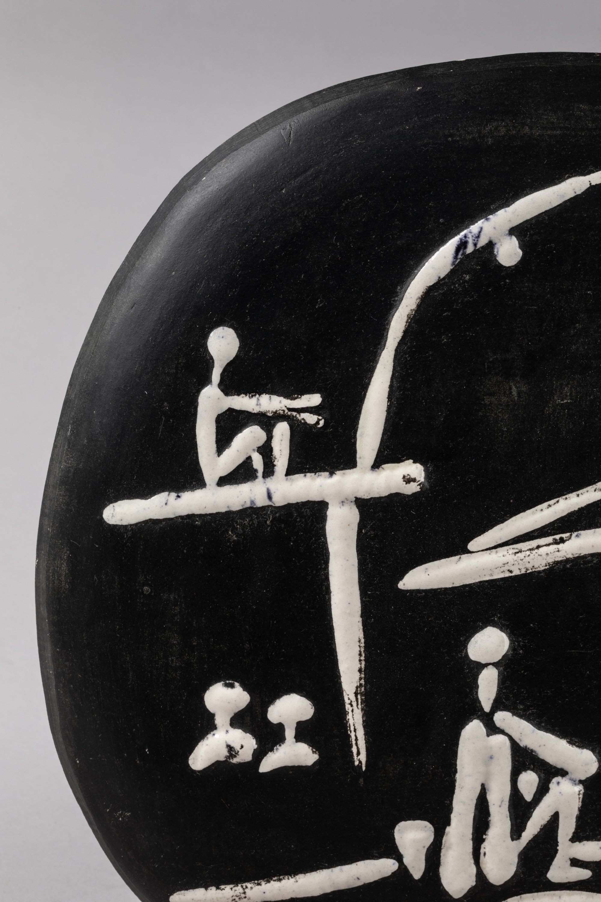 Plaque bombée en terre de faïence blanche. Décor blanc sous fond noir.