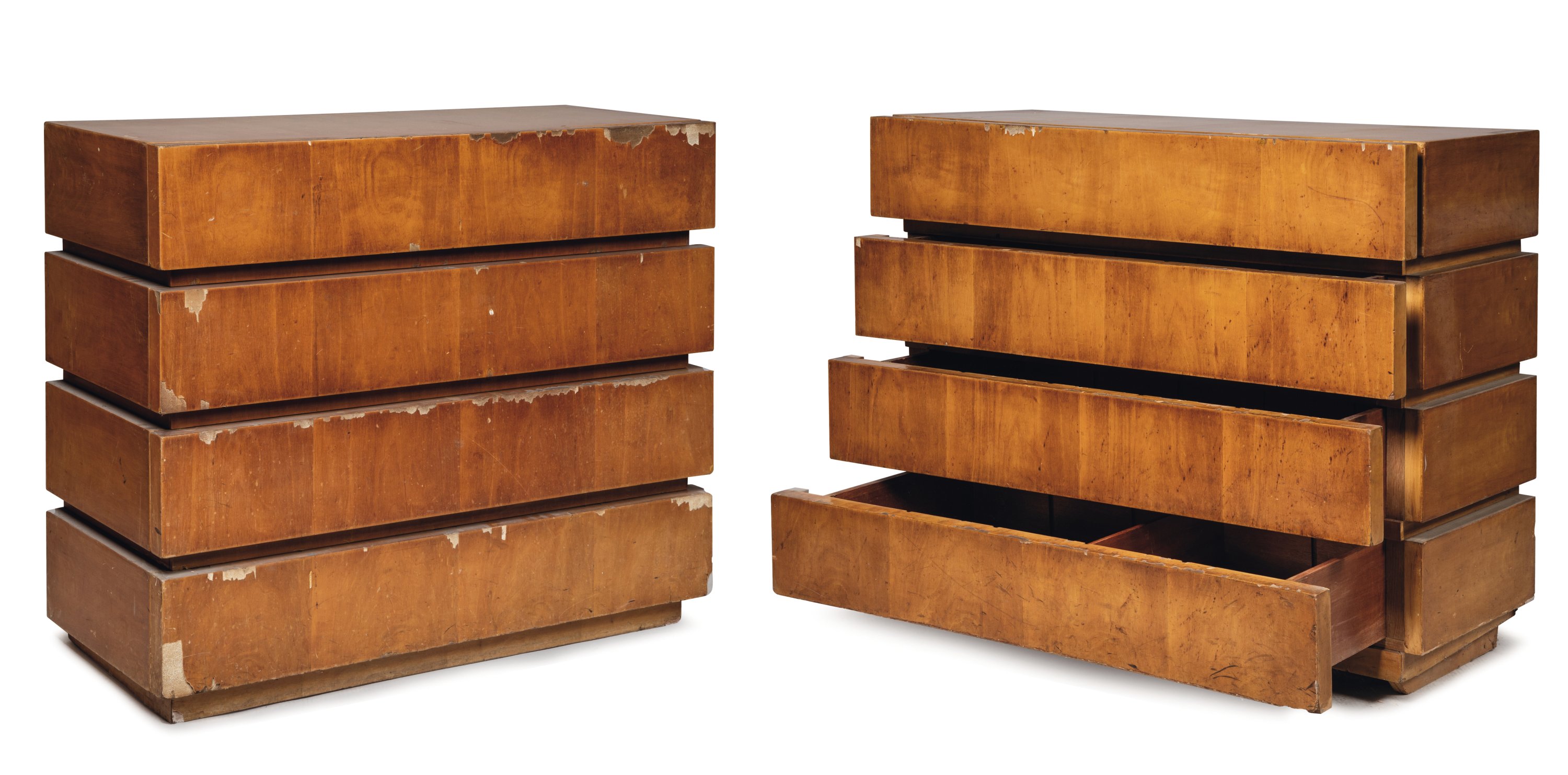 Dans cet appartement de l’avenue Pierre Ier de Serbie, chaque meuble du décorateur apparaît à sa place, sur mesure, pour l’entrée, le bureau, la chambre ou l’un des deux salons. Imaginés avant-guerre, notre armoire et ces commodes étaient destinés à garnir la chambre du couple Bensaude. Le choix du sycomore, un érable géant, pour cette pièce intime est un aussi un symbole d’élévation spirituelle. Devenu veuf prématurément, le docteur Bensaude se remarie et déménage avenue Bugeaud à Paris. Sauvegardé pendant la guerre, l’ensemble est progressivement dispersé. On retrouve certains artefacts sur le marché, à l’instar d’une armoire présentée par la galerie Jacques Lacoste. Nos meubles ont été conservés, pour leur part, dans la descendance du docteur Bensaude.
