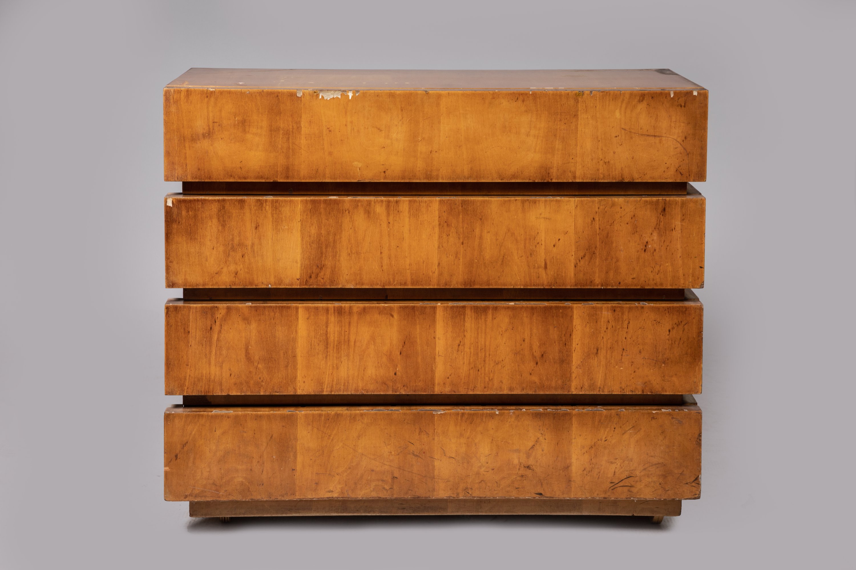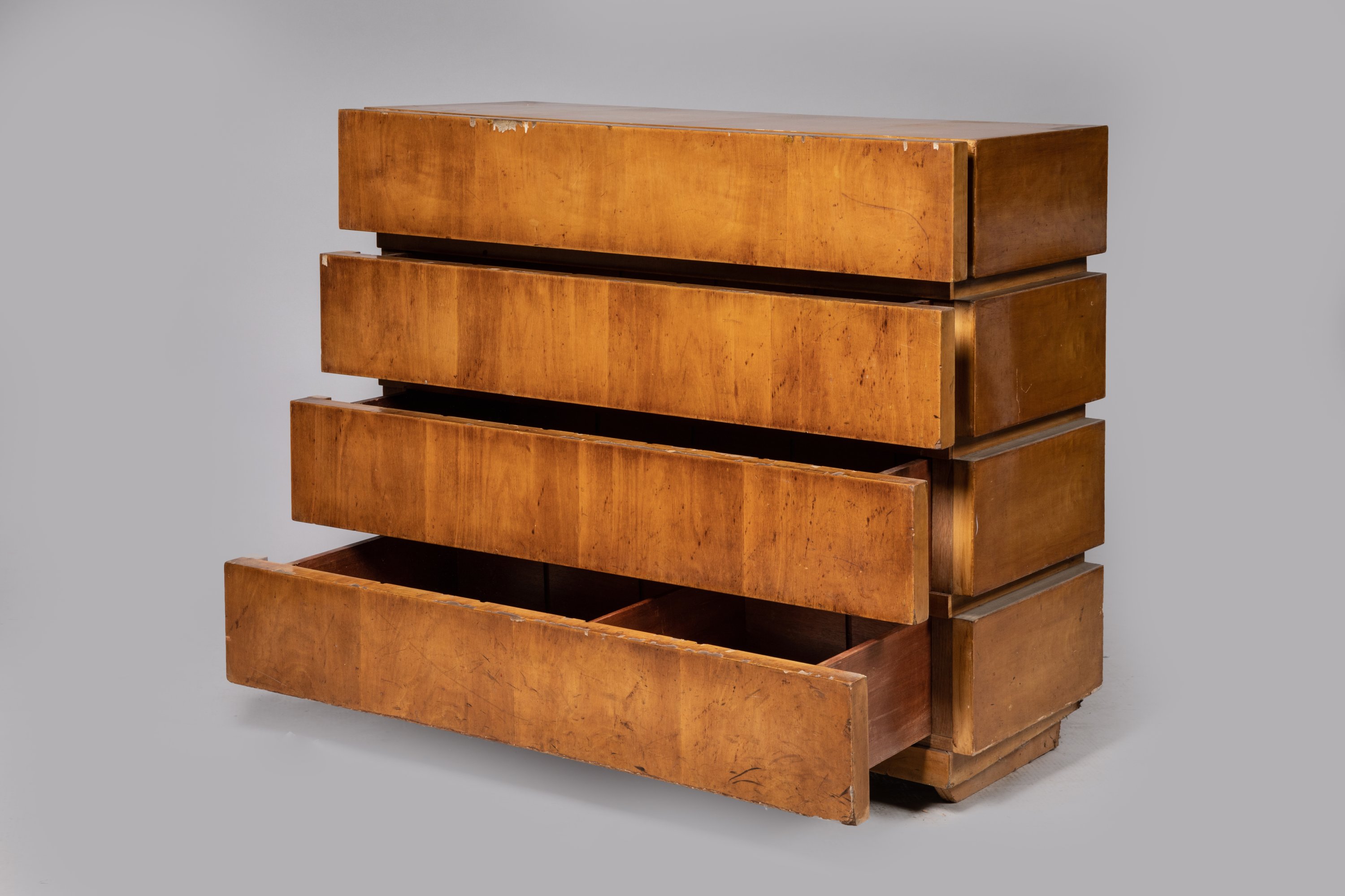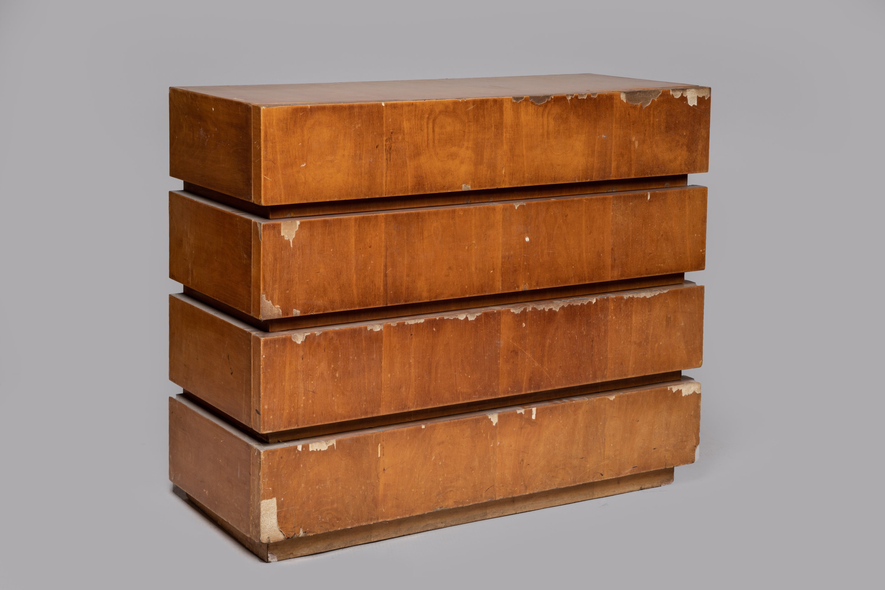 En placage de sycomore. De forme rectangulaire, la surface constituée de quatre bandes en relief sur la façade et un côté, dévoilant quatre tiroirs.