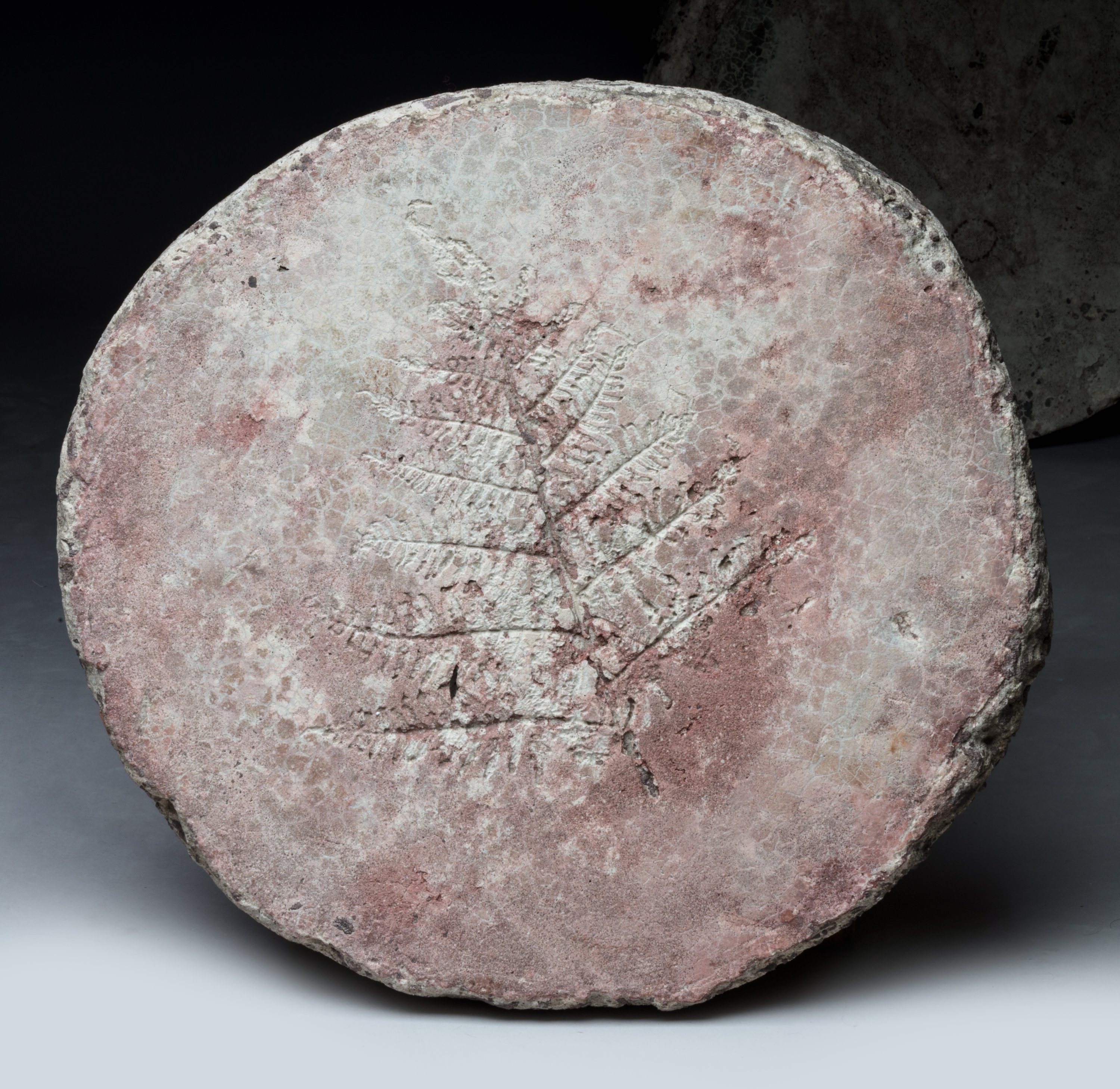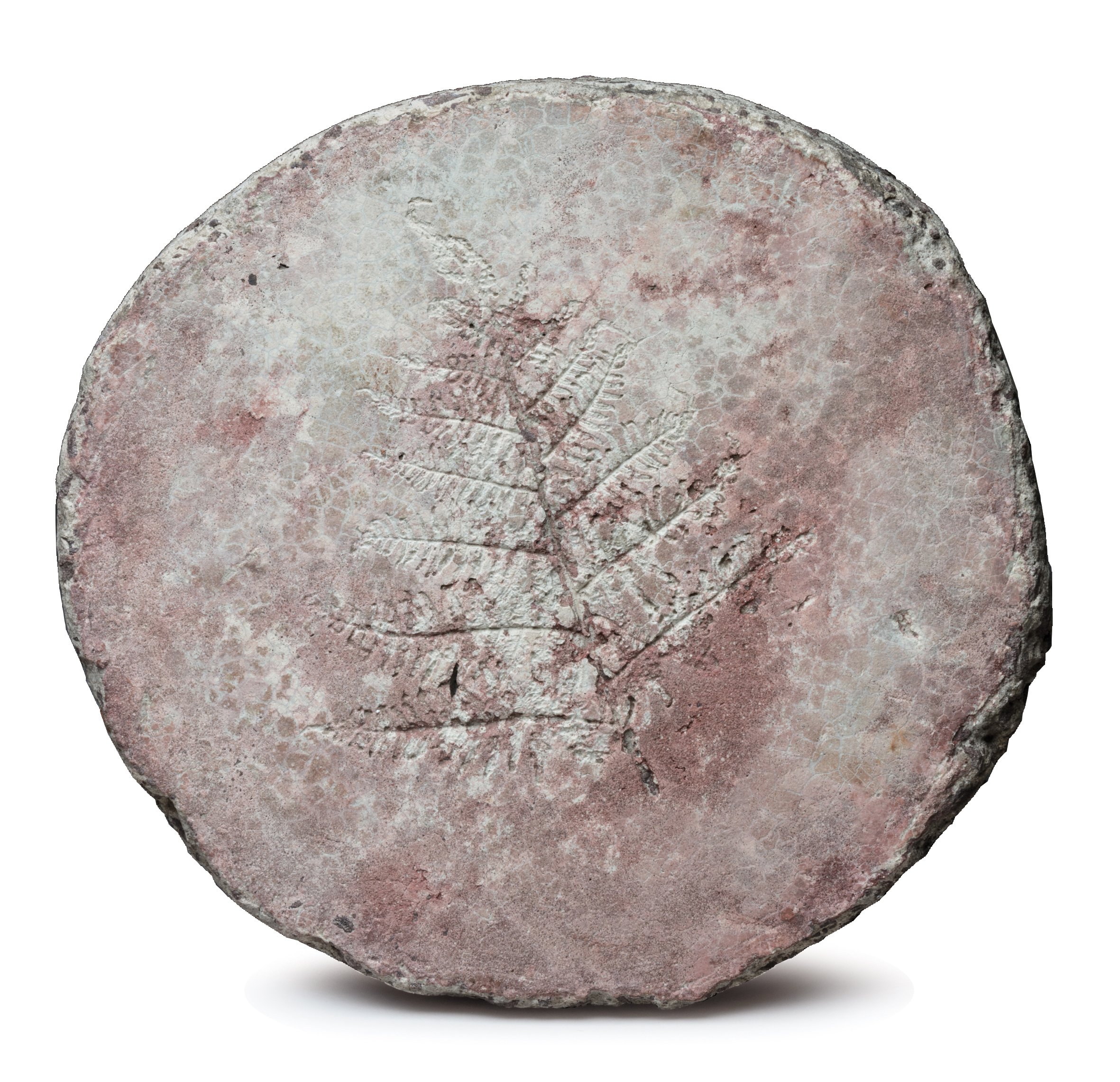 Pièce unique. Béton de forme libre, légèrement teinté rose, orné au centre d'une empreinte de feuille de fougère.