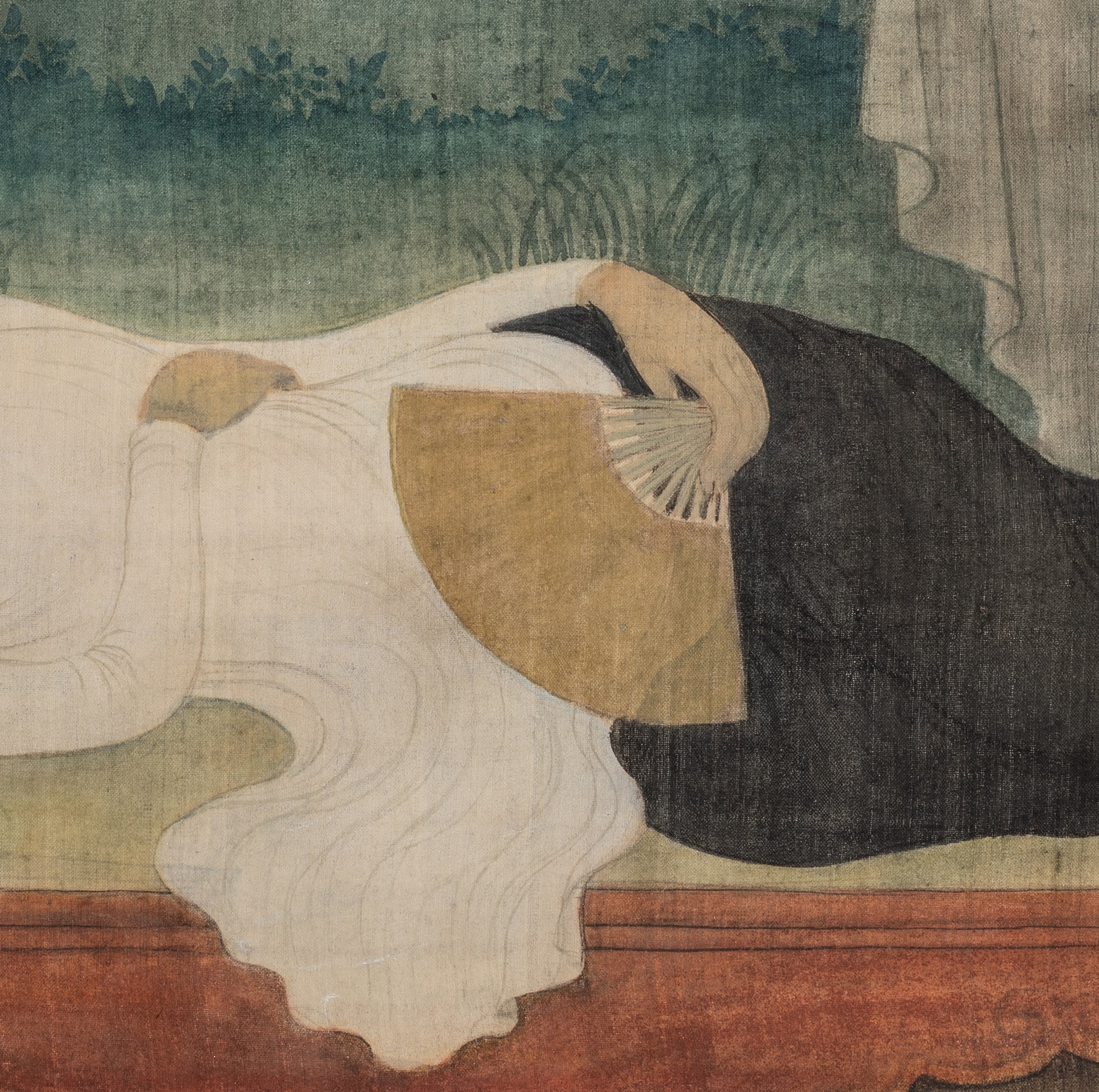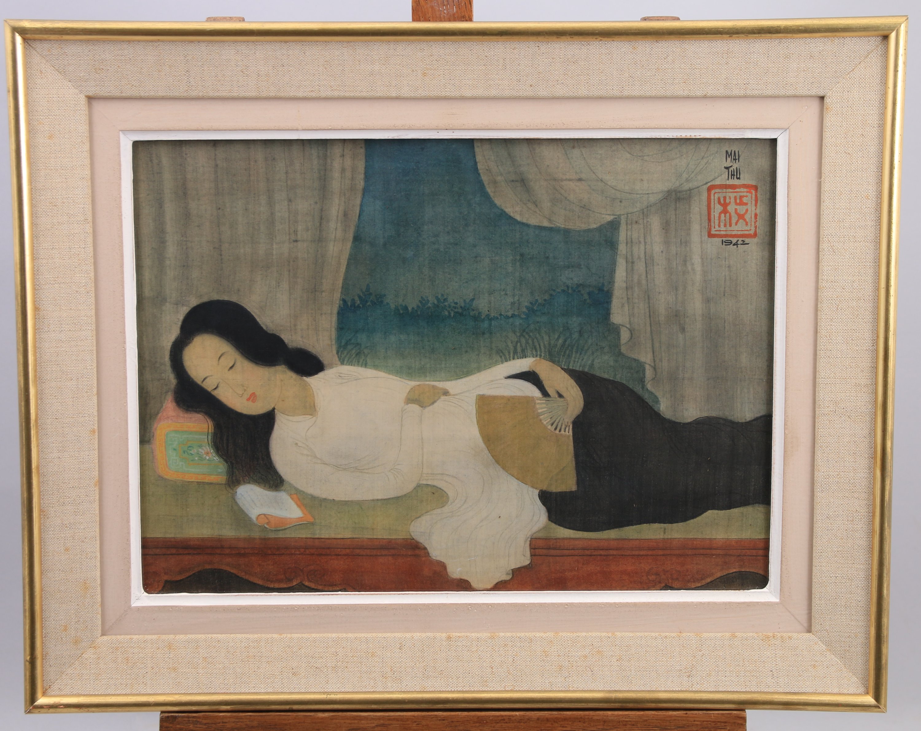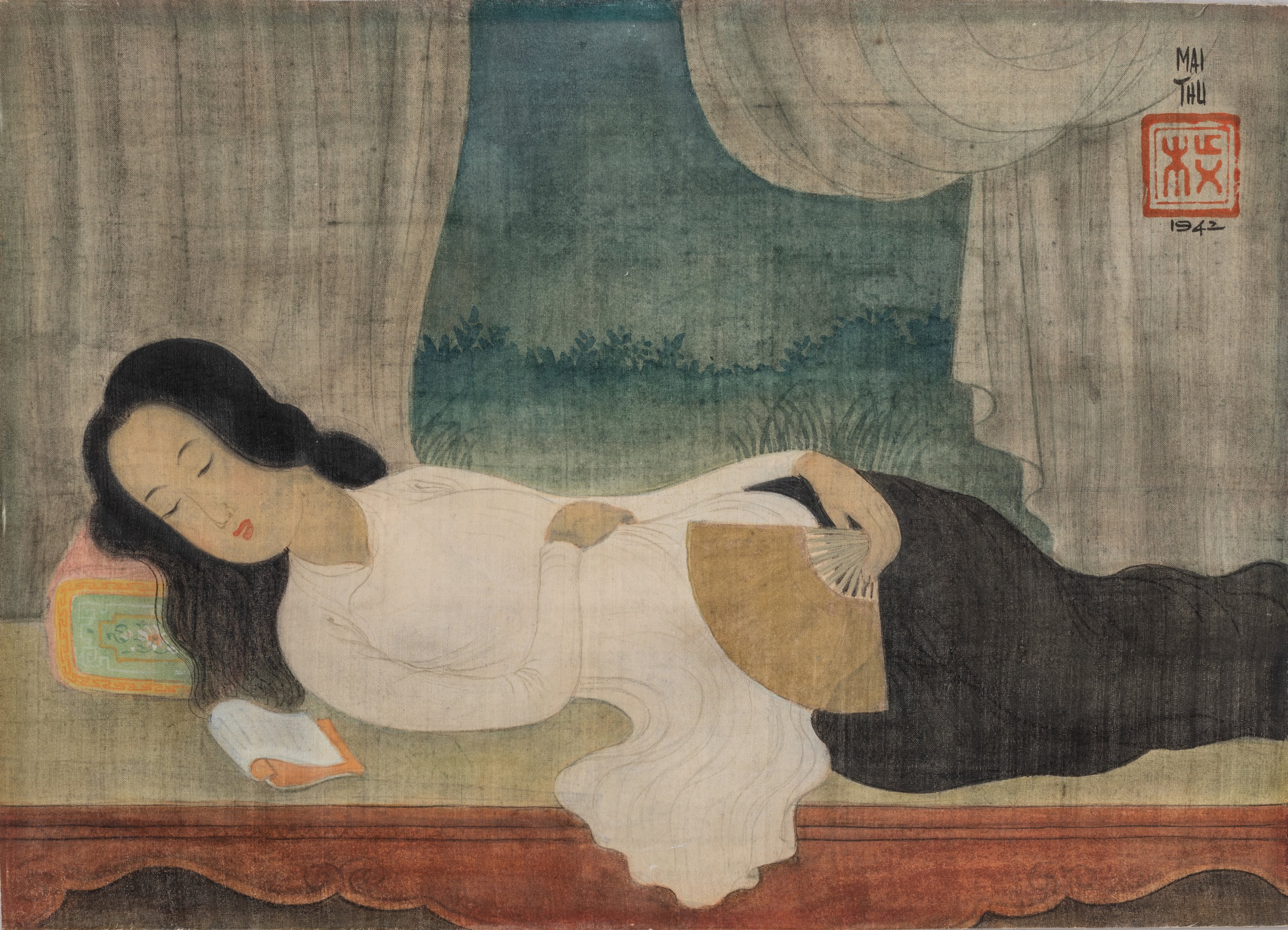 Réalisée dans cette année féconde de 1942 où Mai-Thu tout juste libéré s’engage dans une nouvelle aventure artistique, notre peinture sur soie représente une jeune femme vêtue d'une veste traditionnelle blanche, dite "ao dai", portée sur un pantalon noir. Les cheveux dénoués, elle est allongée sur un lit en bois sculpté et laqué rouge. Assoupie, elle tient un éventail alors qu'un livre retourné sur la page délaissée repose à ses côtés. Le peintre réalise ici la synthèse entre l'Orient et l'Occident, puisant son inspiration dans les Vénus européennes des 17e au 19e siècle, appliquée à la beauté retenue et idéalisée d'une jeune annamite. Le savant jeu de rideaux et de tentures de couleur à l'arrière plan conforte la mise en scène tout en laissant passer la douceur et les bruits de l'après-midi.
