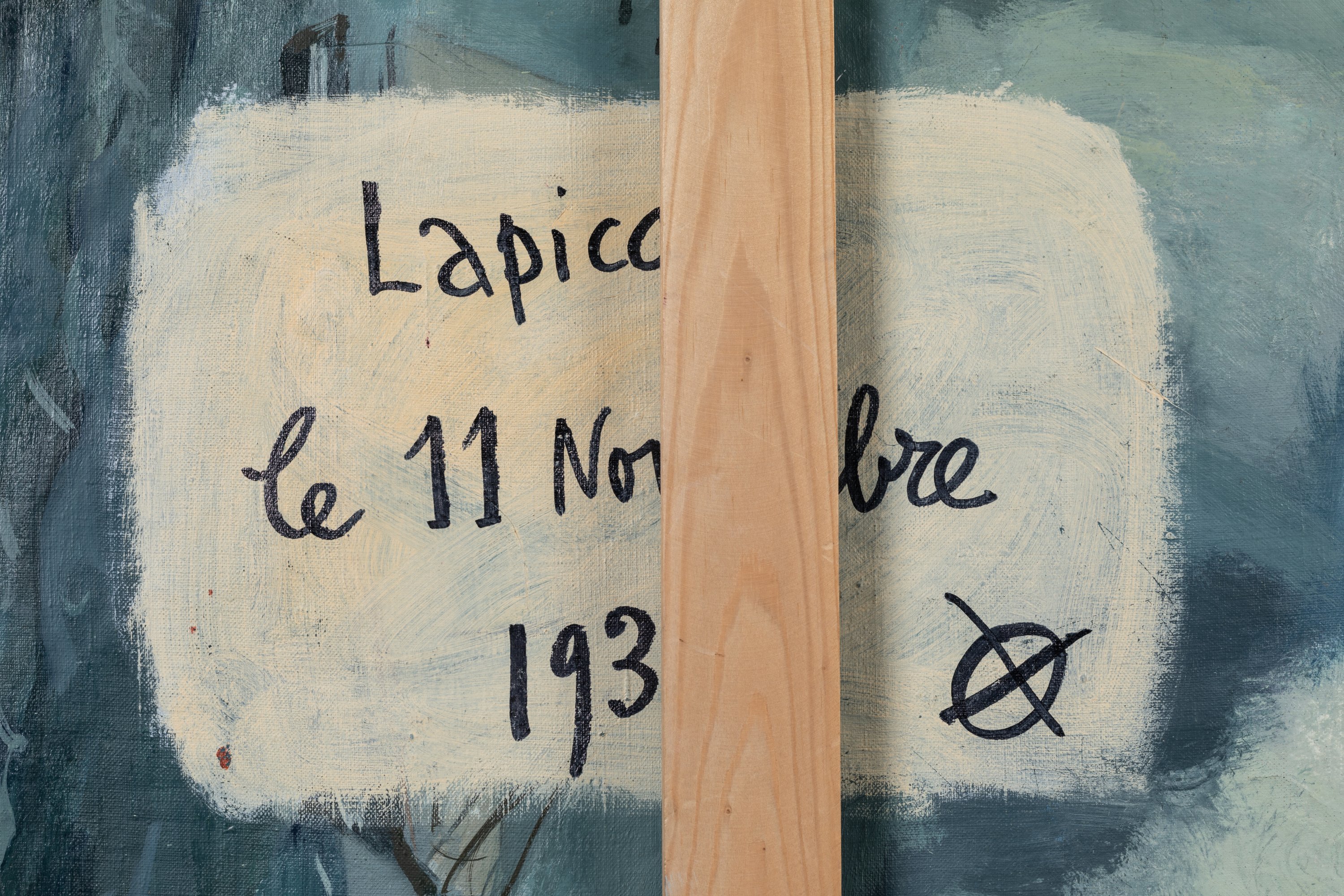 Cette toile historique figure parmi les premiers chefs duvre de lartiste. Représentation singulière et bicolore, elle sinscrit à contre-courant dune partie de sa production future. Pourtant, on y trouve déjà linspiration précolombienne de la figure, plus proche dun masque de Teotihuacan que dune gueule cassée. Les couleurs complémentaires sy trouvent opposées et réduites au statu quo par le contour