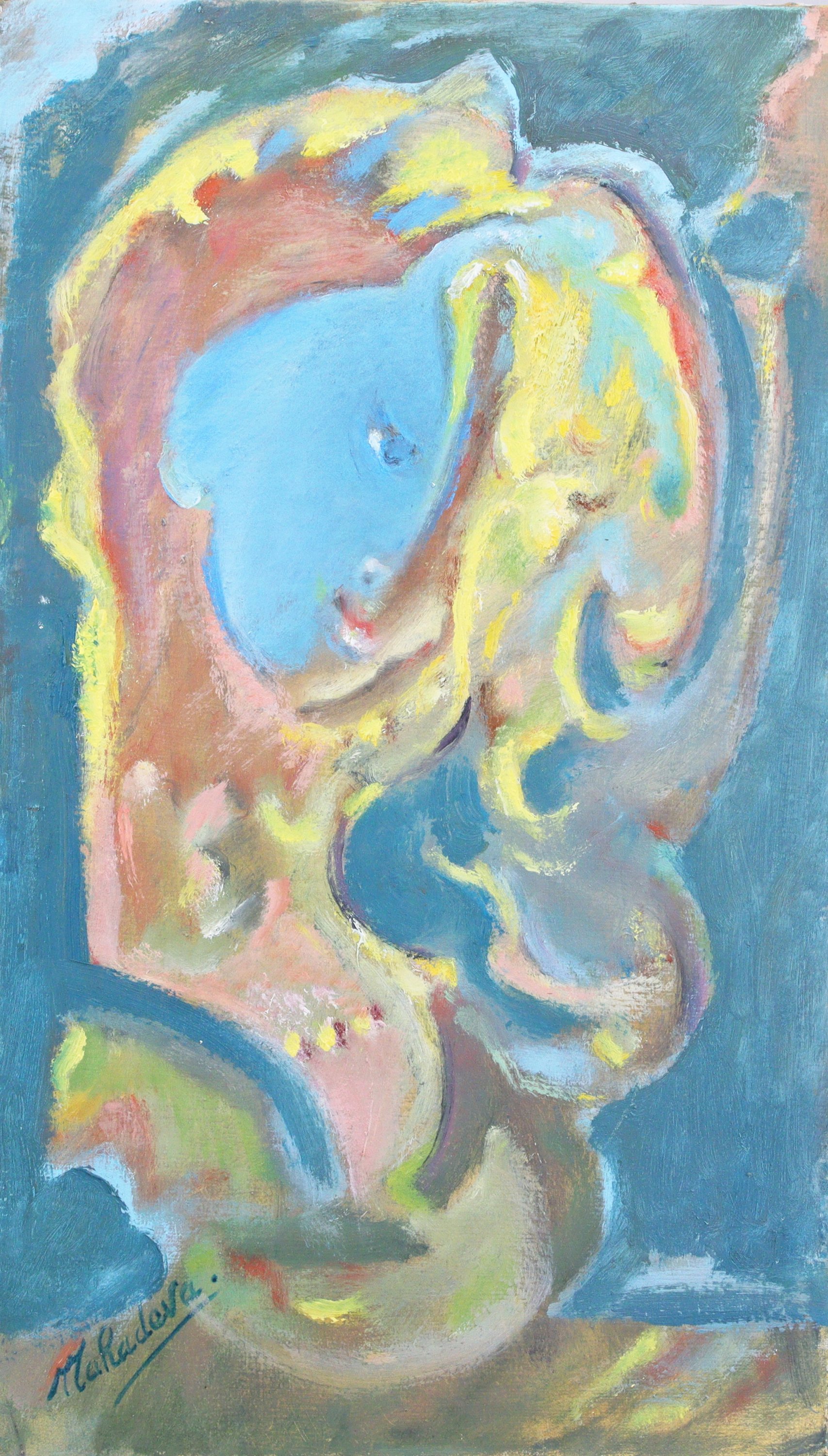 Peint pendant le confinement, ce visage de femme à la peau bleue, comme une nouvelle Avatar, exprime la douceur retenue d'une énergie tellurique à la force insoupçonnée. Ancien élève de l'école des Beaux Art de Paris, Patrick Dumont prend, au tournant de l'an 2000, le nom d'artiste de Mahadeva, signifiant "Le grand divin" en sanskrit. Conservé dans de prestigieuses collections privées, il est aussi exposé à Pont-à-Mousson et à l'hôtel Matignon (La naissance du poulain).