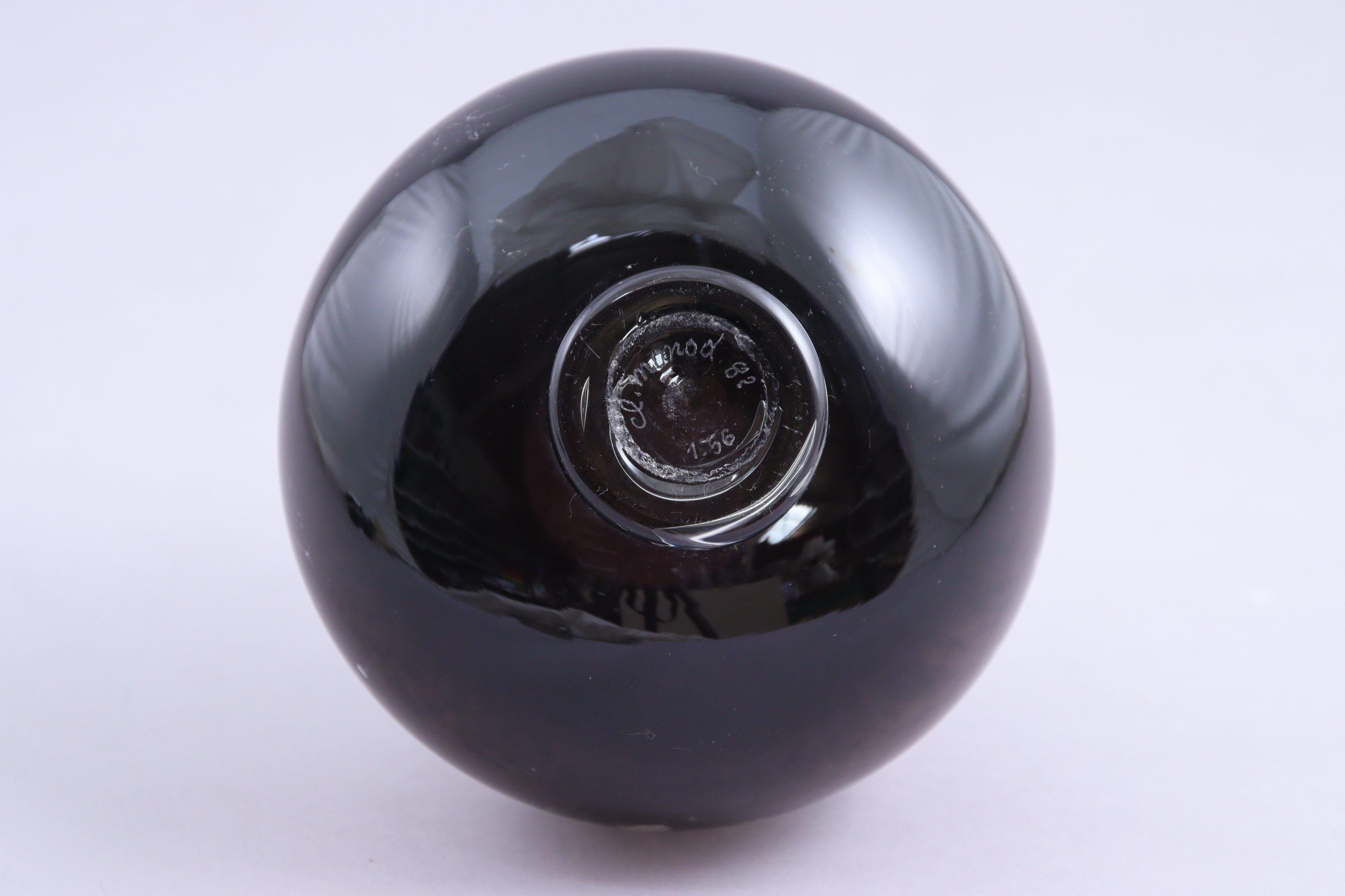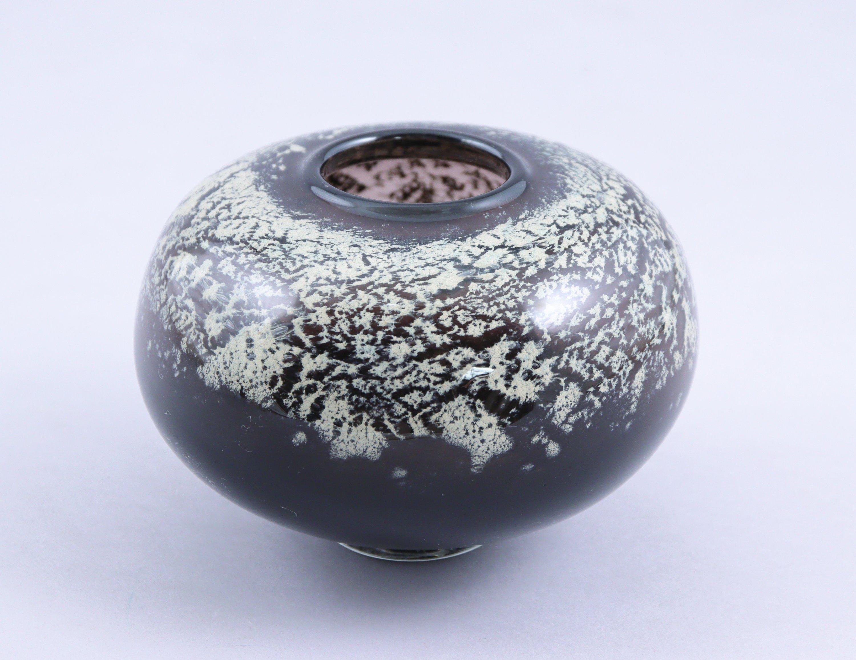 Verre de forme aplatie à fond noir avec décor tigré blanc et vert.