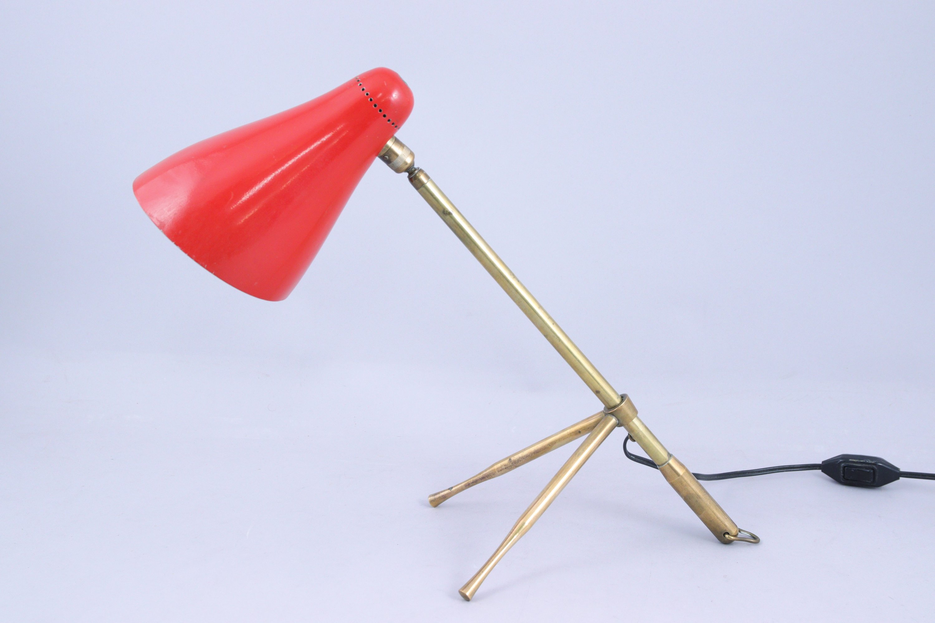Tube en laiton, abat-jour piriforme à perforations, laqué rouge intérieur blanc.