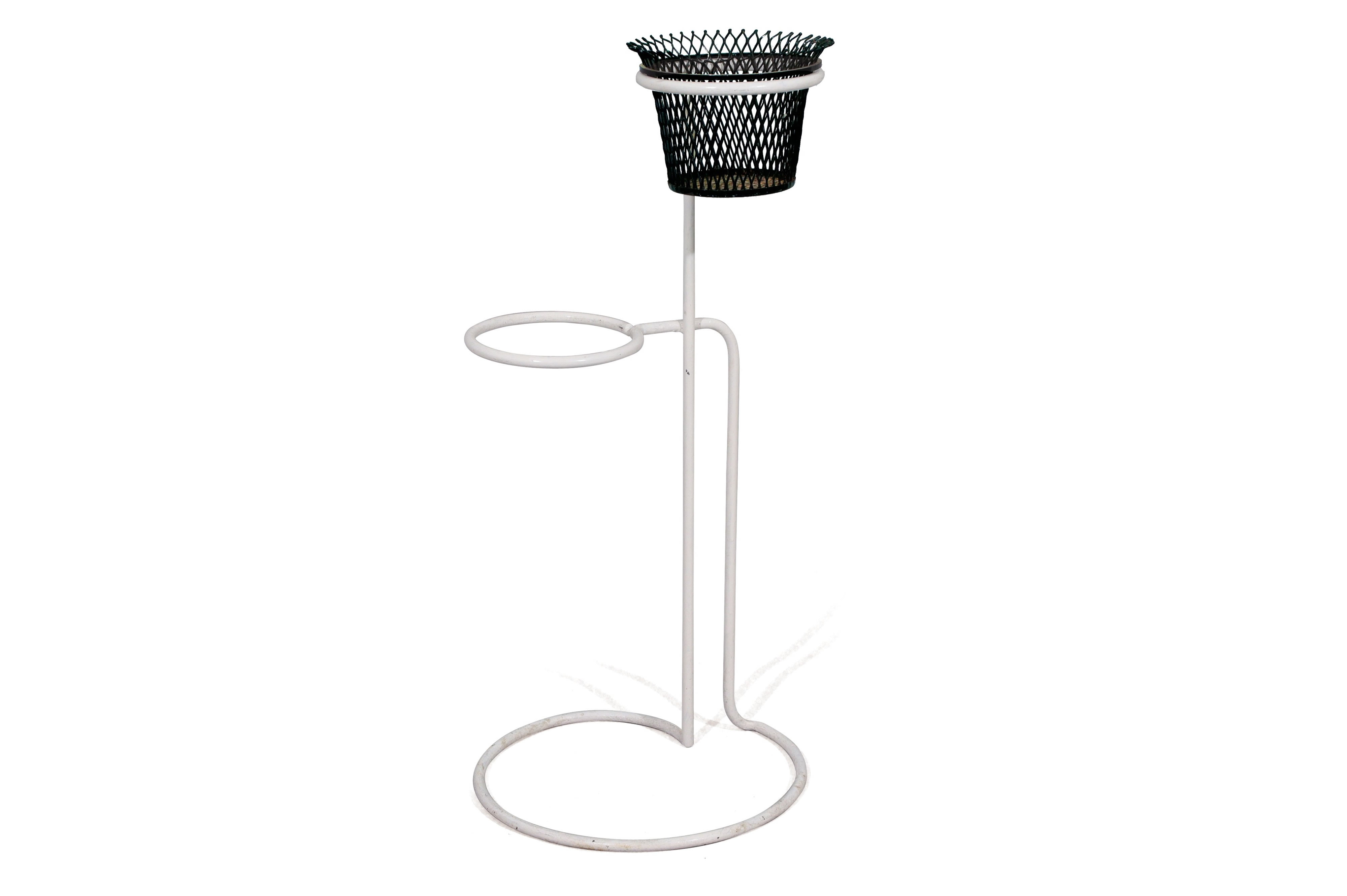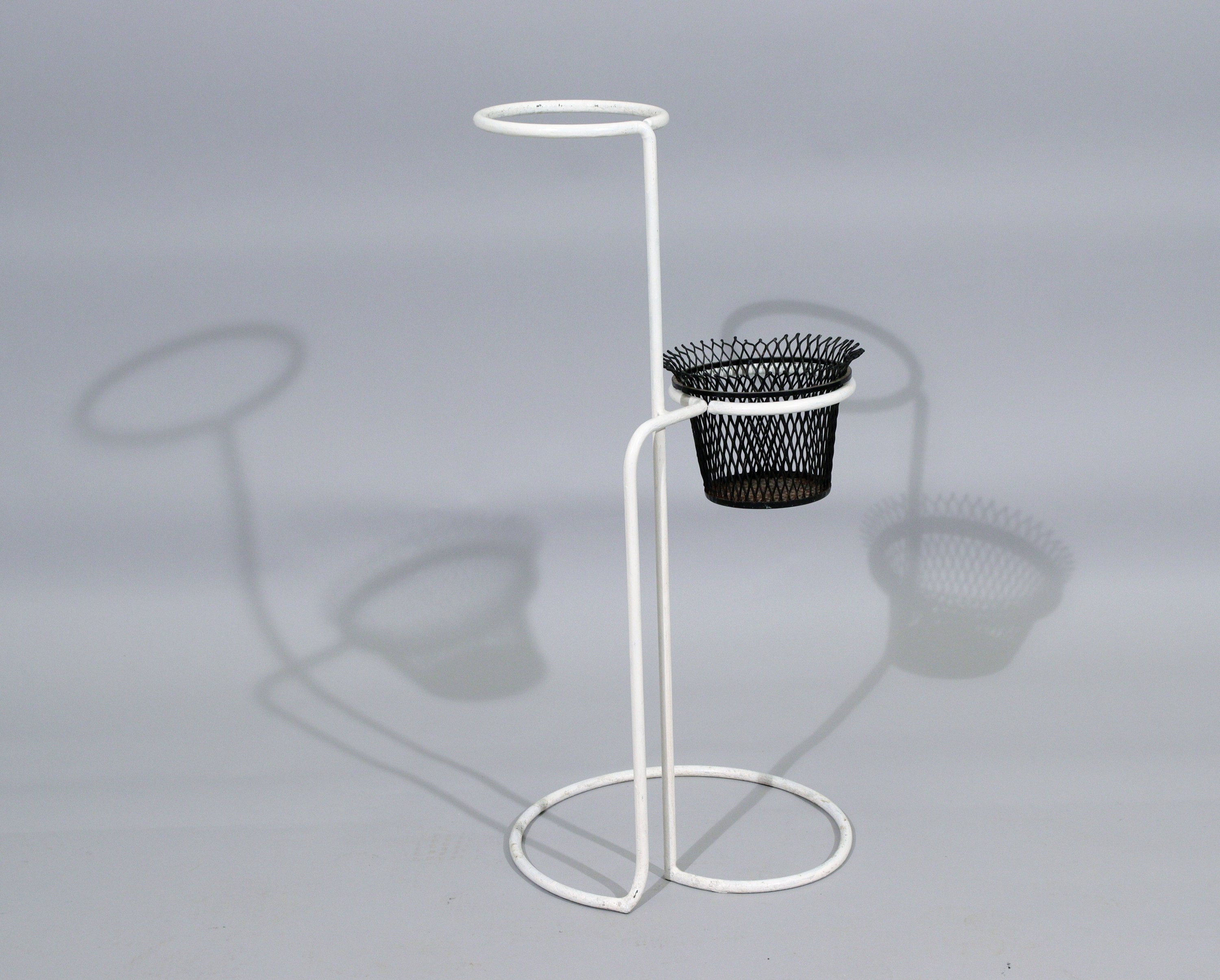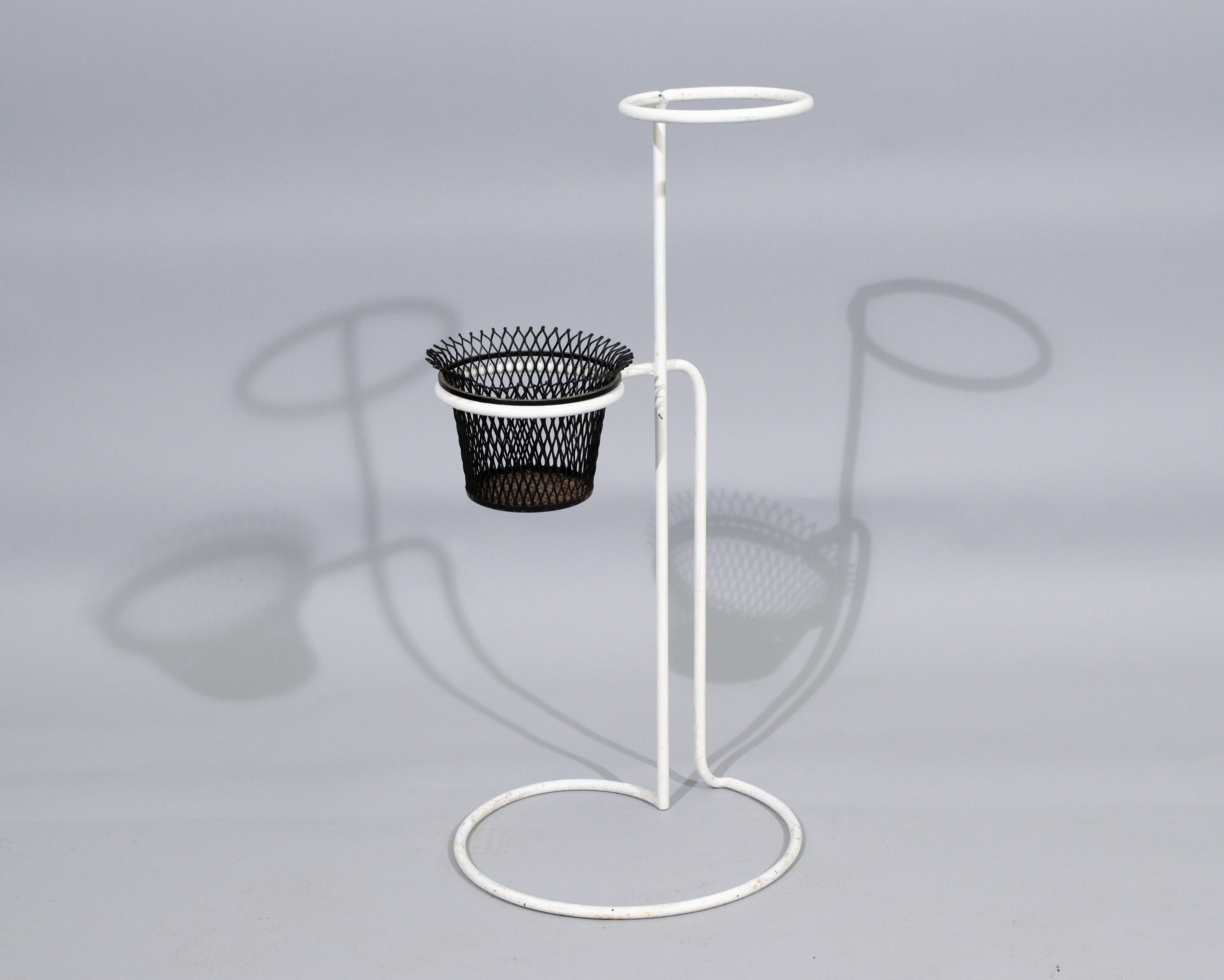 Résille métallique noire et support en métal teinté blanc. Le cachet pot et le support probablement d'éditions différentes.