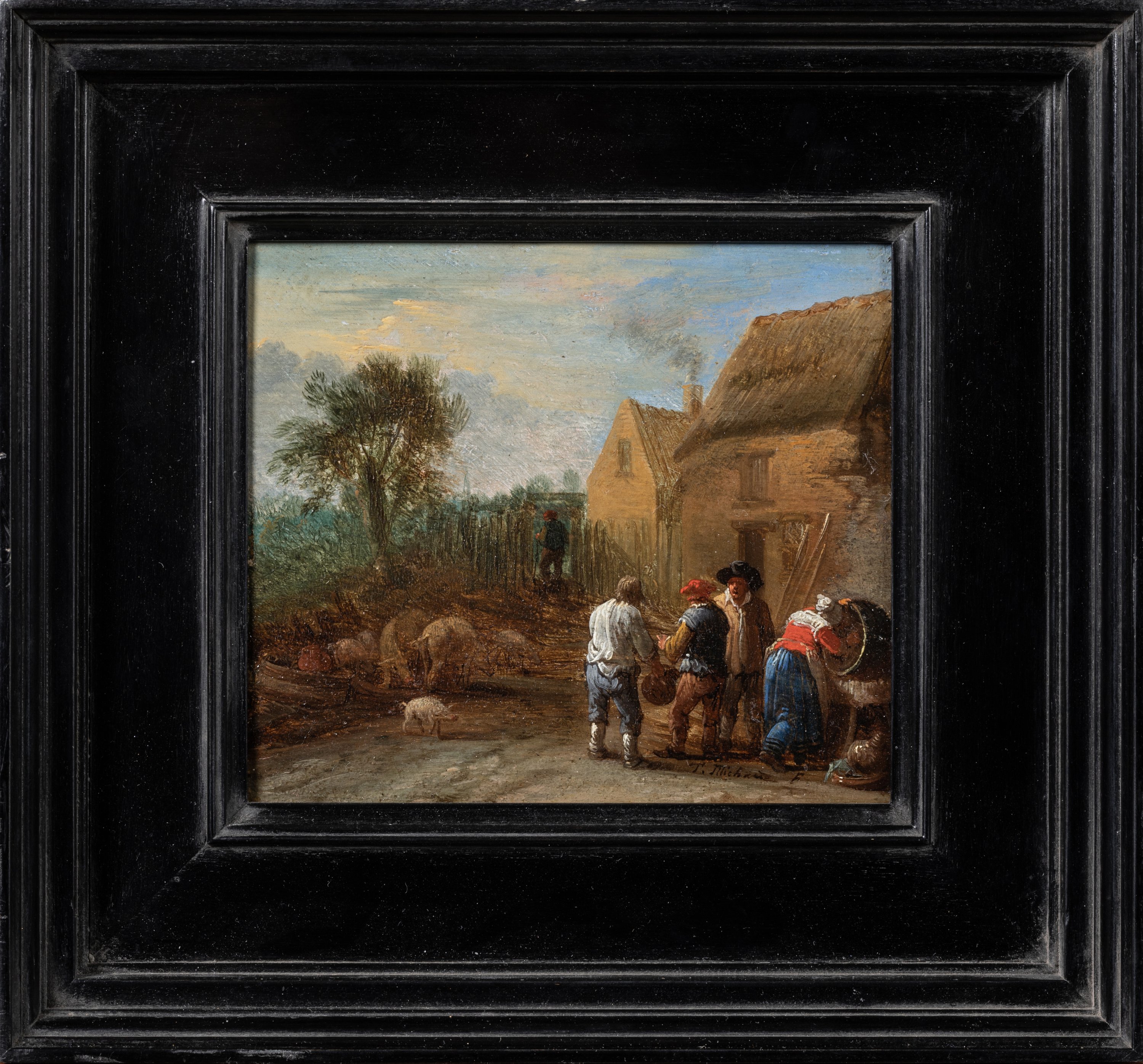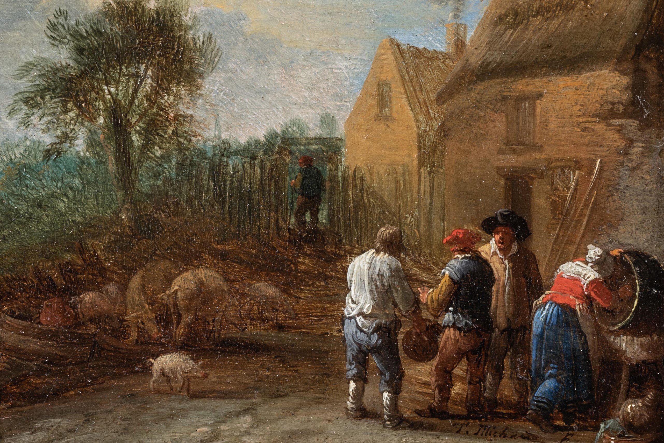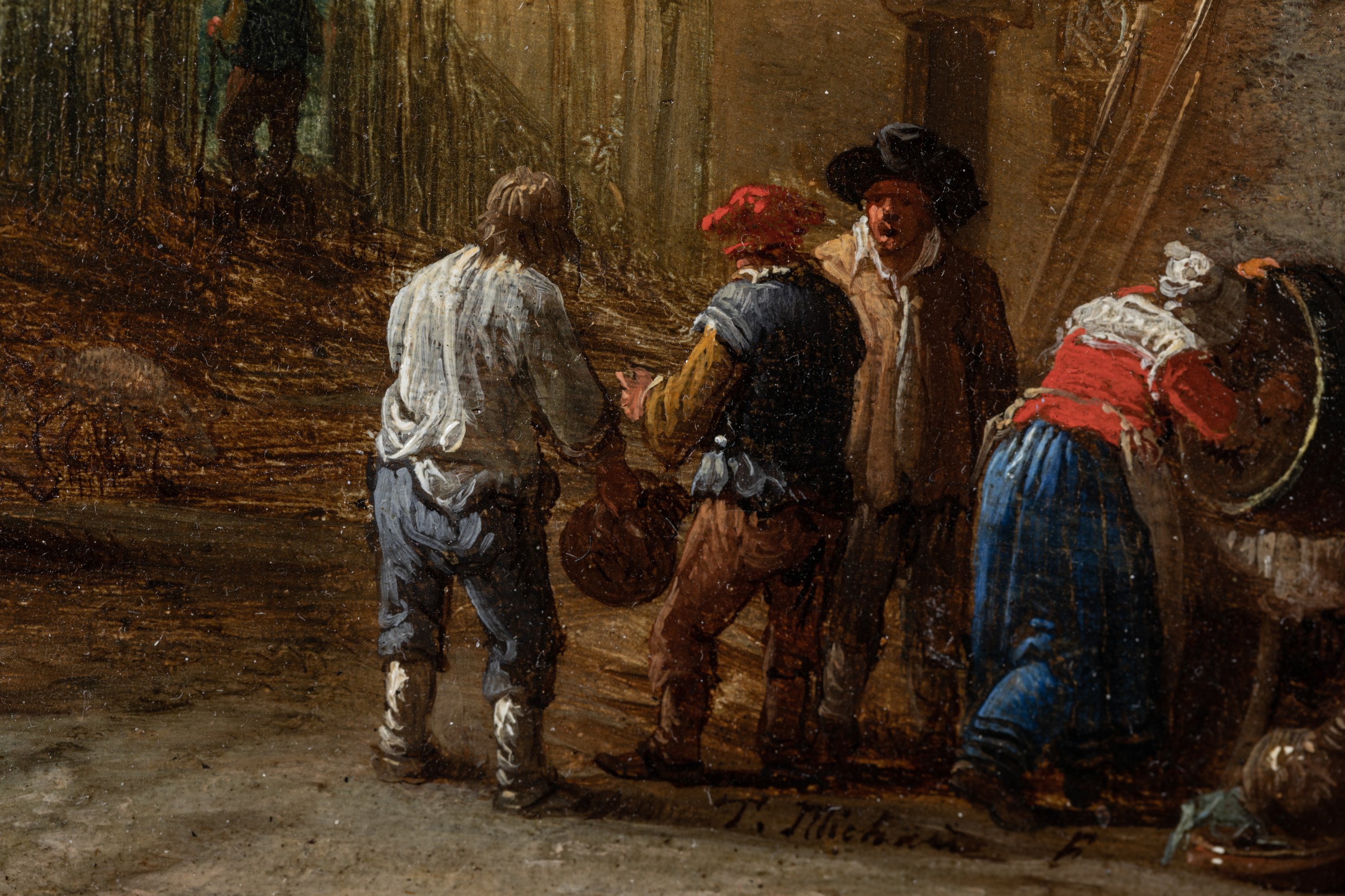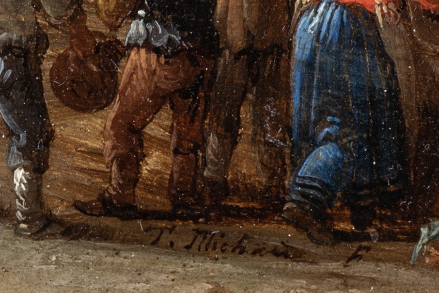 A painting by Théobald Michau depicting a village scene. Panel painting. Signed "T Michaud F".