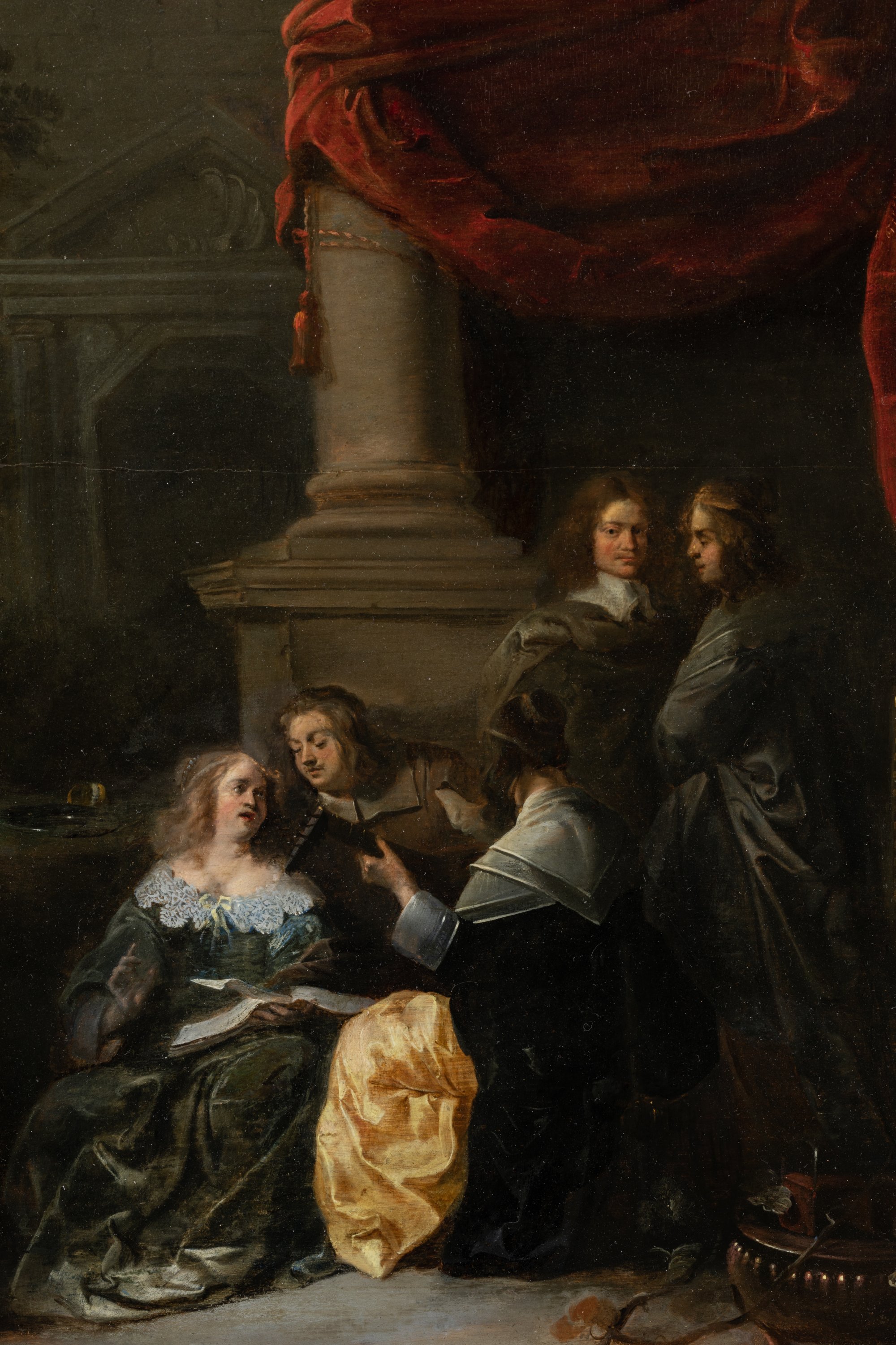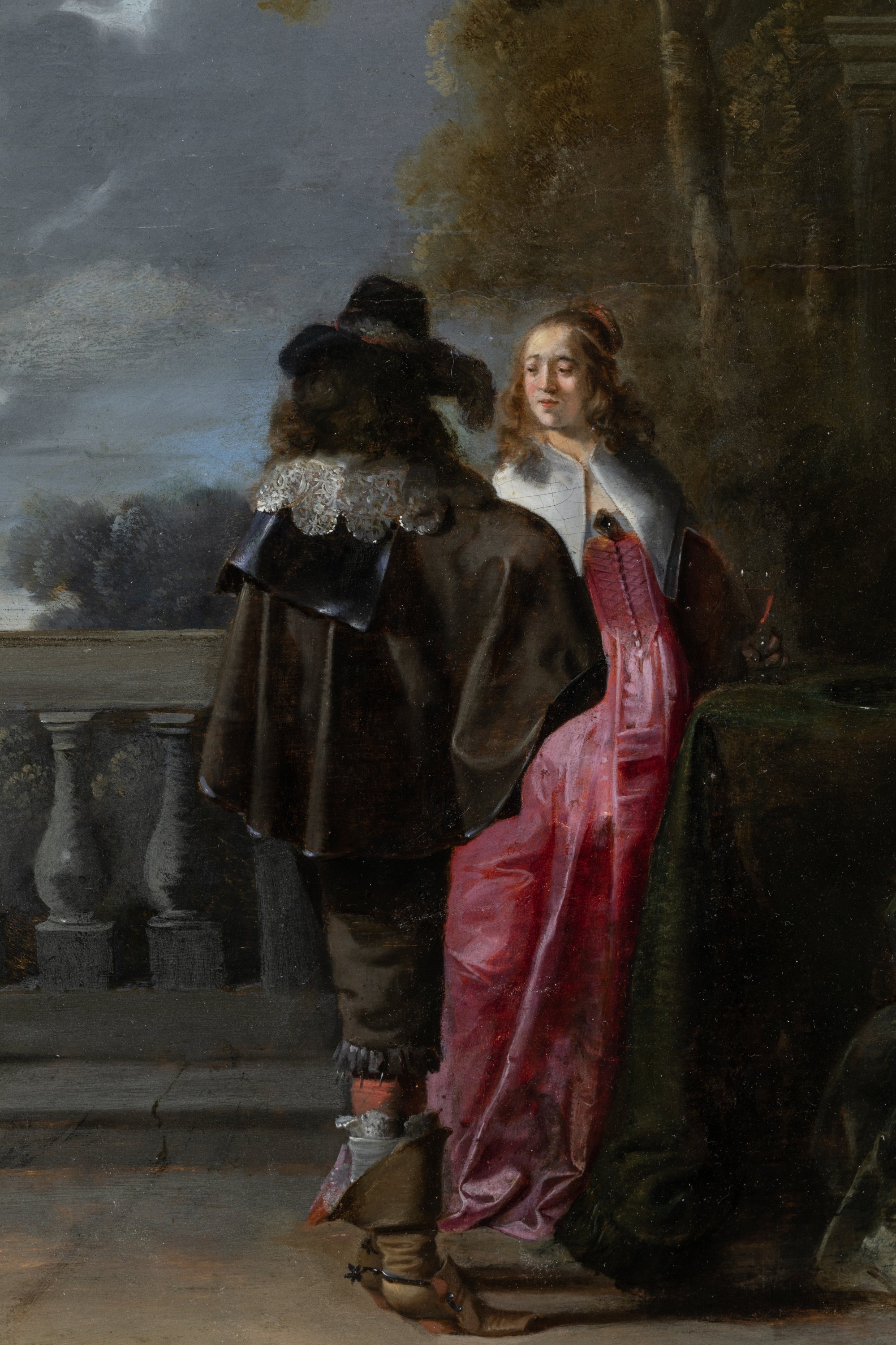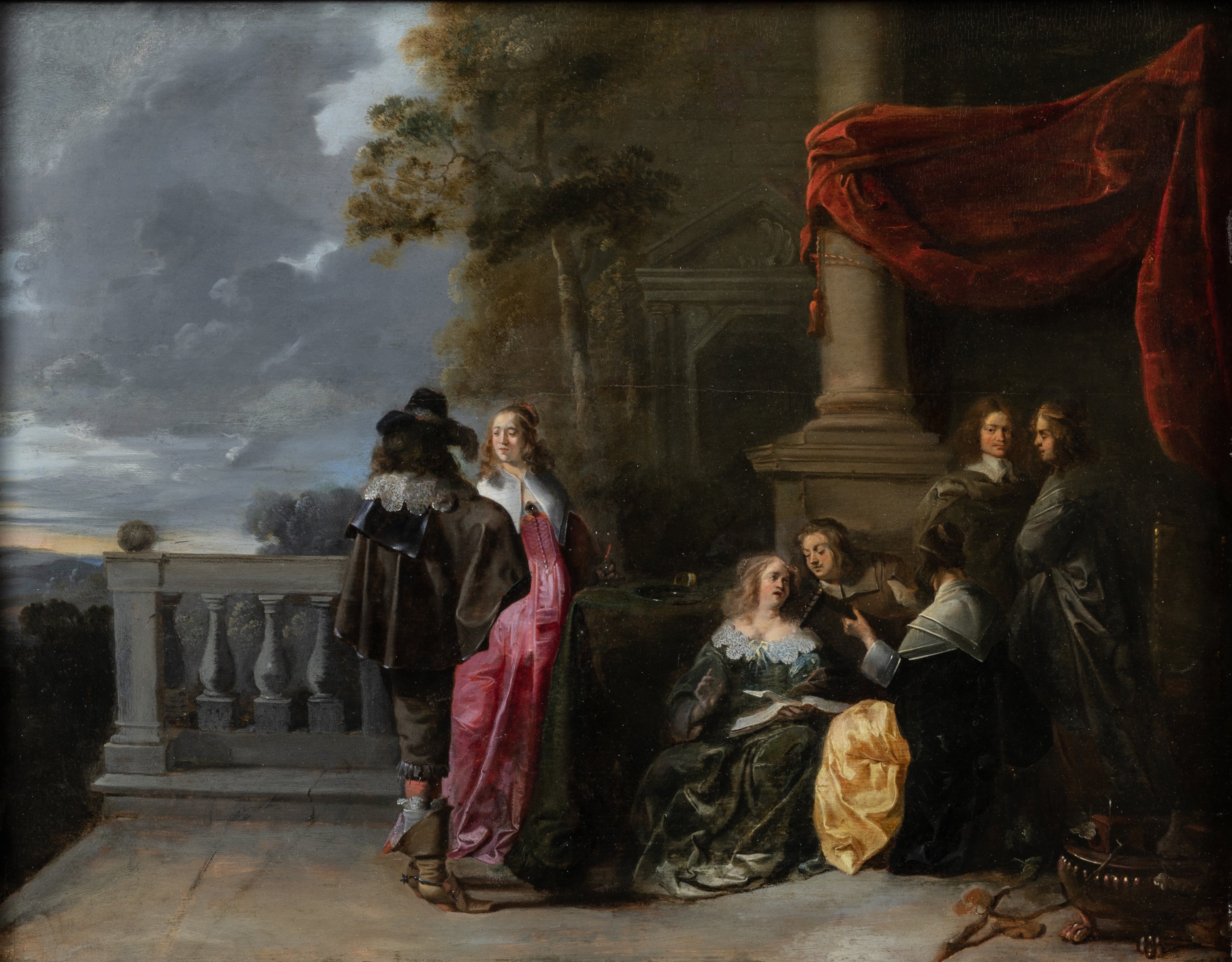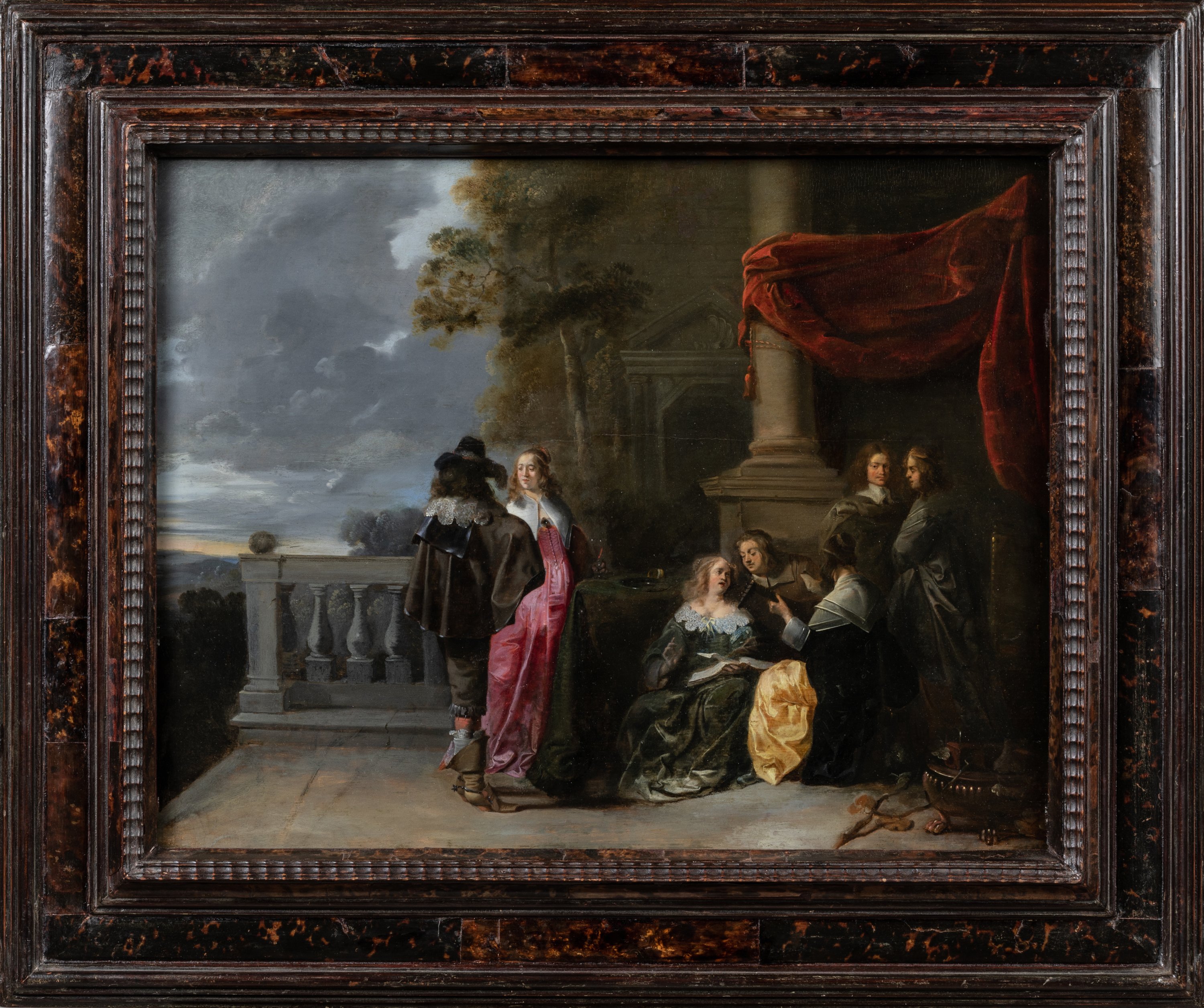 A painting by Van der Lamen depicting a concert on a terrace. Parquet panel painting.