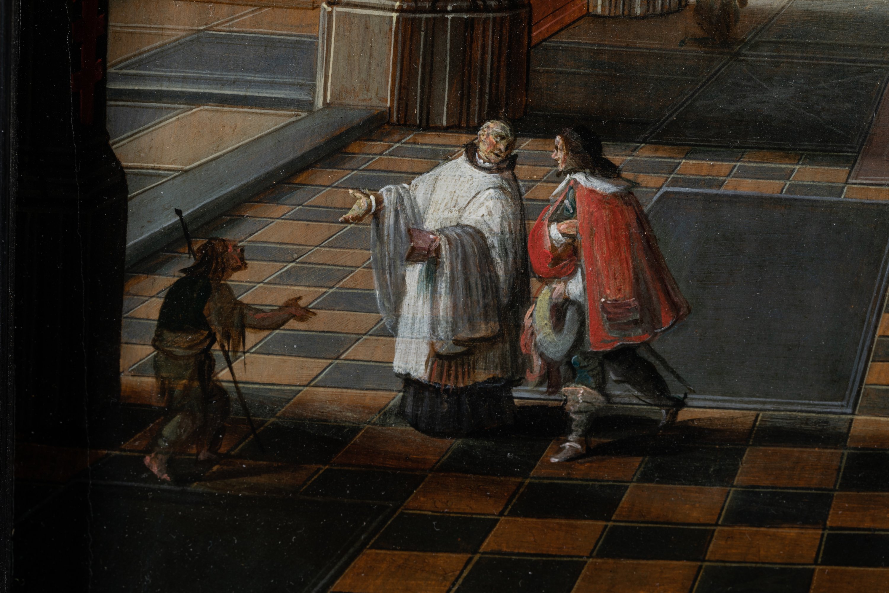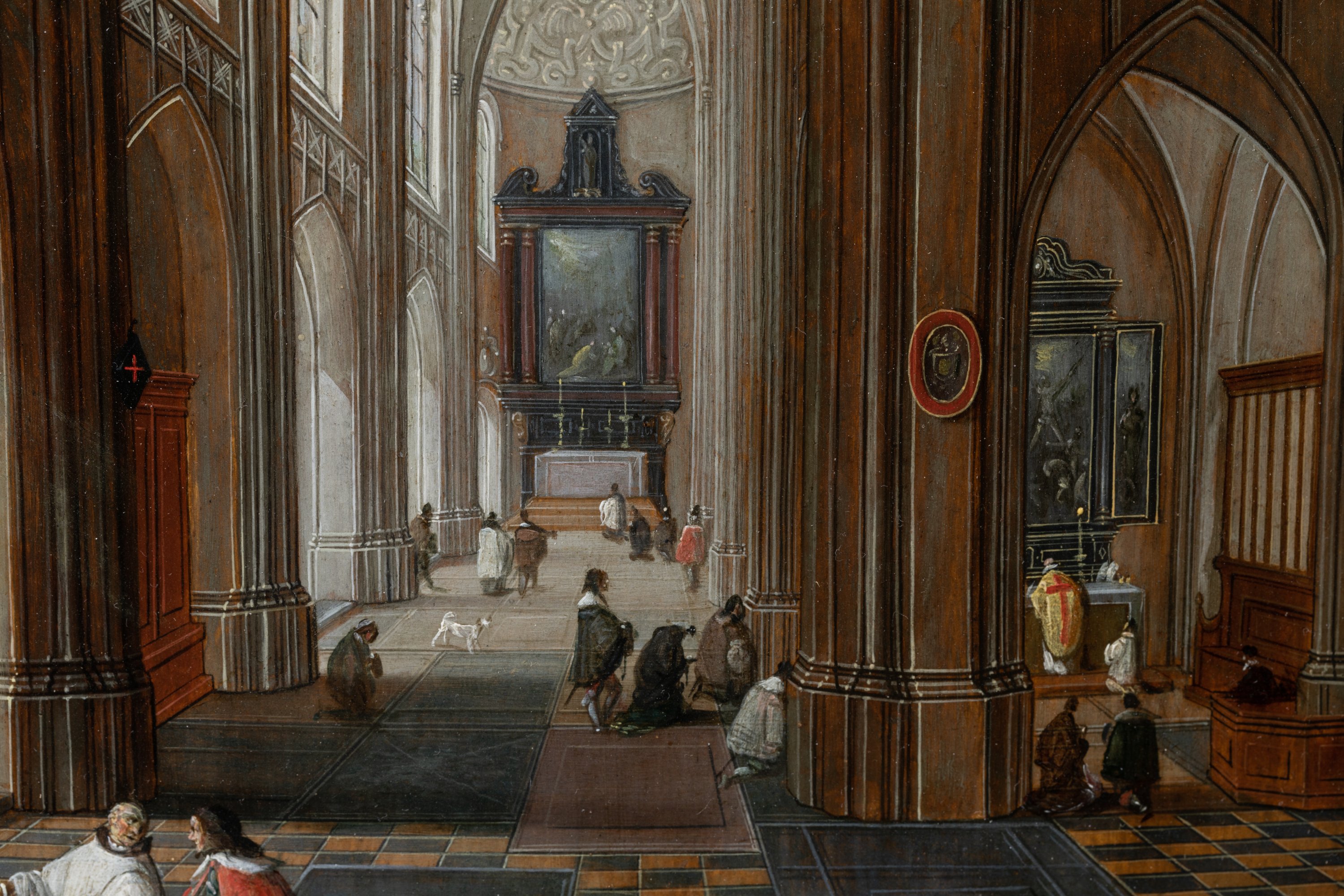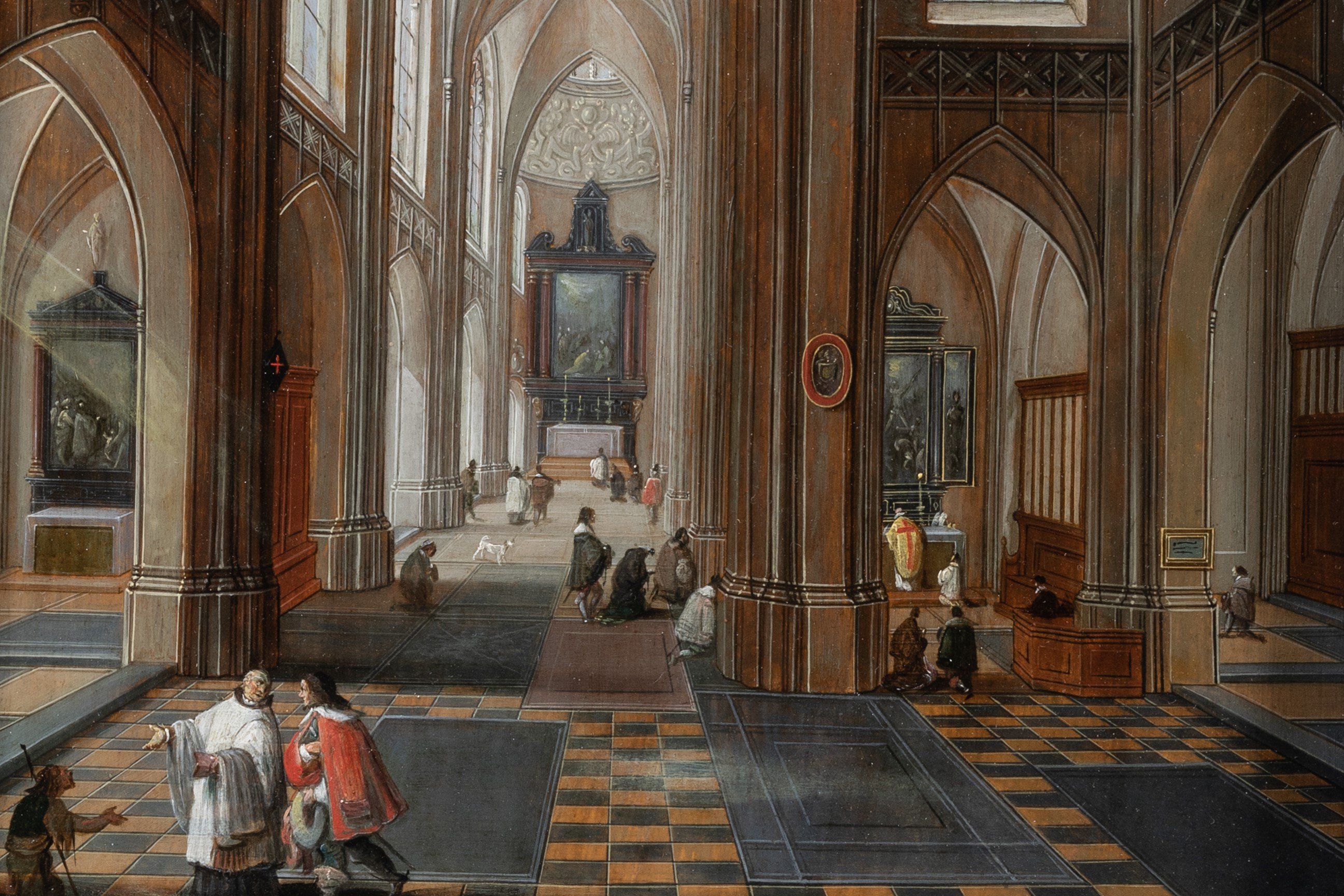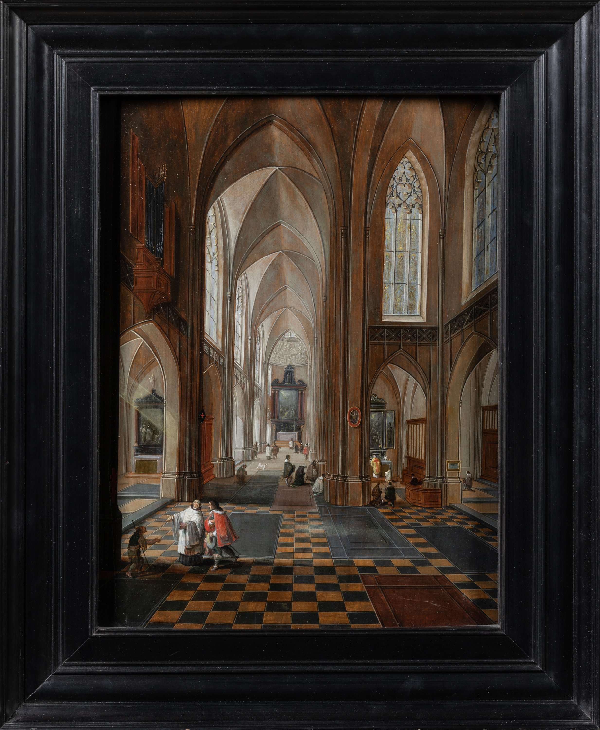 A painting by Peter Neef depicting the interior of a cathedral. Panel painting. Marked "472" on the back.
