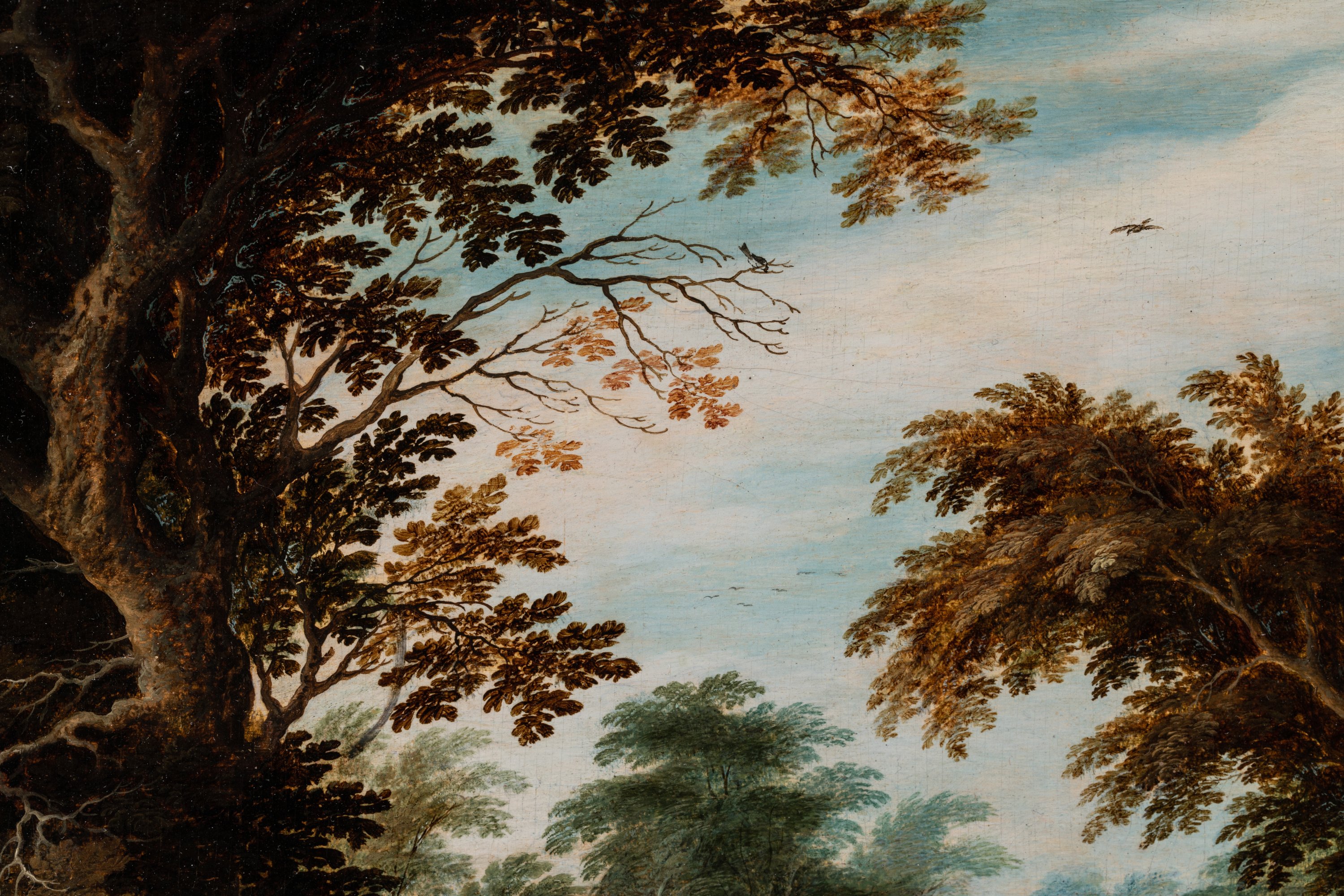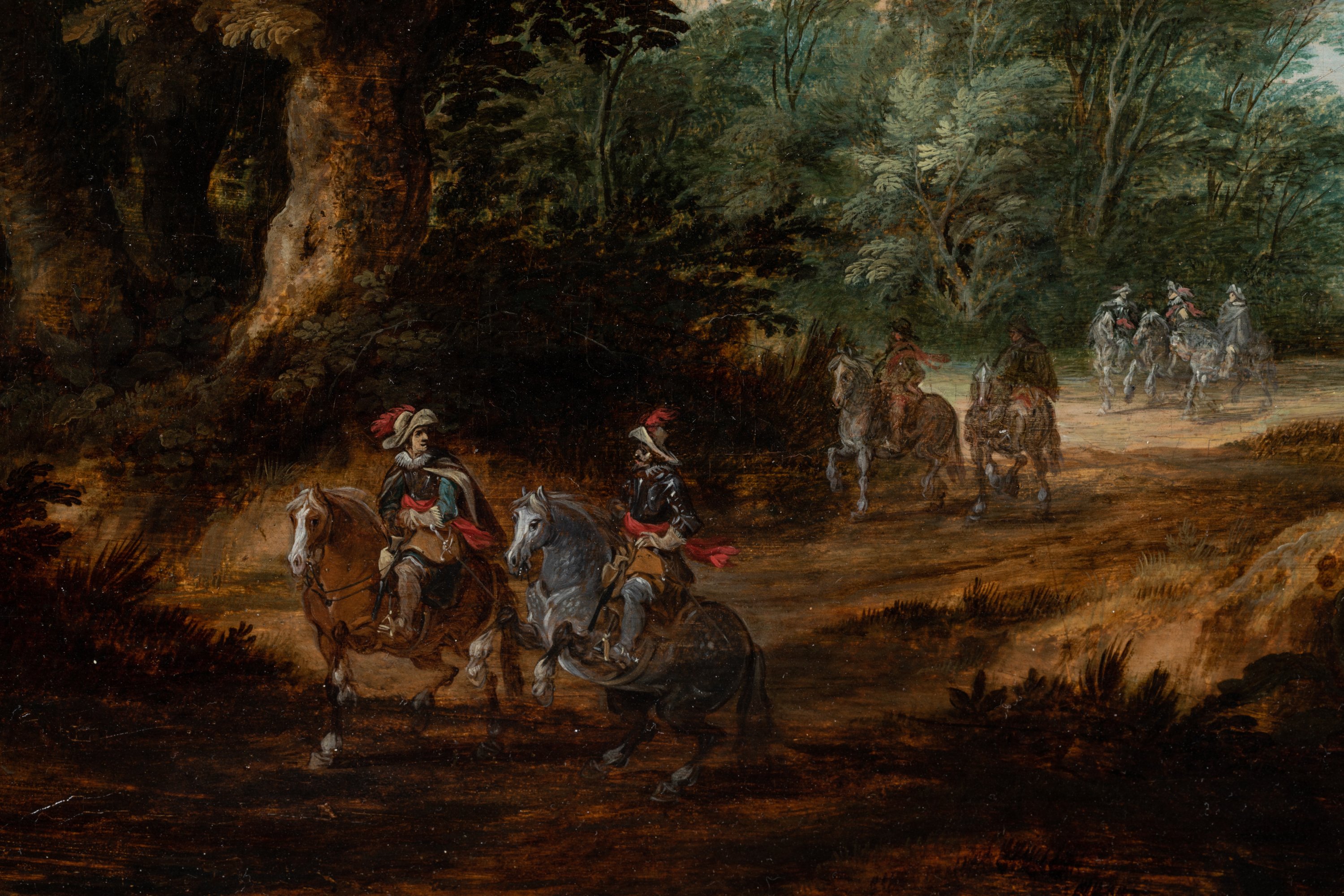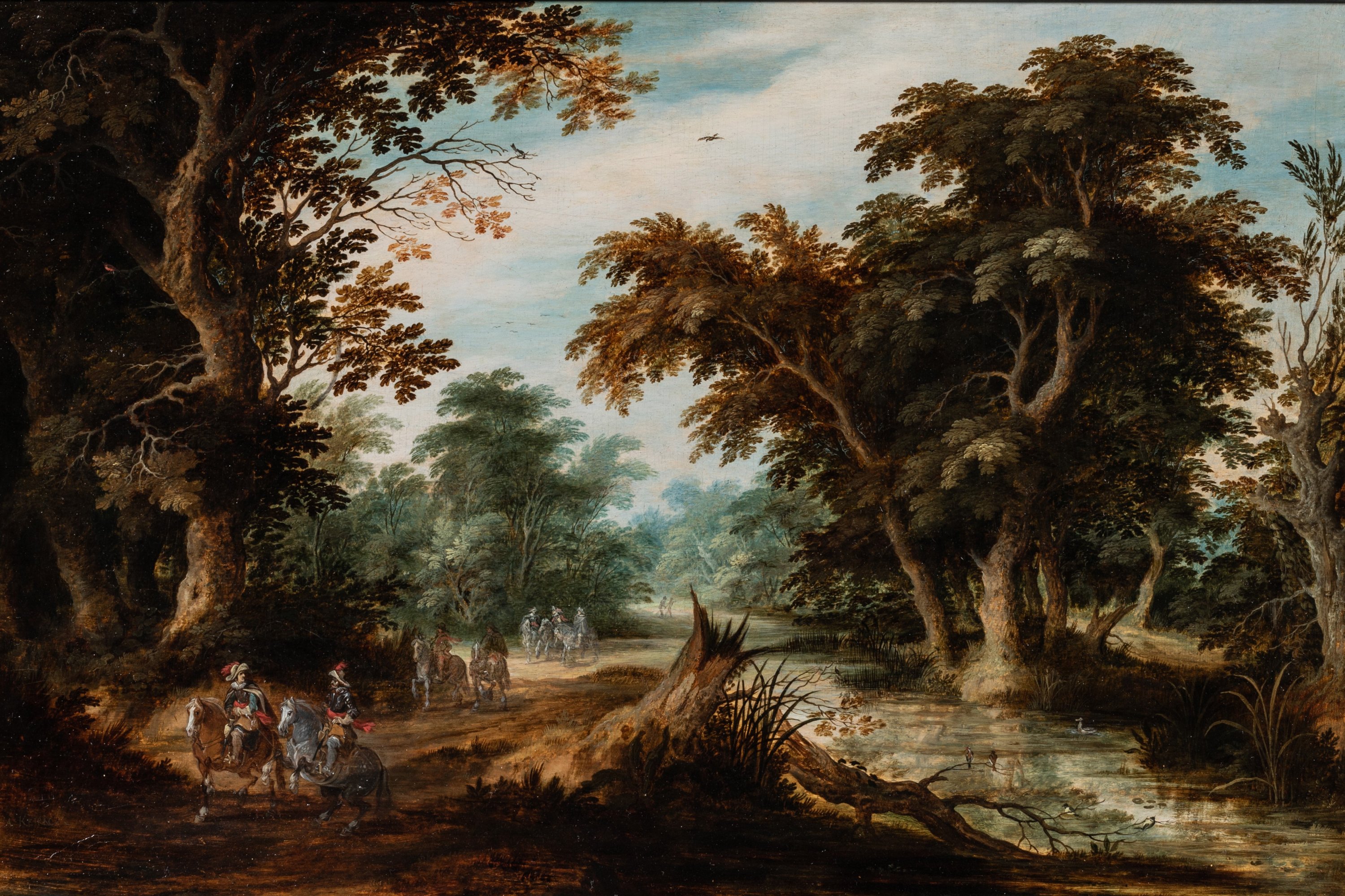 A painting by Alexander Keirincx depicting a wooded landscape with riders. Panel painting. Signed "A Keirinck", markings on the back. Characters may have been painted by Pieter Snayers.
