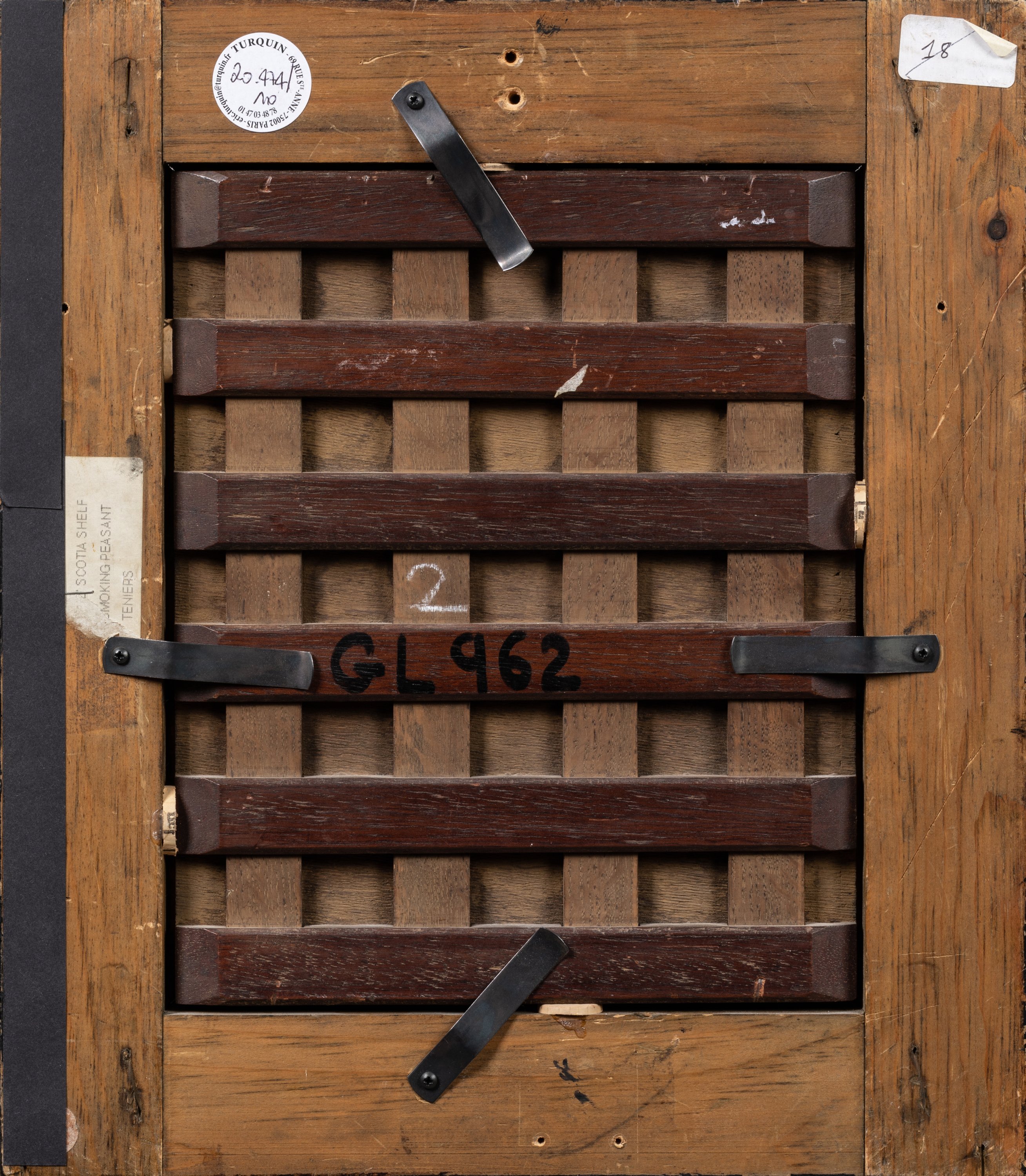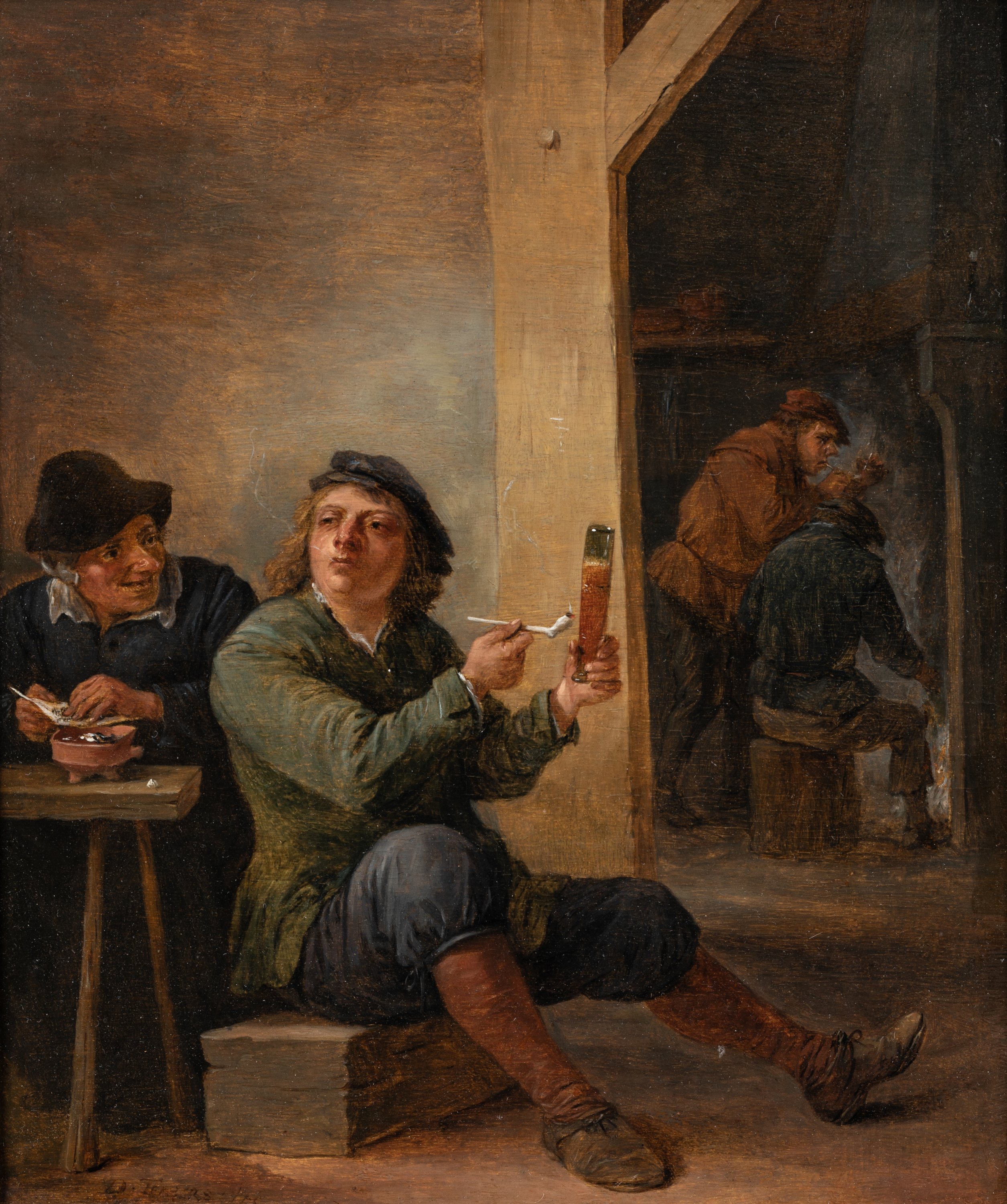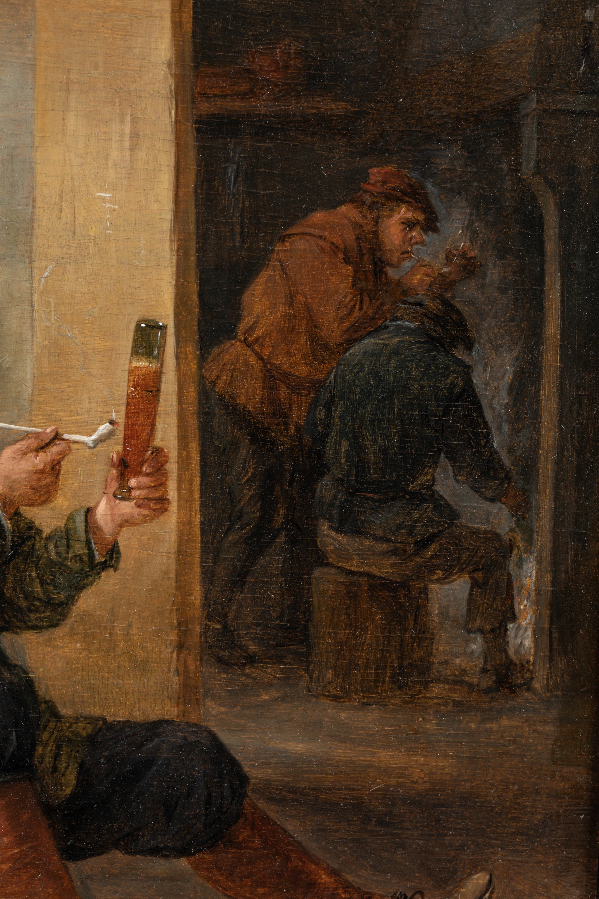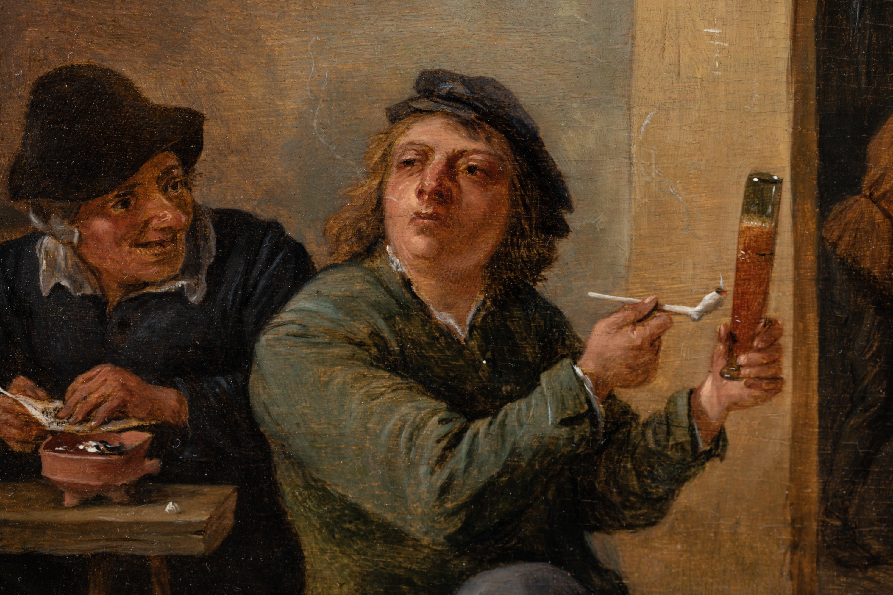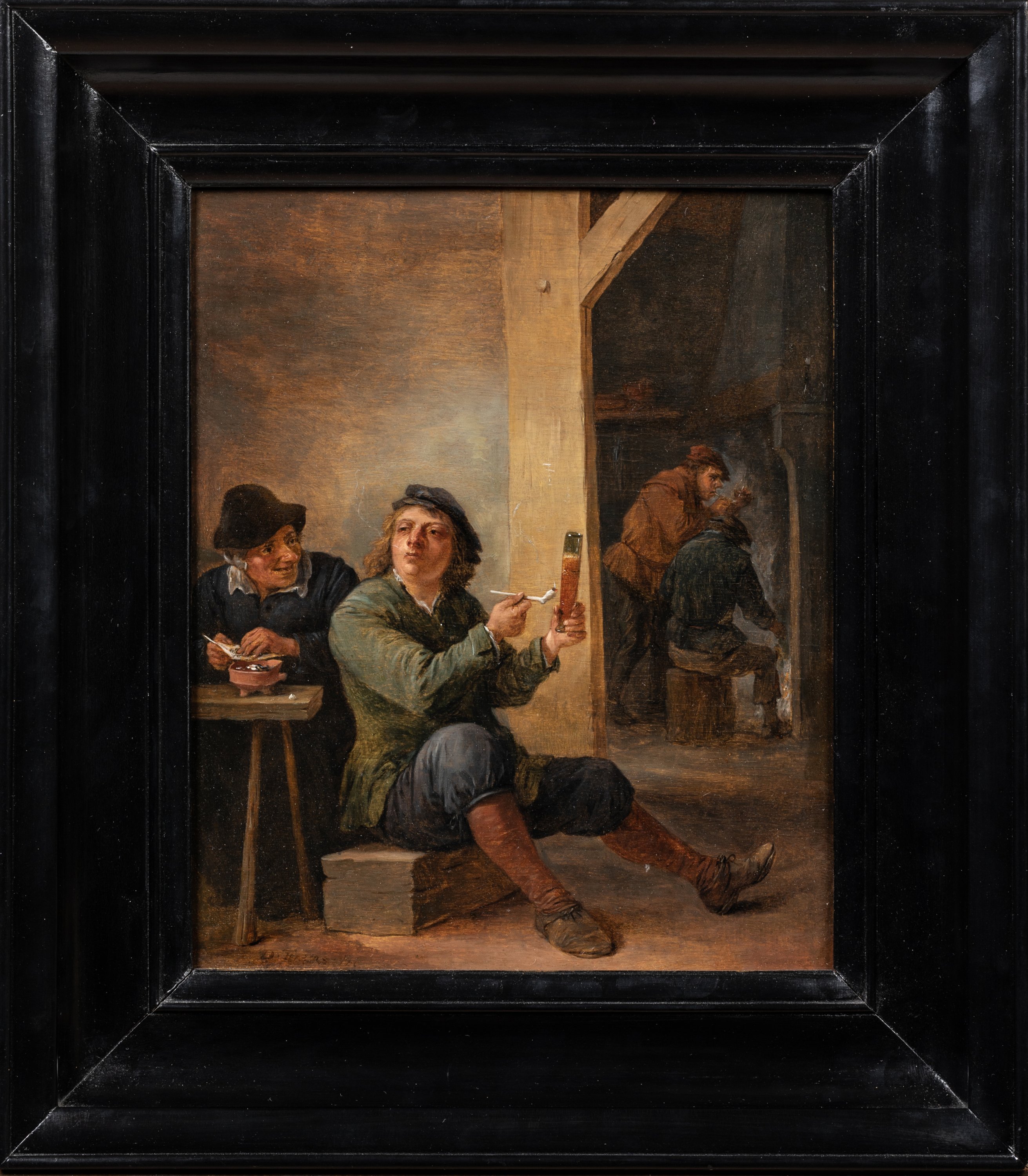 A painting by David Teniers the Younger depicting smokers. Panel painting. Signed "D. Teniers F". Markings on the back.