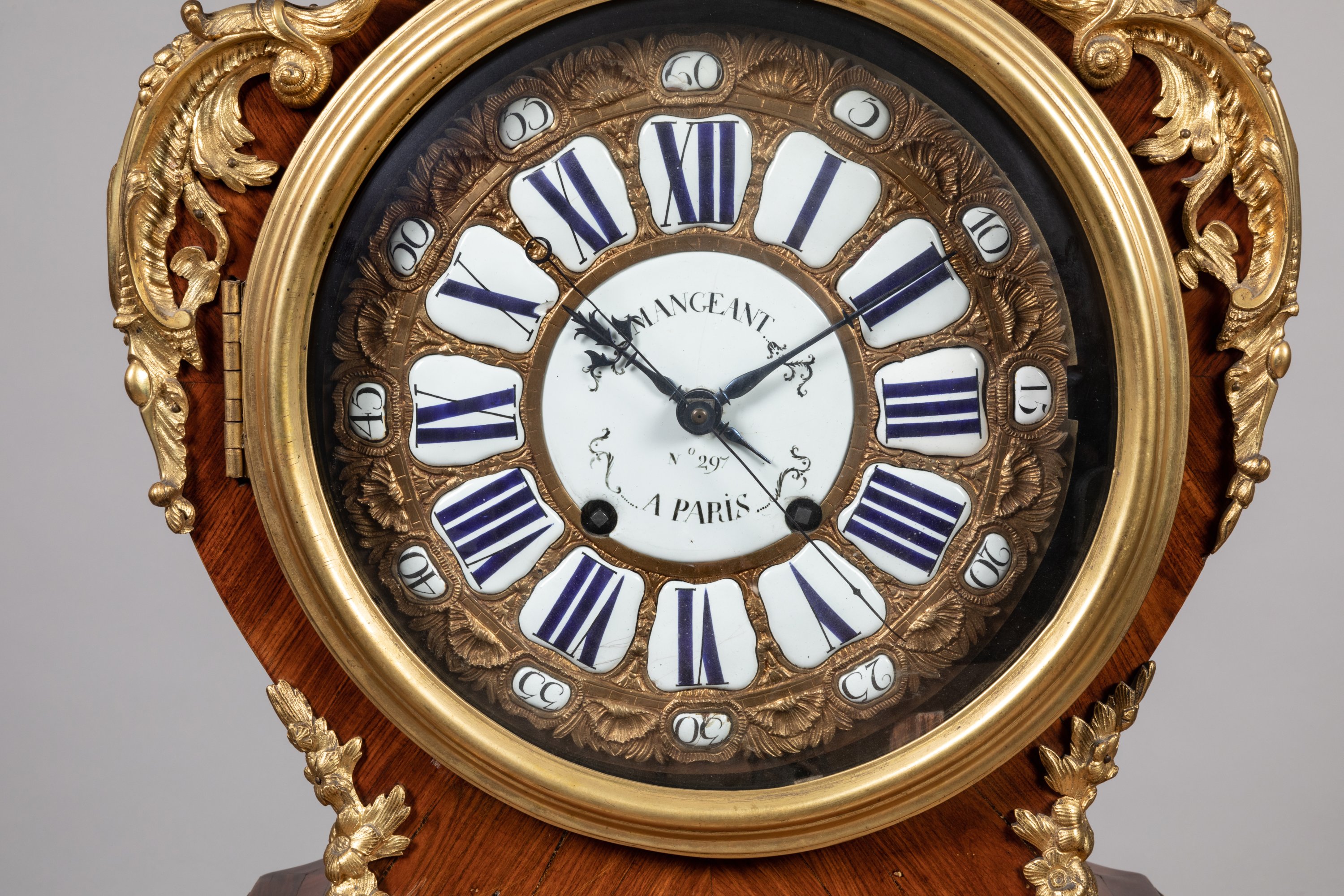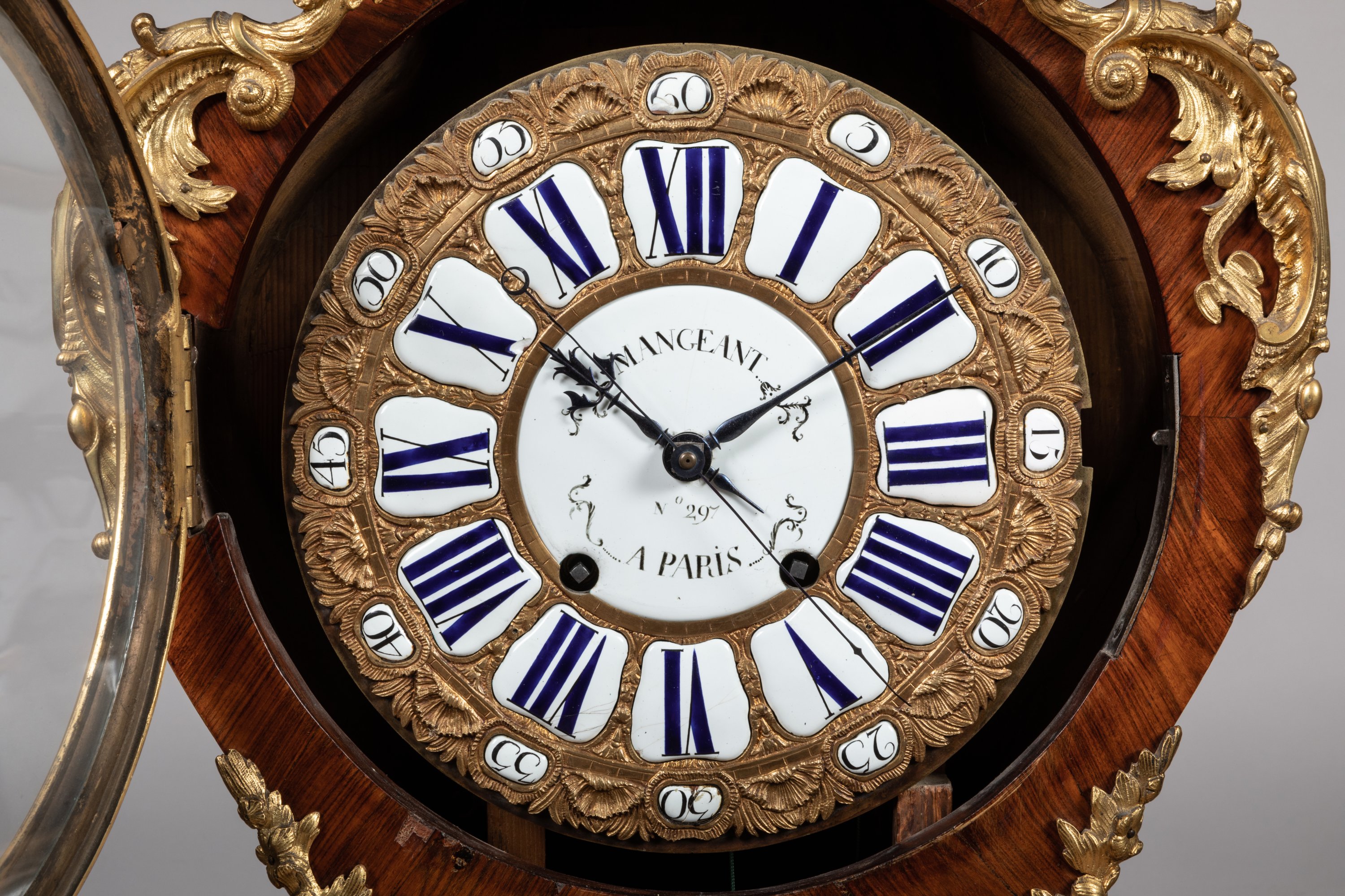 Mouvement dhorloge postérieur signé Mangeant N° 297 A Paris (maîtrise en 1734) en bronze composé de 25 cartouches en émail bleu Roi, aux chiffres romains pour les heures et arabes pour les minutes.