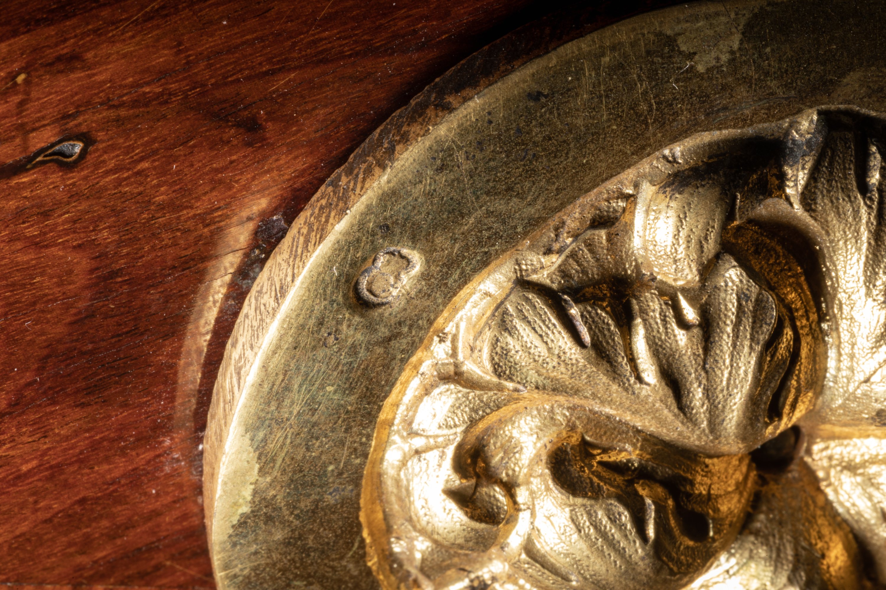 Ornementation de bronzes ciselés et dorés : agrafes, lunette rocaille, moulures. Certains bronzes sont marqués au « C » couronné.