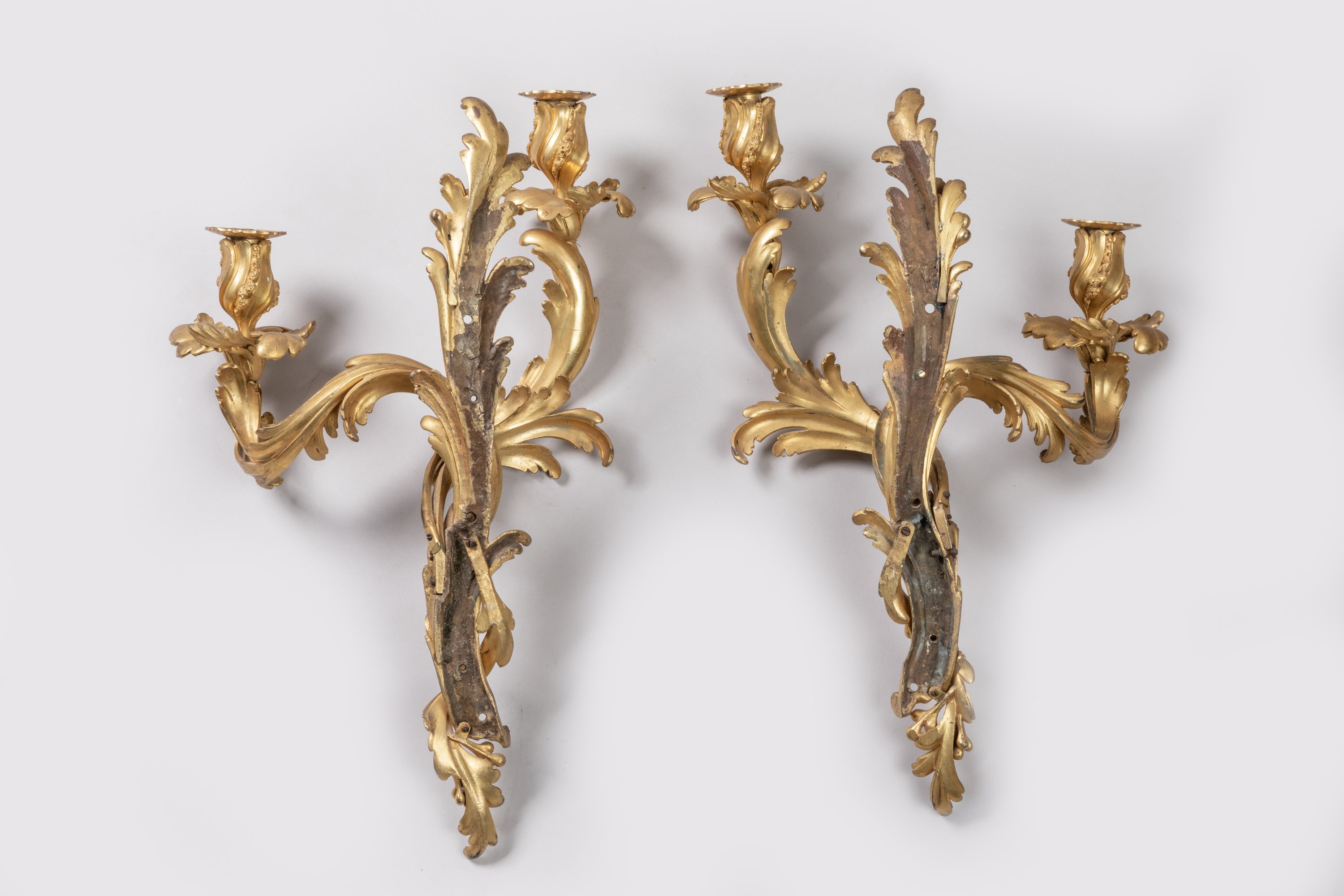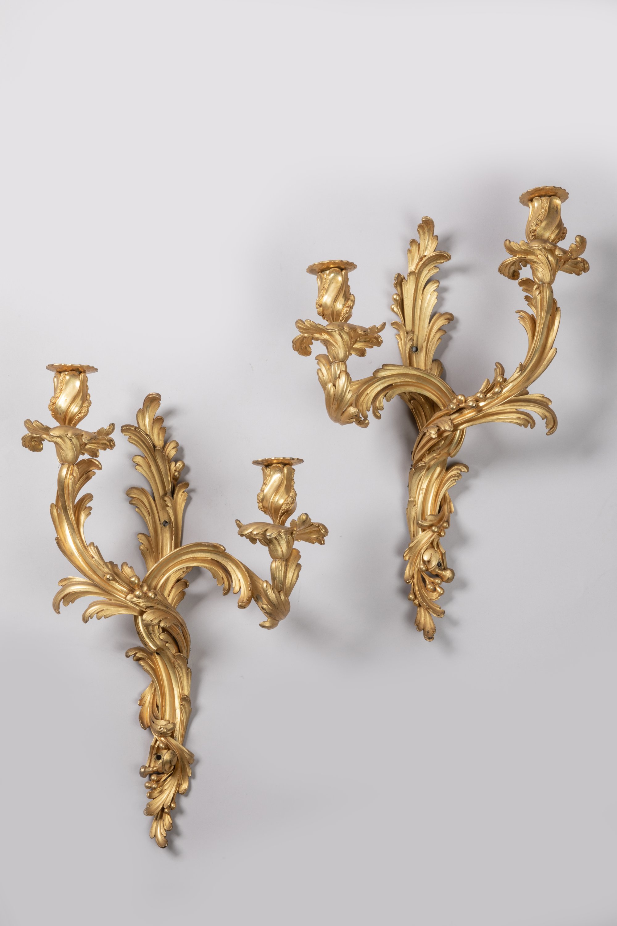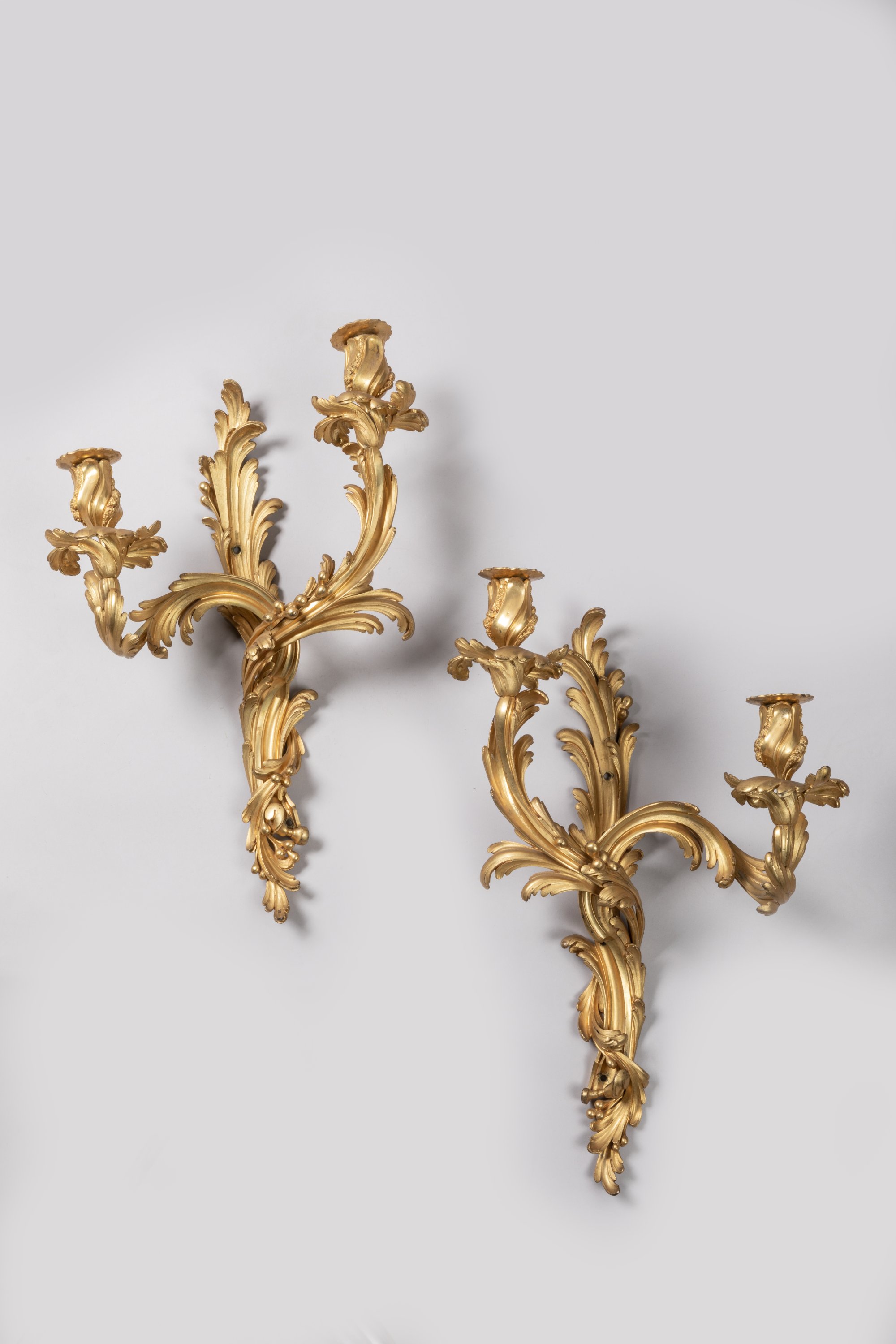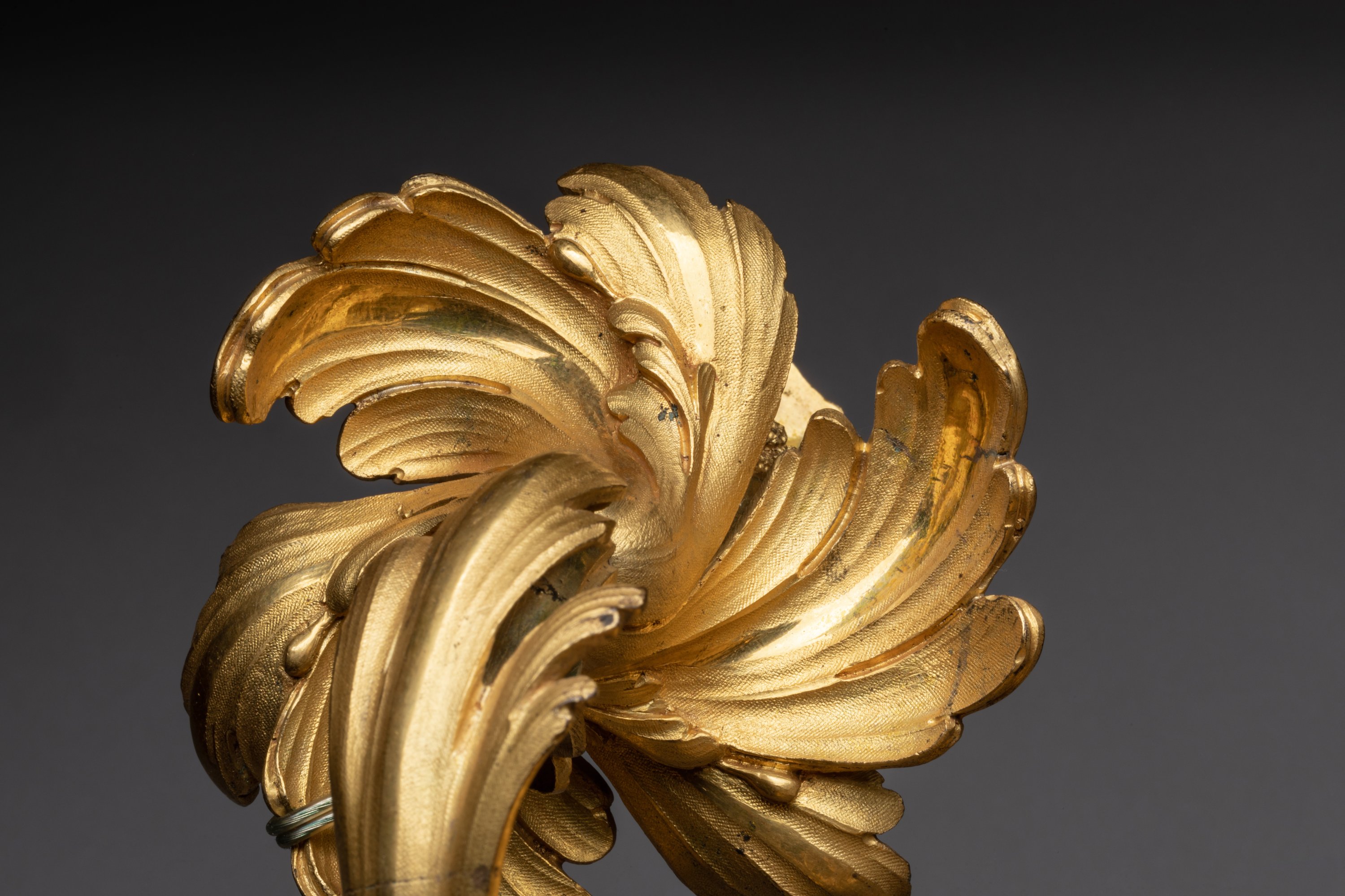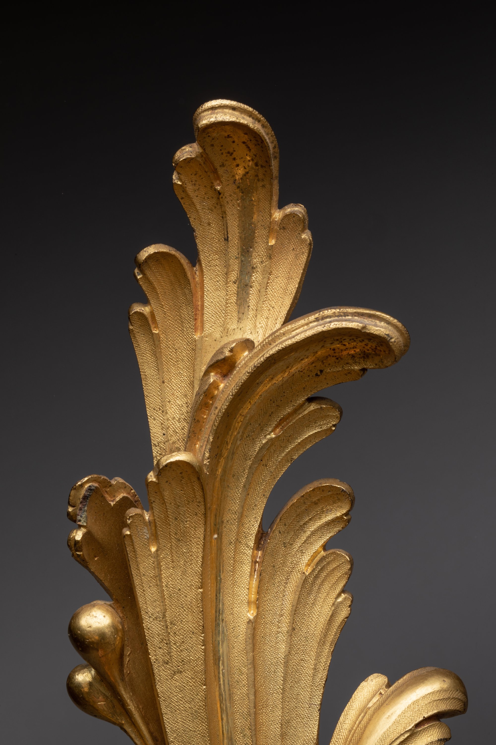 en bronze ciselé et doré. Les fûts en enroulements dacanthe superposés sont prolongés en leur centre par deux bras de lumière aux courbes croisées, à décor de feuilles dacanthe aux fruits. Les bobèches aux feuilles déchiquetées soutiennent les binets de forme hélicoïdale à décor de graines. Dorure au mercure.