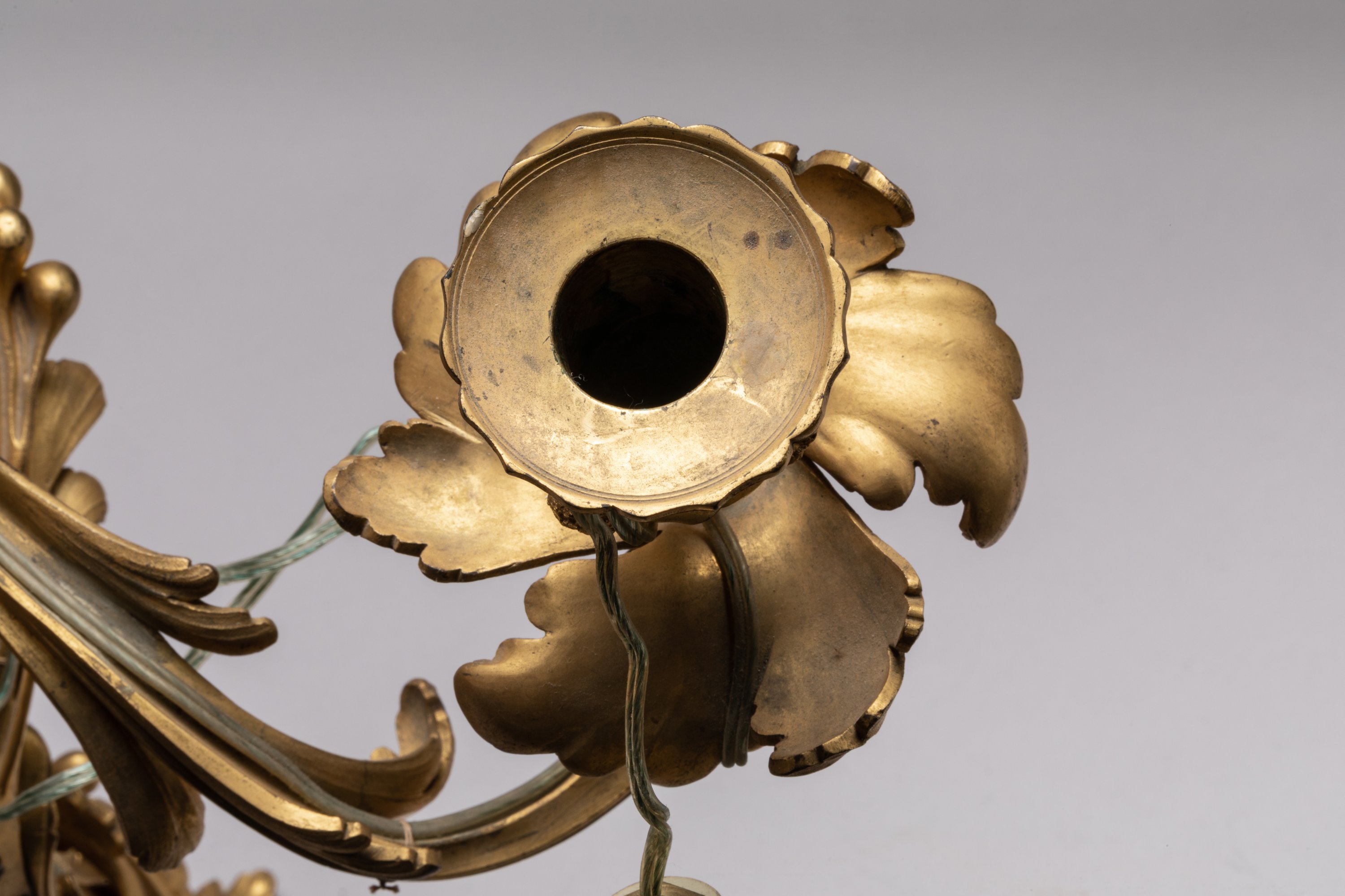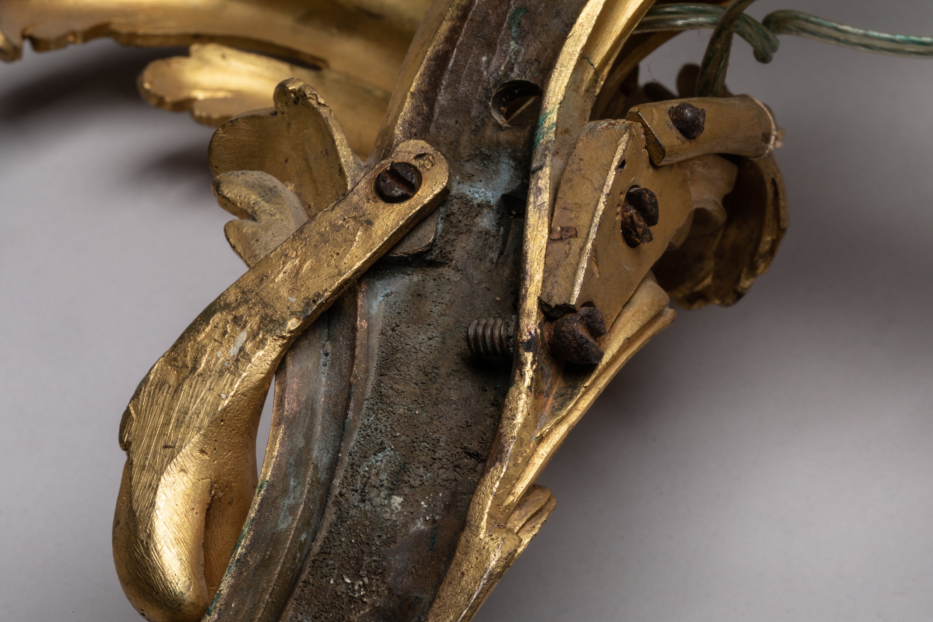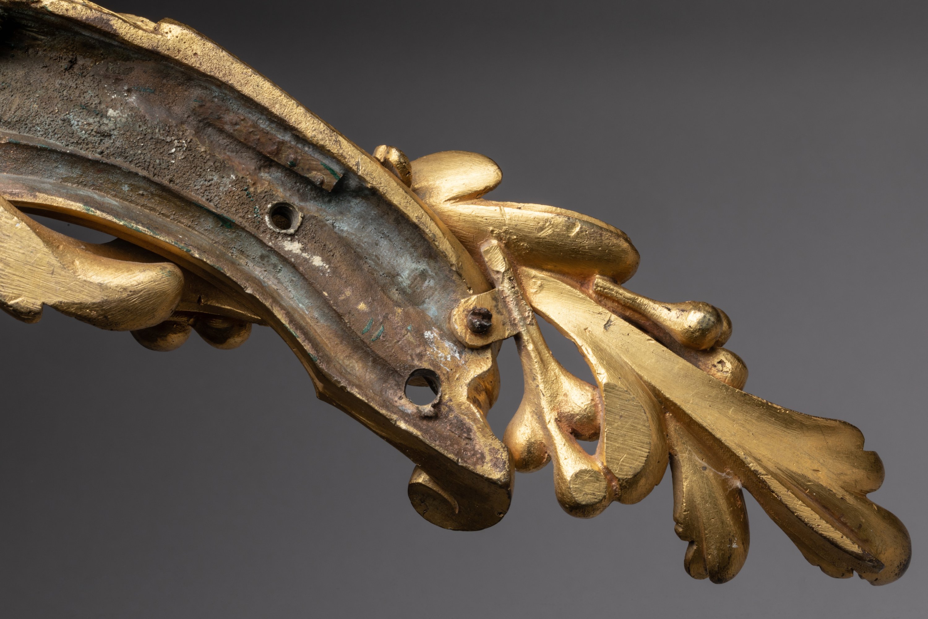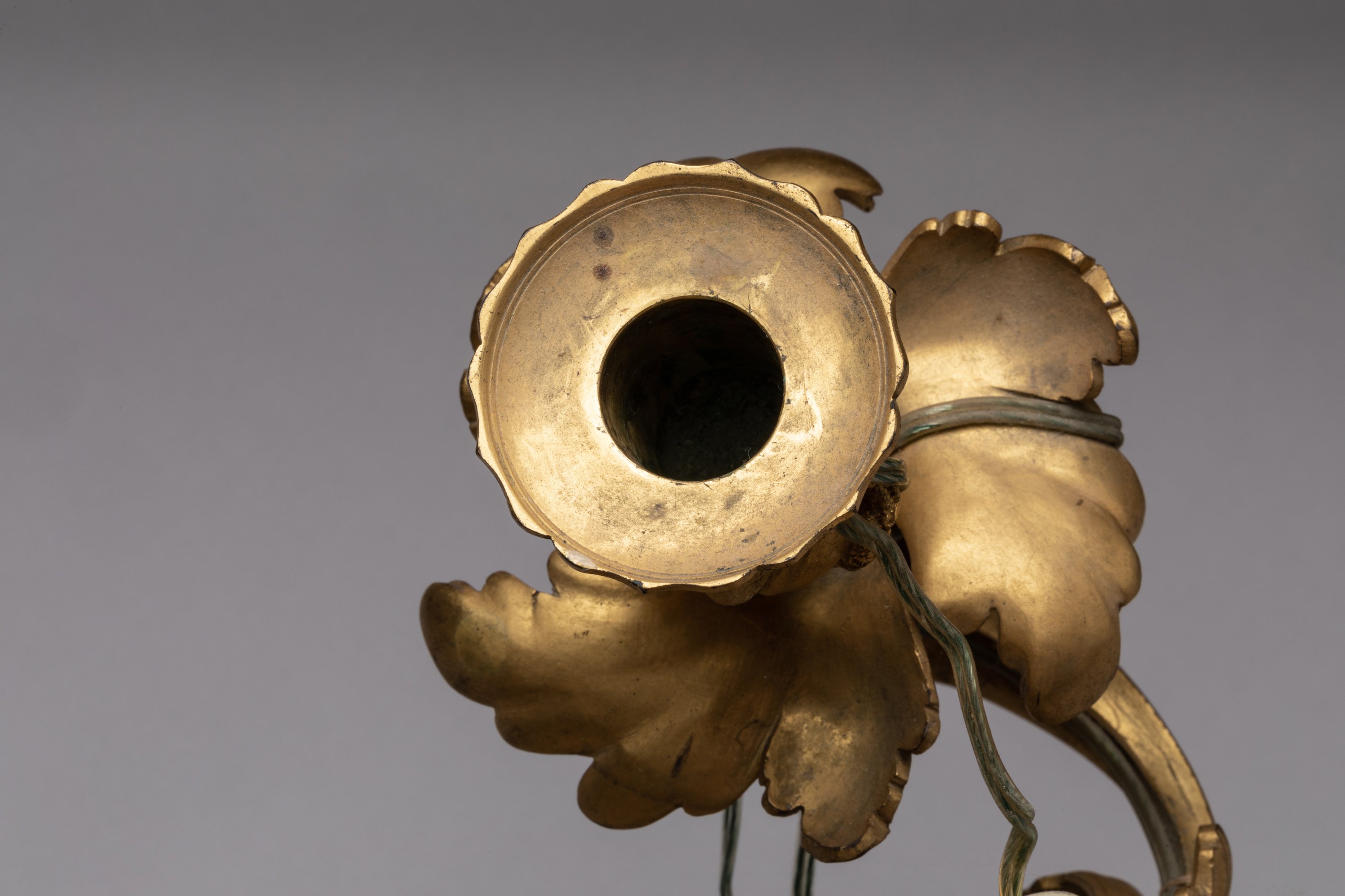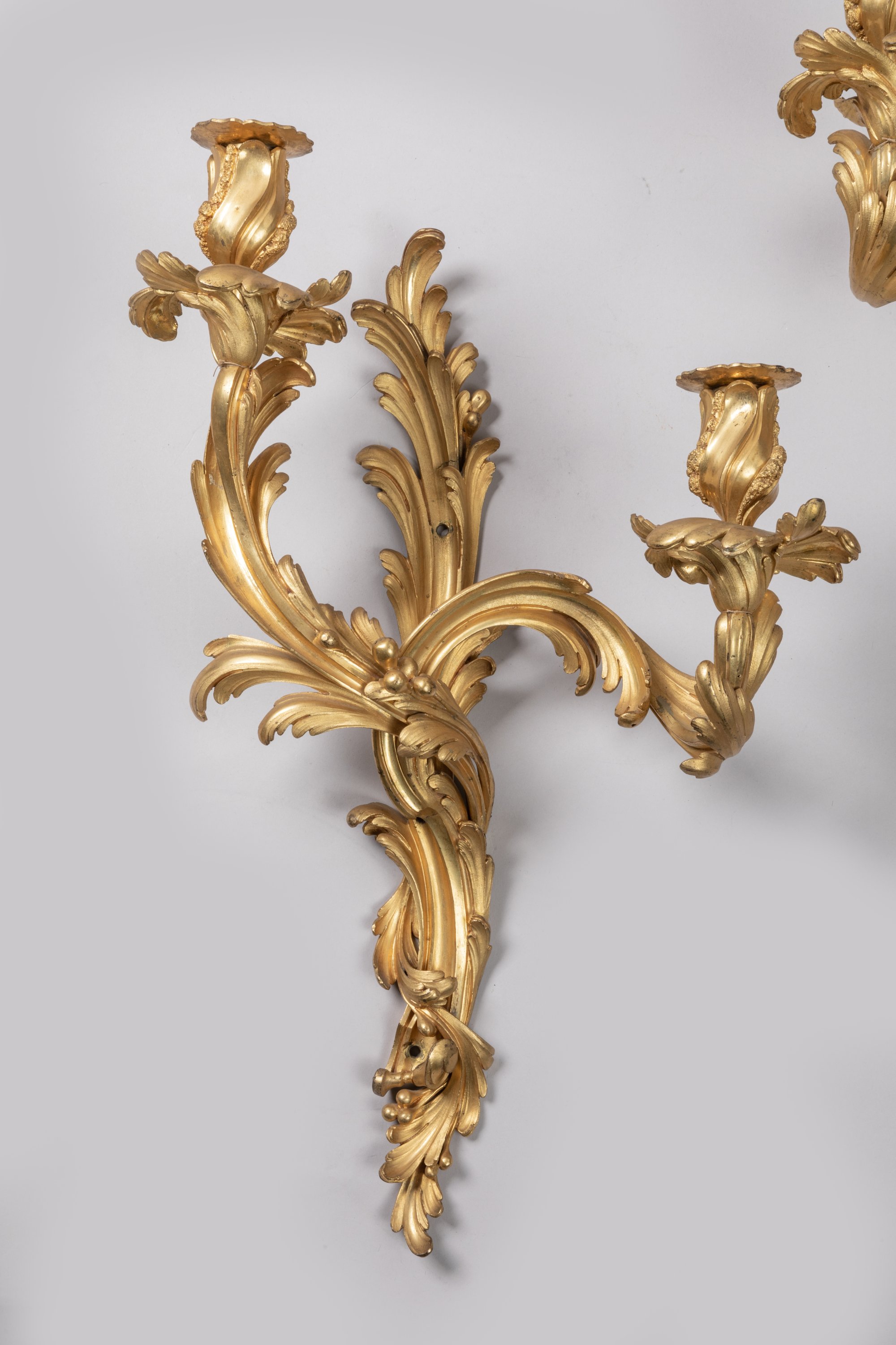 en bronze ciselé et doré. Les fûts en enroulements dacanthe superposés sont prolongés en leur centre par deux bras de lumière aux courbes croisées, à décor de feuilles dacanthe aux fruits. Les bobèches aux feuilles déchiquetées soutiennent les binets de forme hélicoïdale à décor de graines. Dorure au mercure.