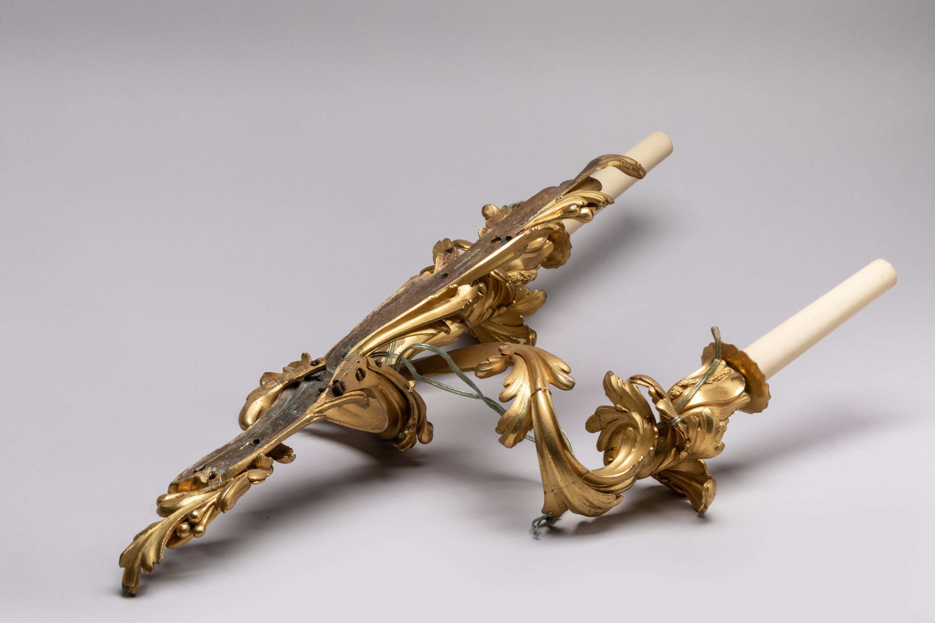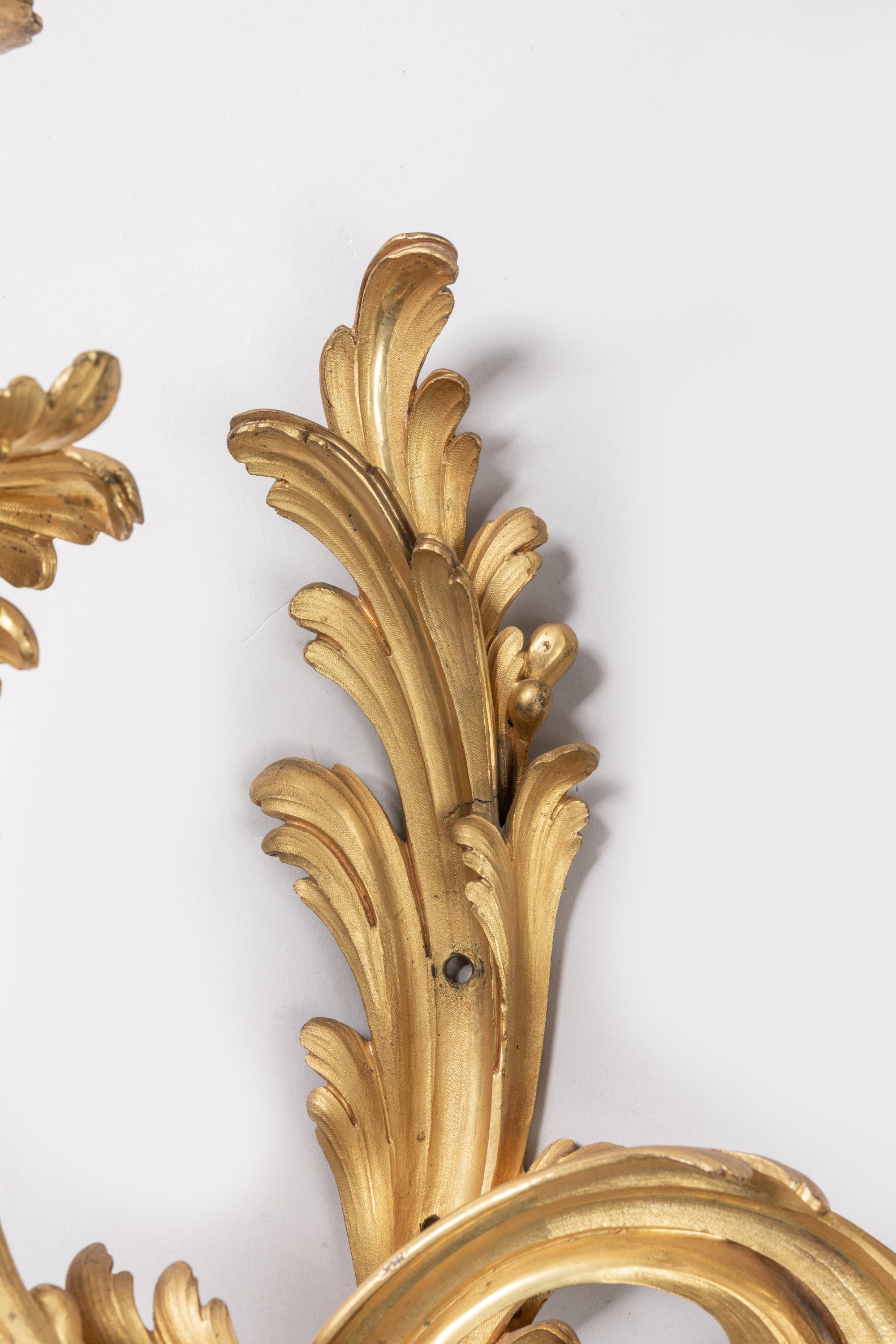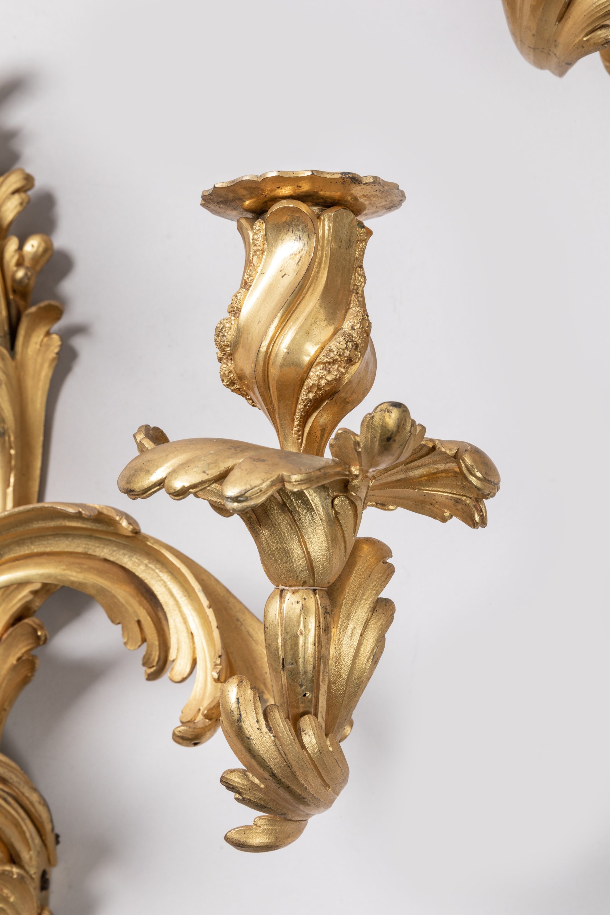 A pair of large Louis XV period chiseled and gilded bronze sconces attibuted to Philippe Caffieri. To be compared with chandeliers found in the Hôtel d'Evreux, the current Élysée Palace.