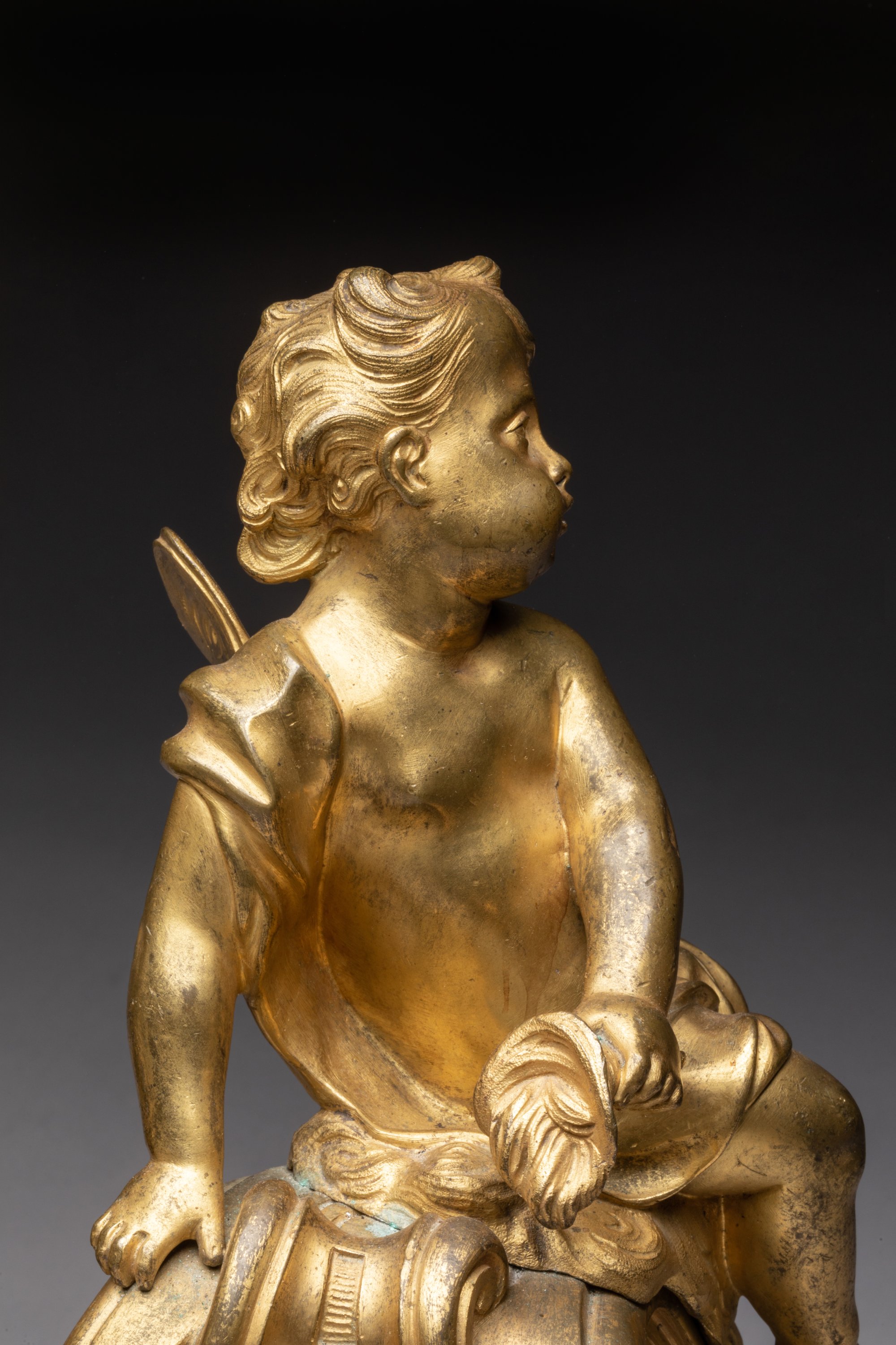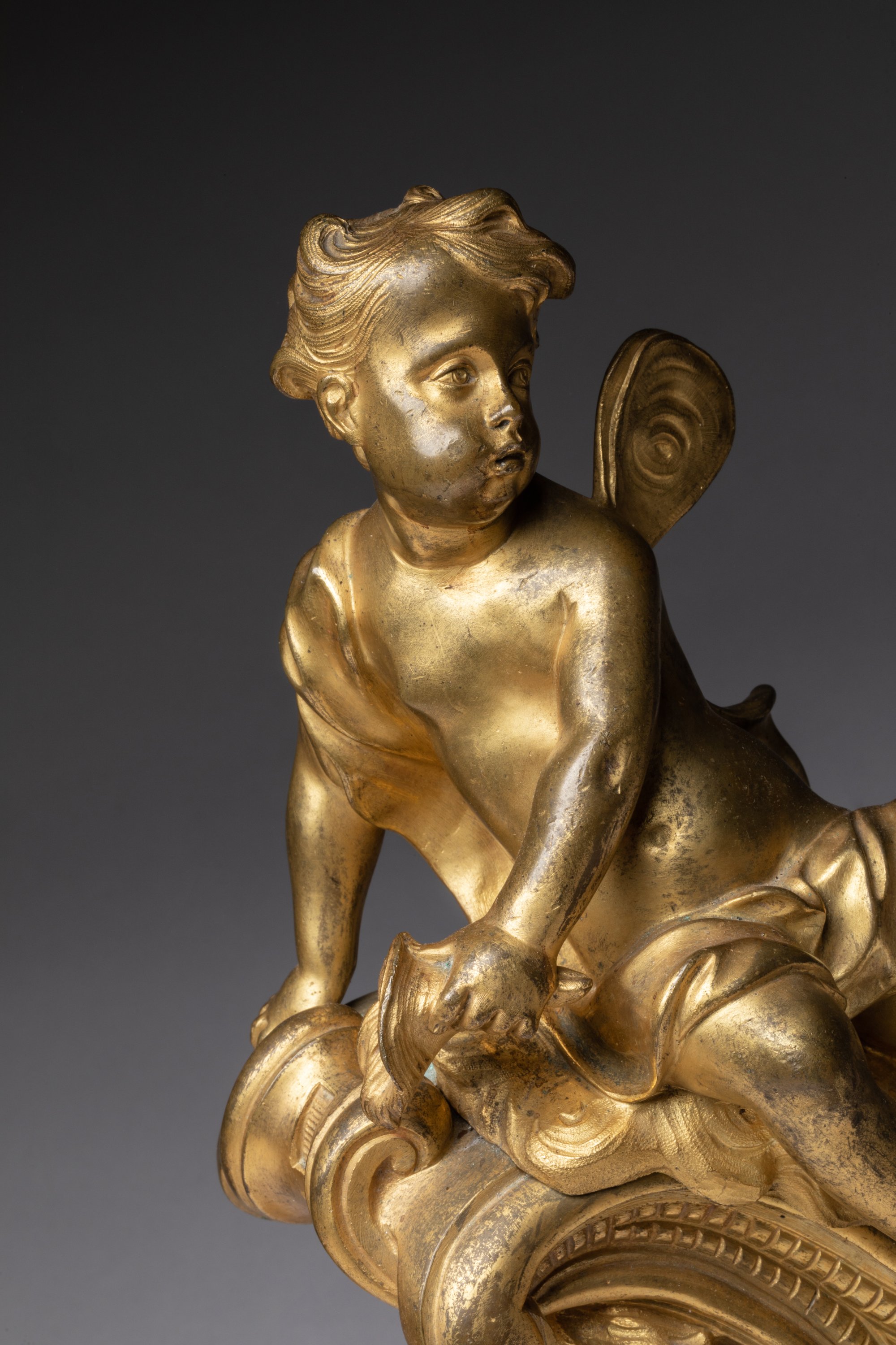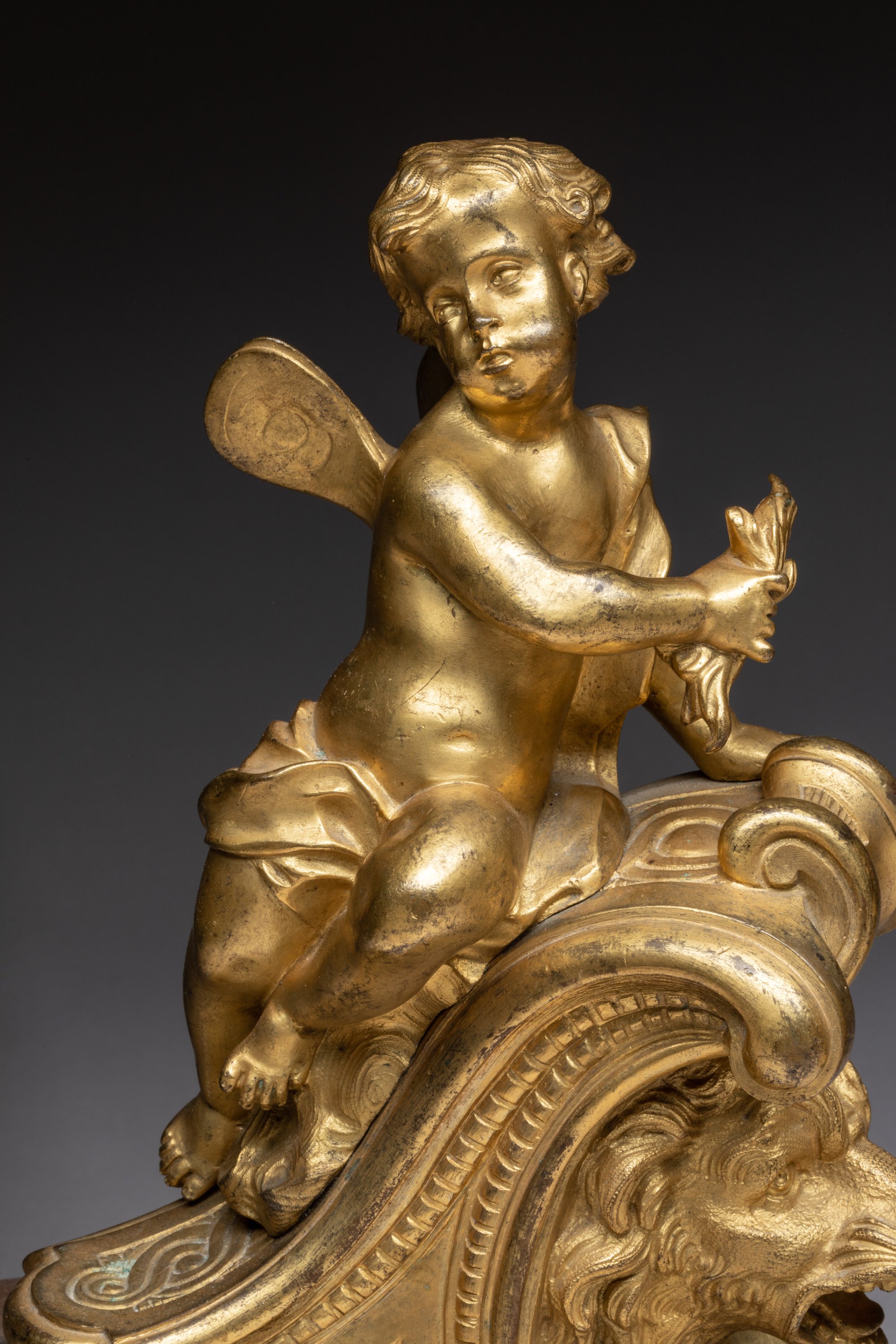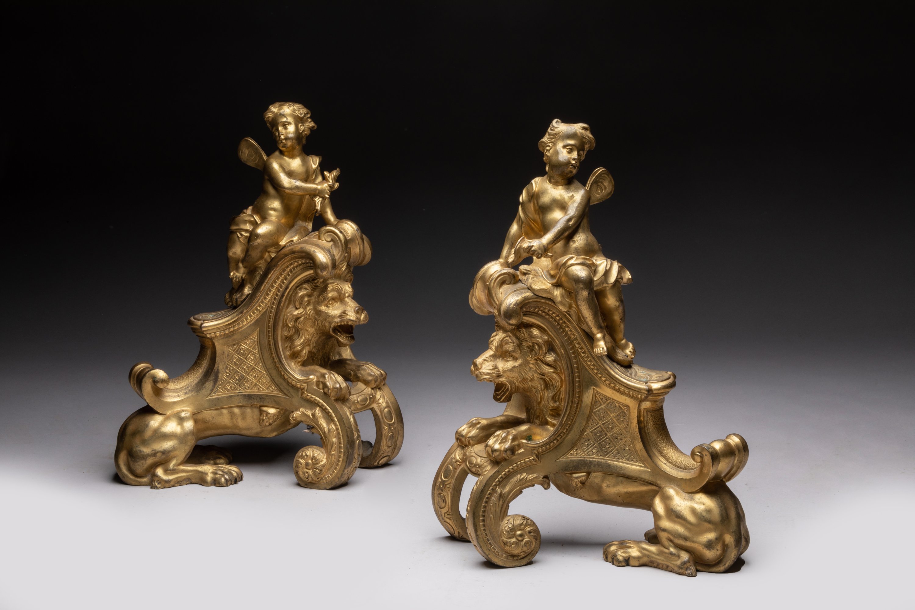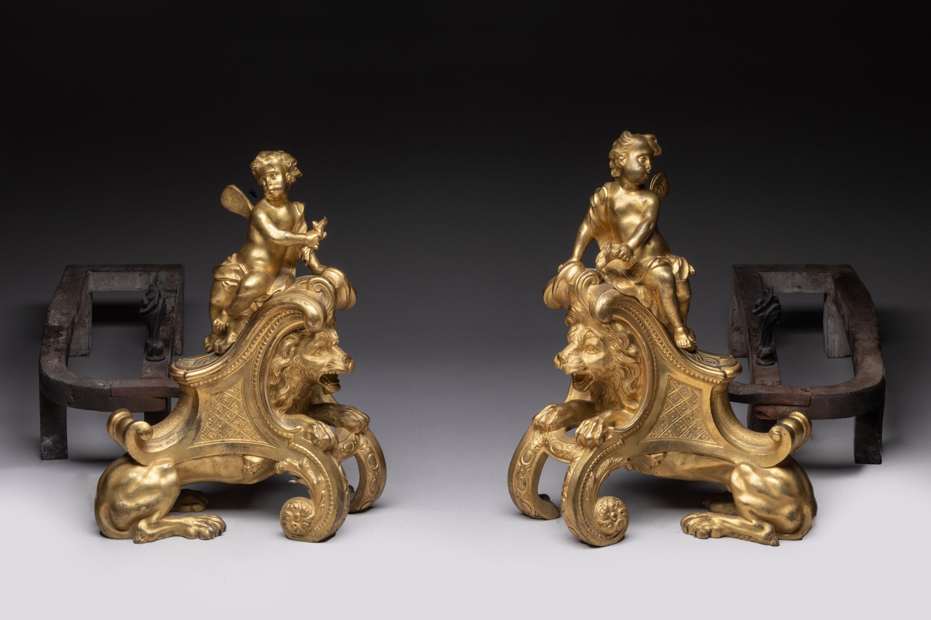 A pair of Regency period chiseled and gilded bronze andirons in the shape of lions exiting a cave topped by cherubs. Attributed to Charles Cressent.