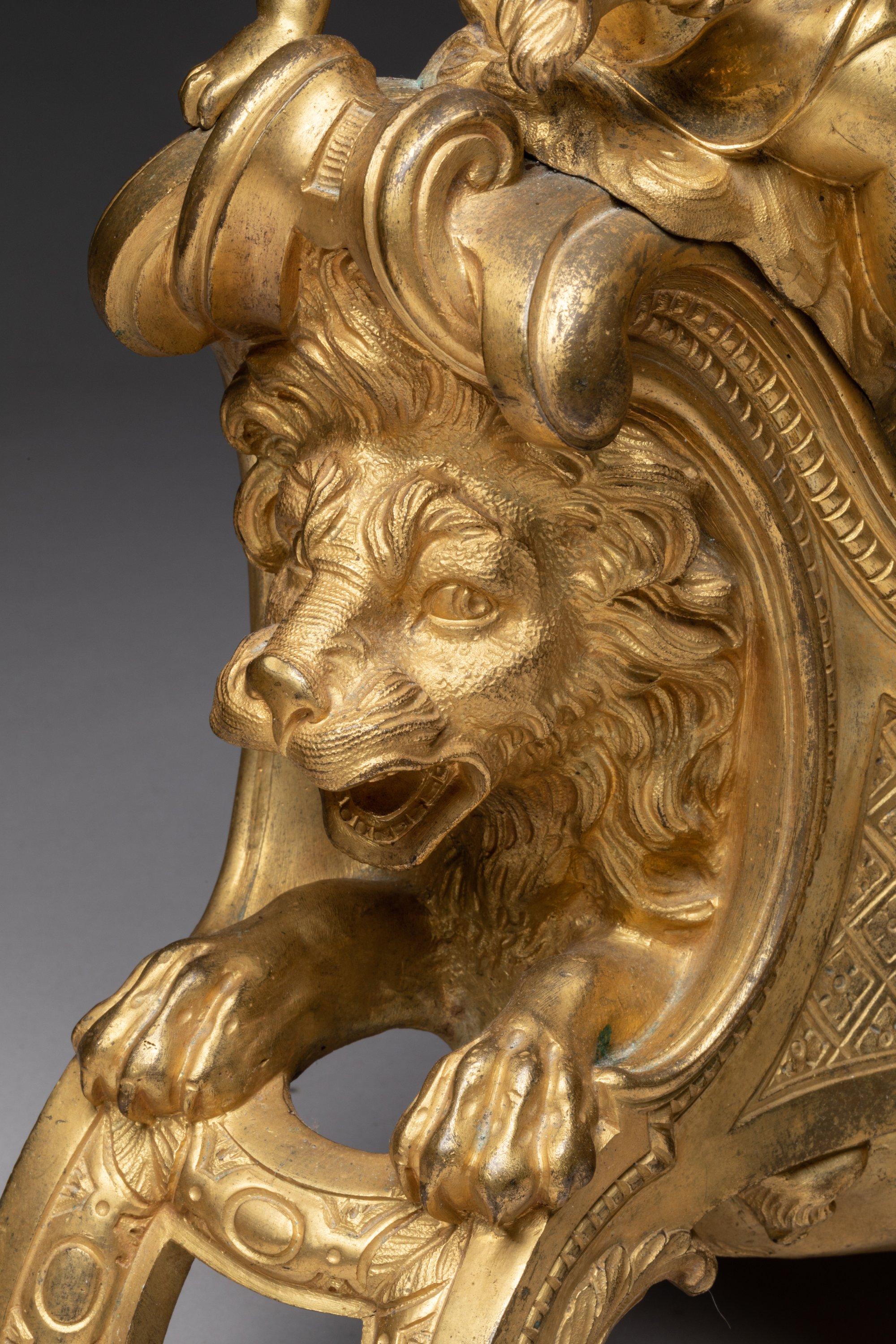 en bronze ciselé et doré. Composés de lions assis sur leurs pattes arrière et sortant en rugissant dune grotte figurée par des enroulements. Aux sommets, deux amours sont assis en vis-à-vis.