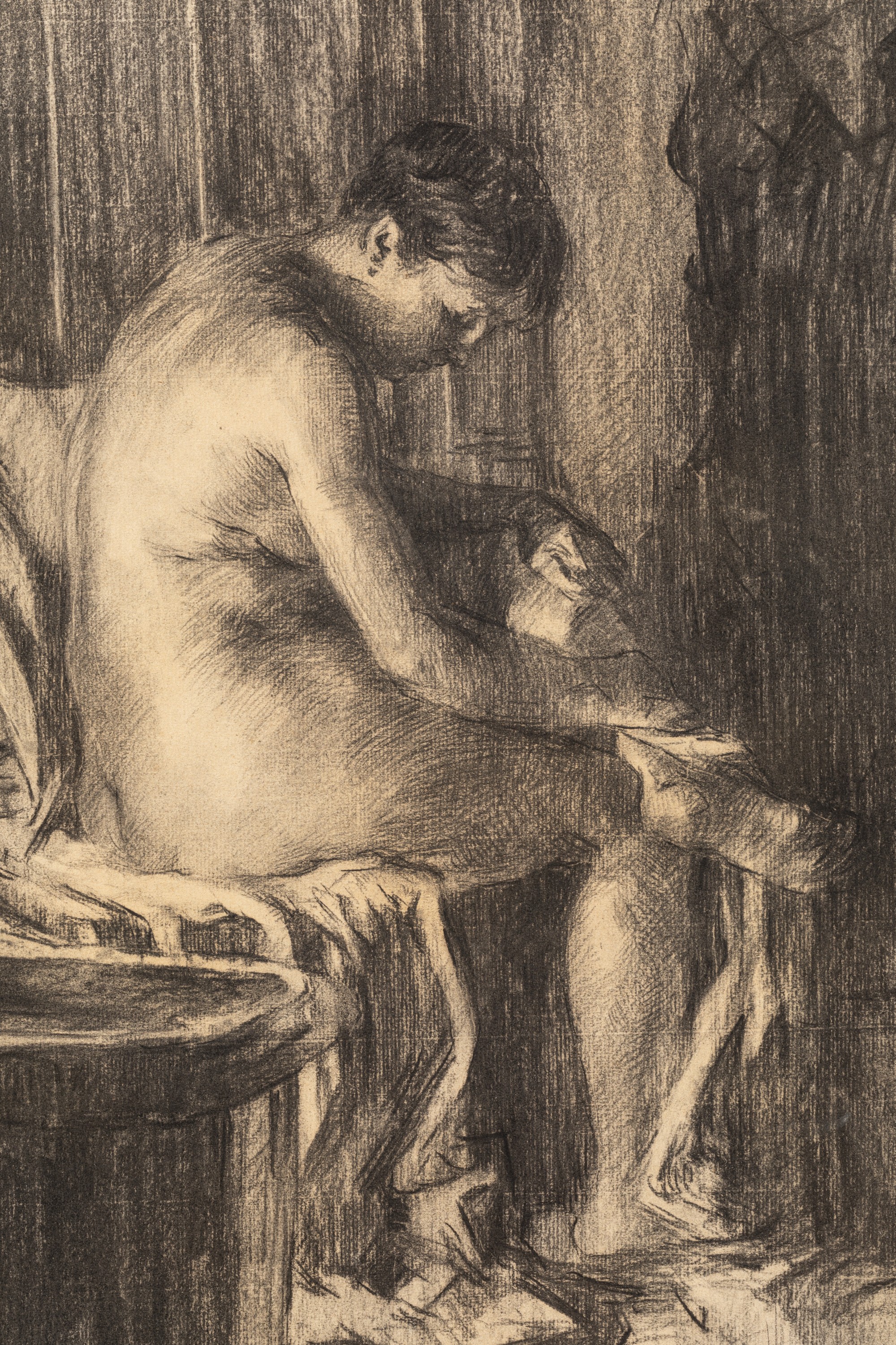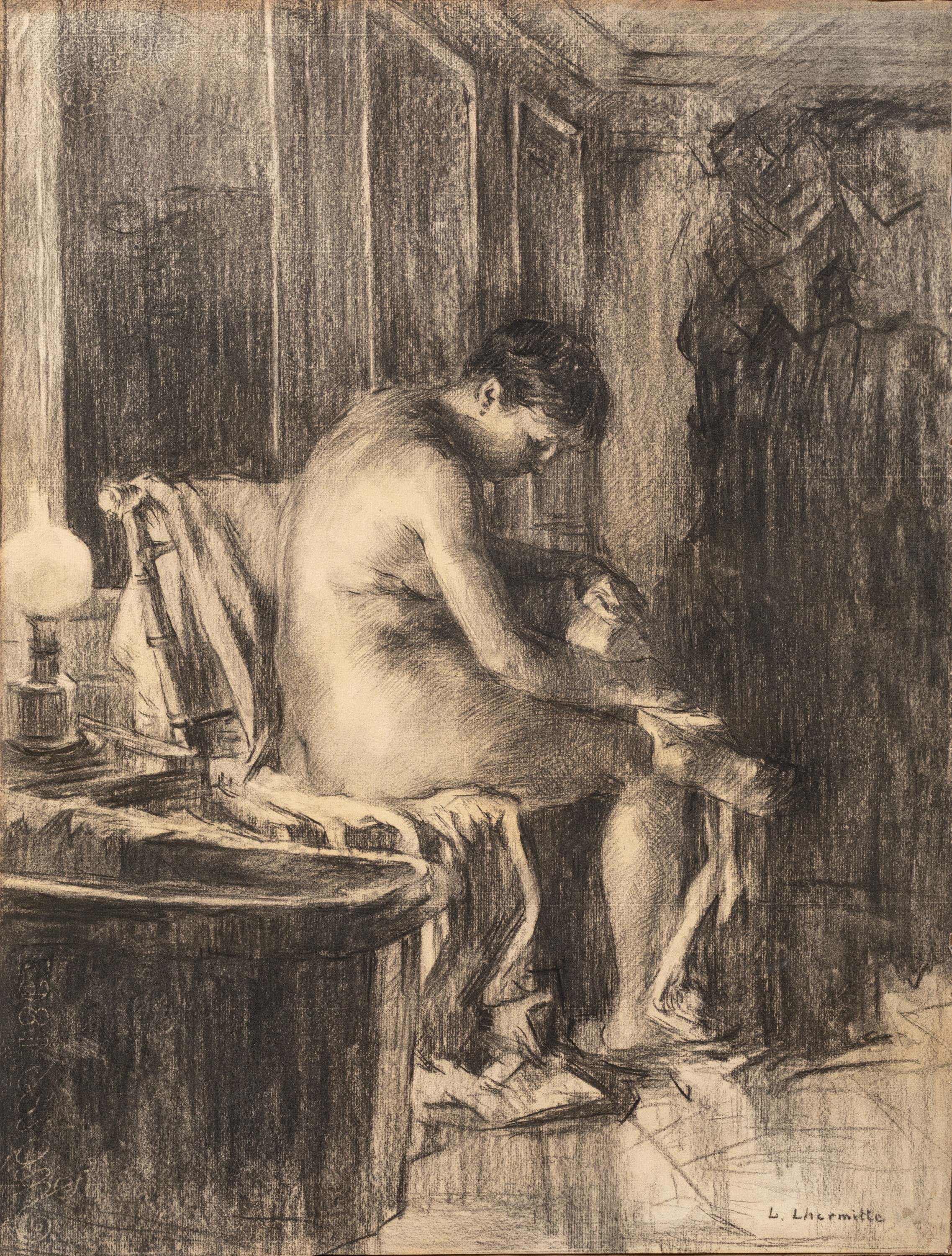 A bathroom scene by Lhermitte, 1884. Charcoal drawing. Signed "L. Lhermitte".