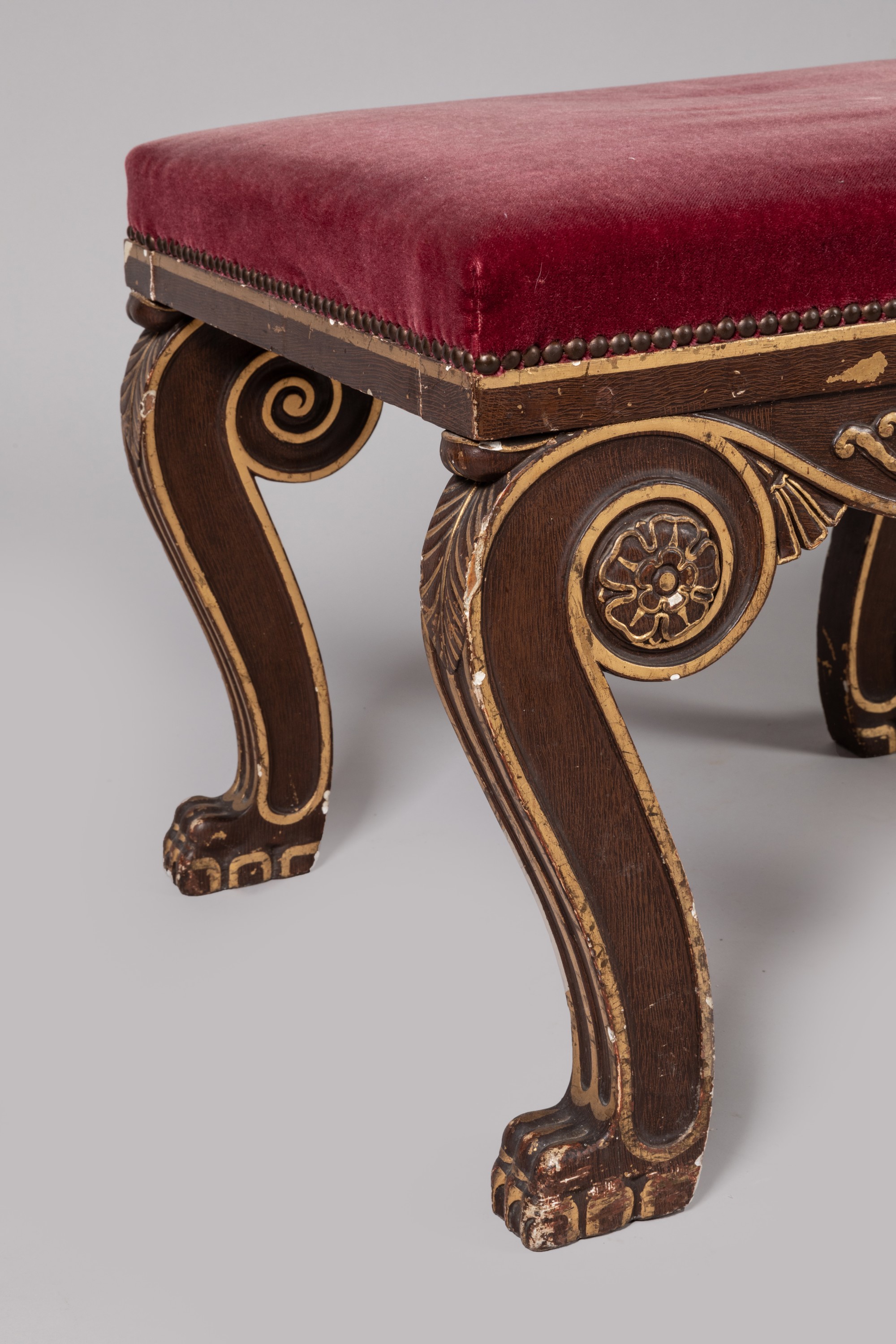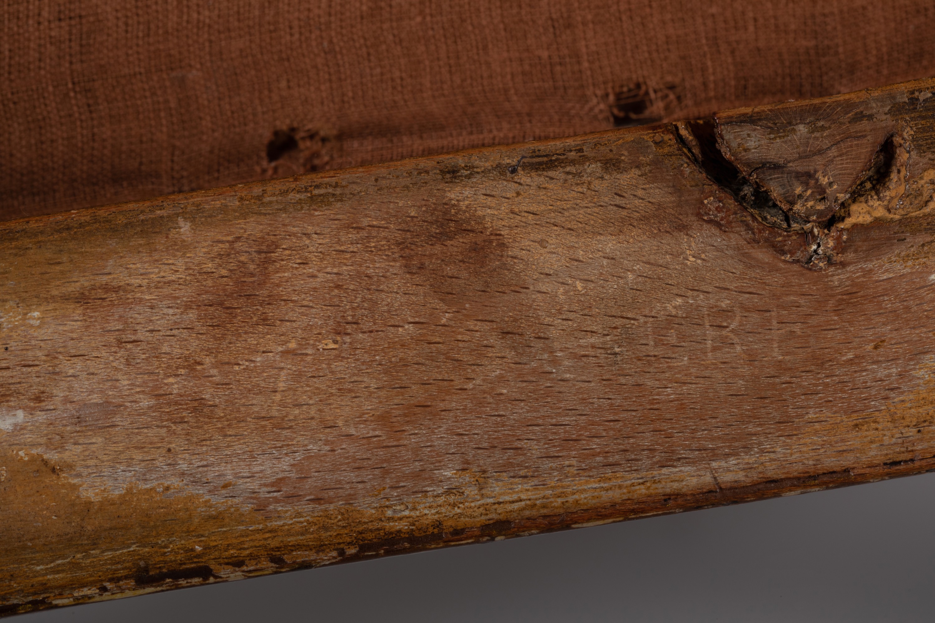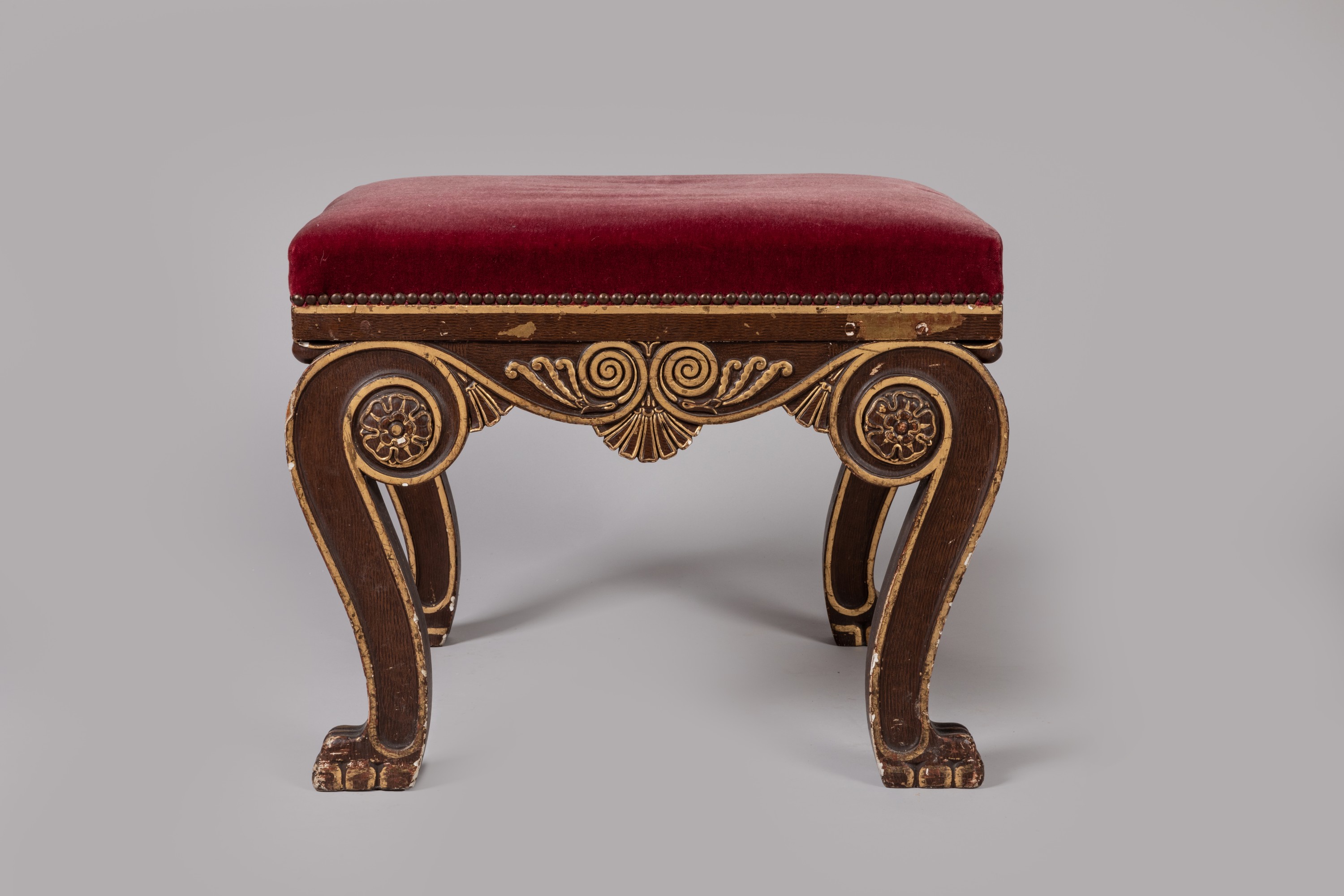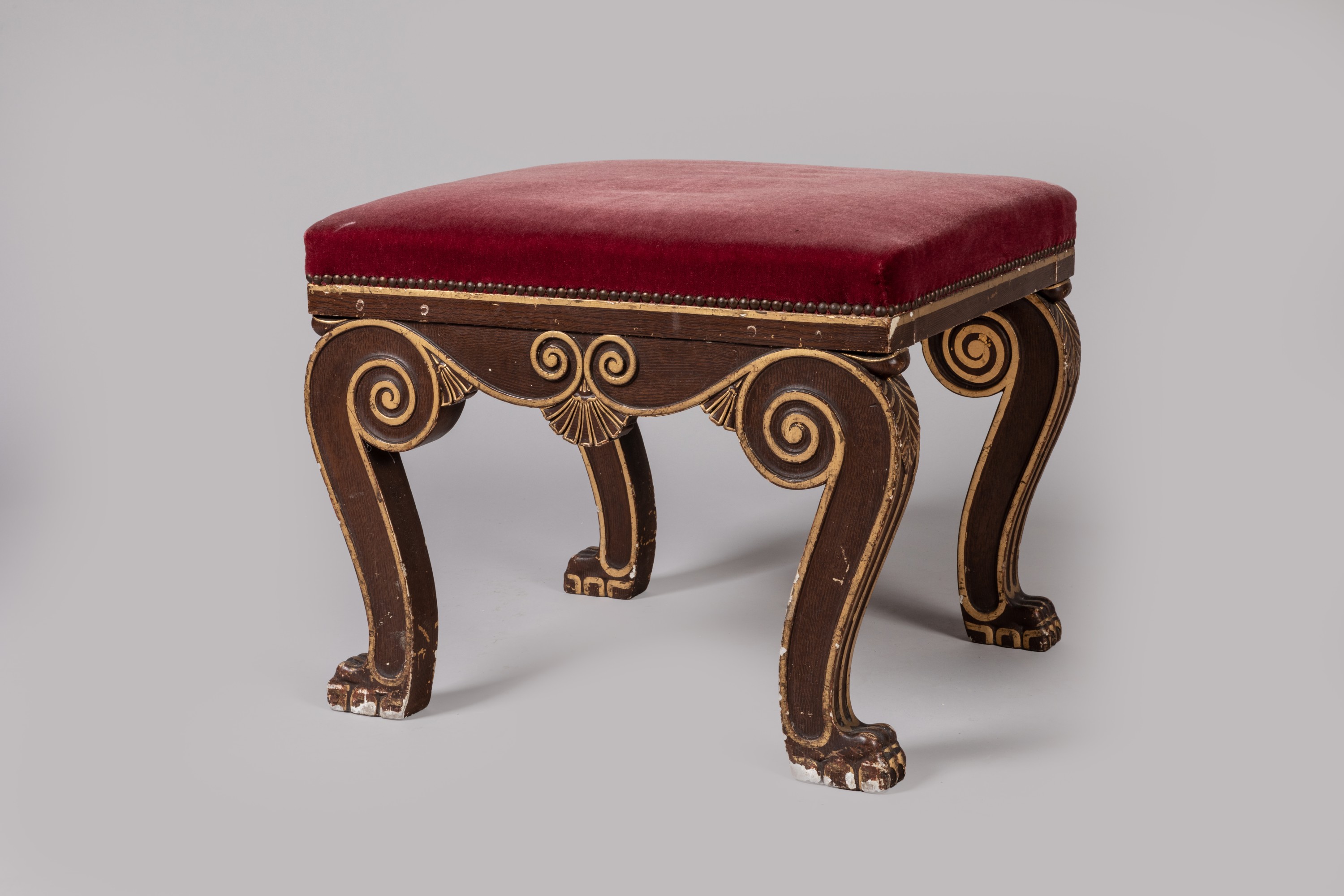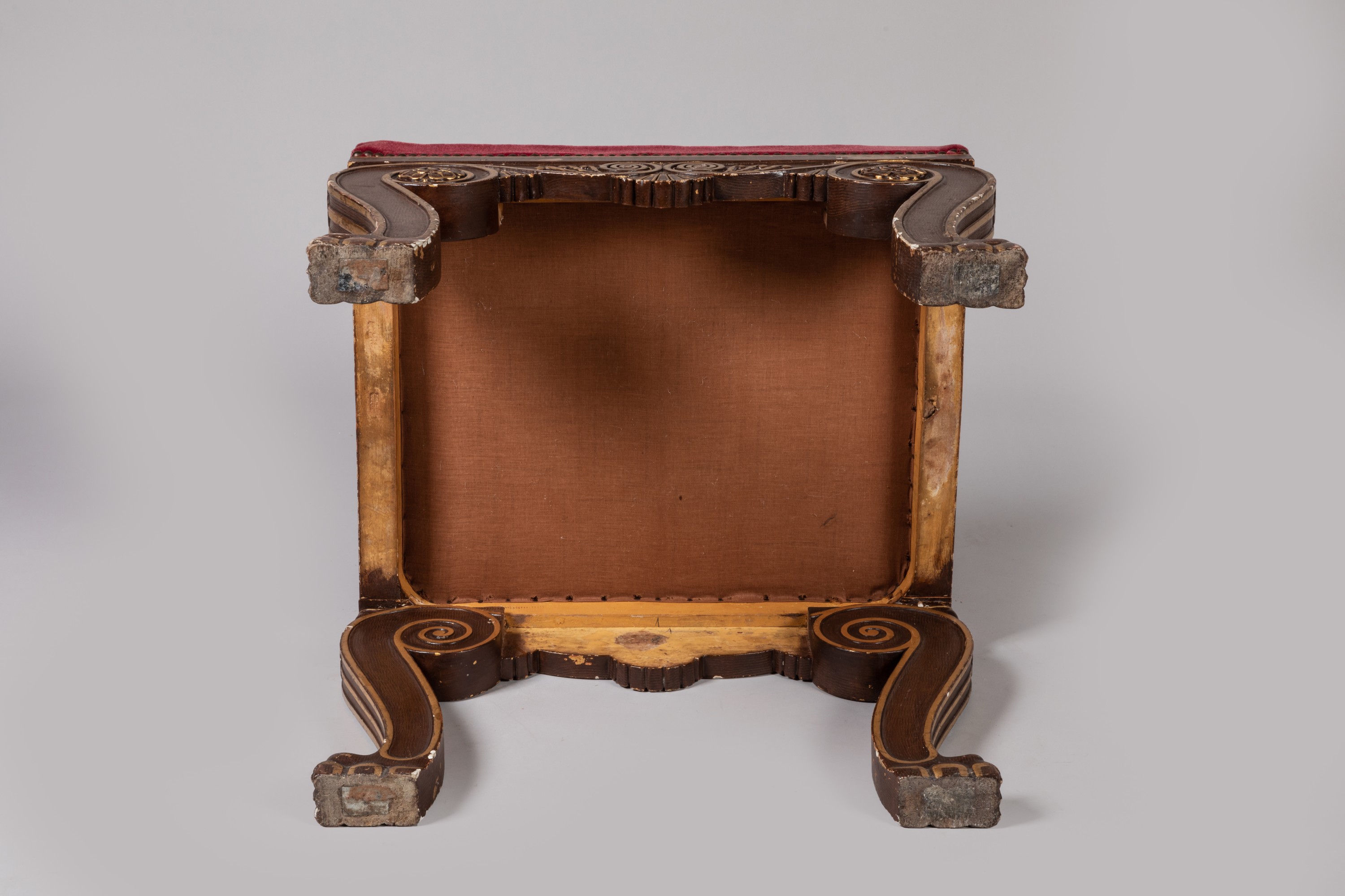 (Petits accidents, restaurations, relaquage et garniture postérieure d'un tissu rouge à l'imitation du velours).