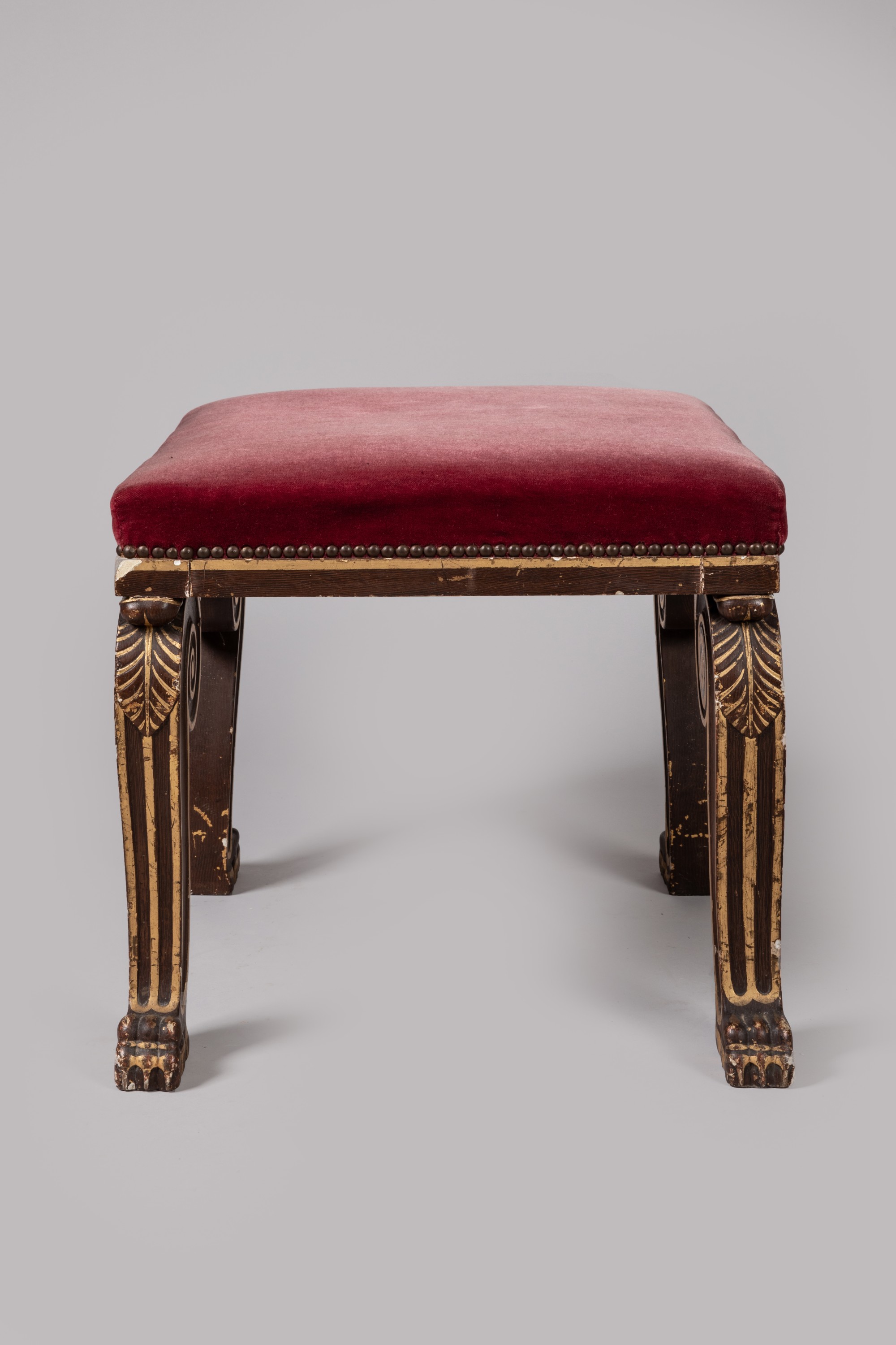 En 1800, le Premier Consul Napoléon Bonaparte s'installe dans les anciens appartements royaux au Palais des Tuileries. Ce lieu devient sa résidence officielle de 1802 jusqu'à la fin de l'Empire. Les architectes Charles Percier et Pierre-Léonard Fontaine fournissent les modèles de sièges à réaliser aux fils de l'ébéniste George Jacob, Georges II Jacob (1768-1803) et François-Honoré-Georges Jacob-Desmalter (1770-1841) associés rue Meslée à Paris. Ce tabouret s'inspire du piètement de table reproduit à la planche XVI de leur recueil de "Décoration intérieure », repris par la suite par Thomas Hope dans son "Household Furniture and Interior Decoration" de 1807.