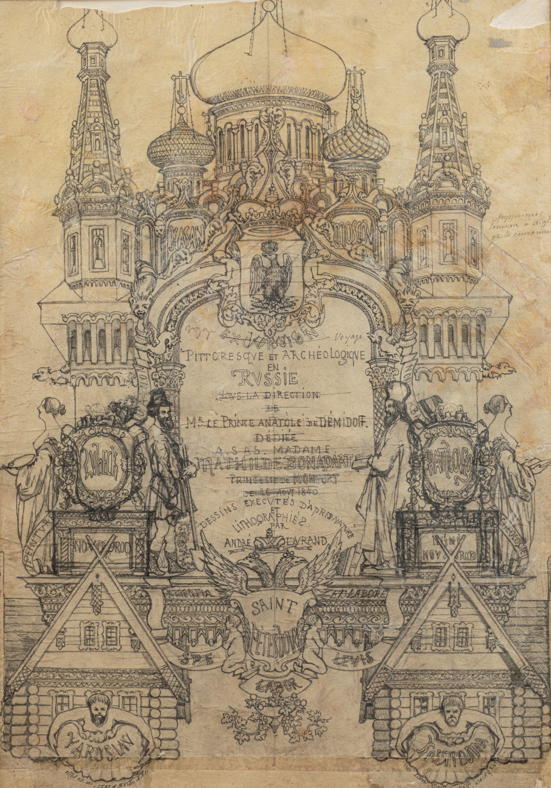 A set of ninety-three drawings on tracing paper by Durand depicting his Journey to Russia supported by Prince Anatole de Demidoff ca. 1839-1848. Eighty-nine drawings are presented in gilded stucco frames.