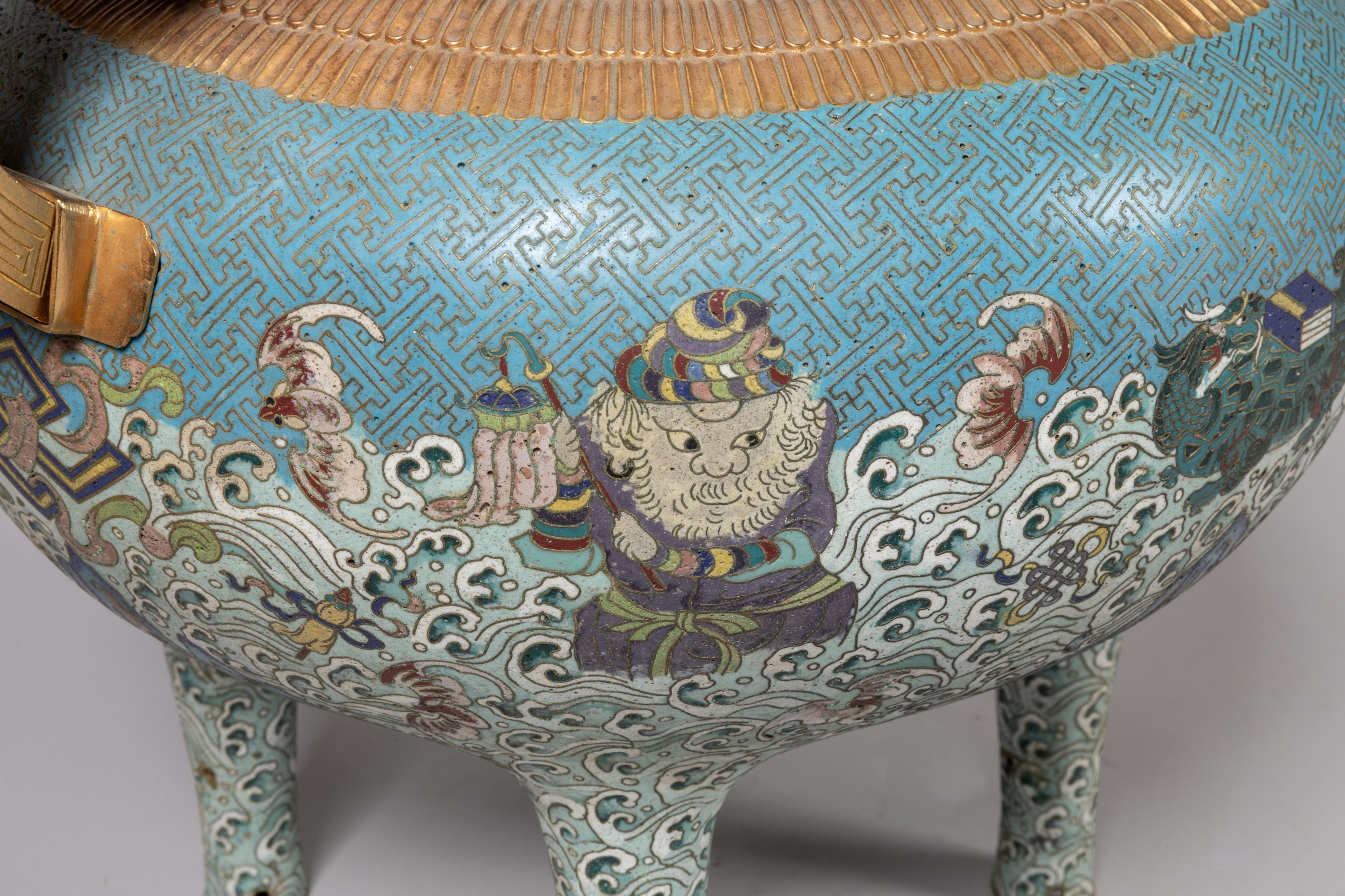 en bronze doré et émaux cloisonnés à décor de personnages étrangers et chevaux au-dessus des flots écumants sur fond bleu turquoise. Le couvercle orné de quatre réserves quadrilobées ornées d'objets auspicieux sur fond de chauves-souris et svastika. La prise du couvercle ornée de caractères "shou" stylisé et lotus.