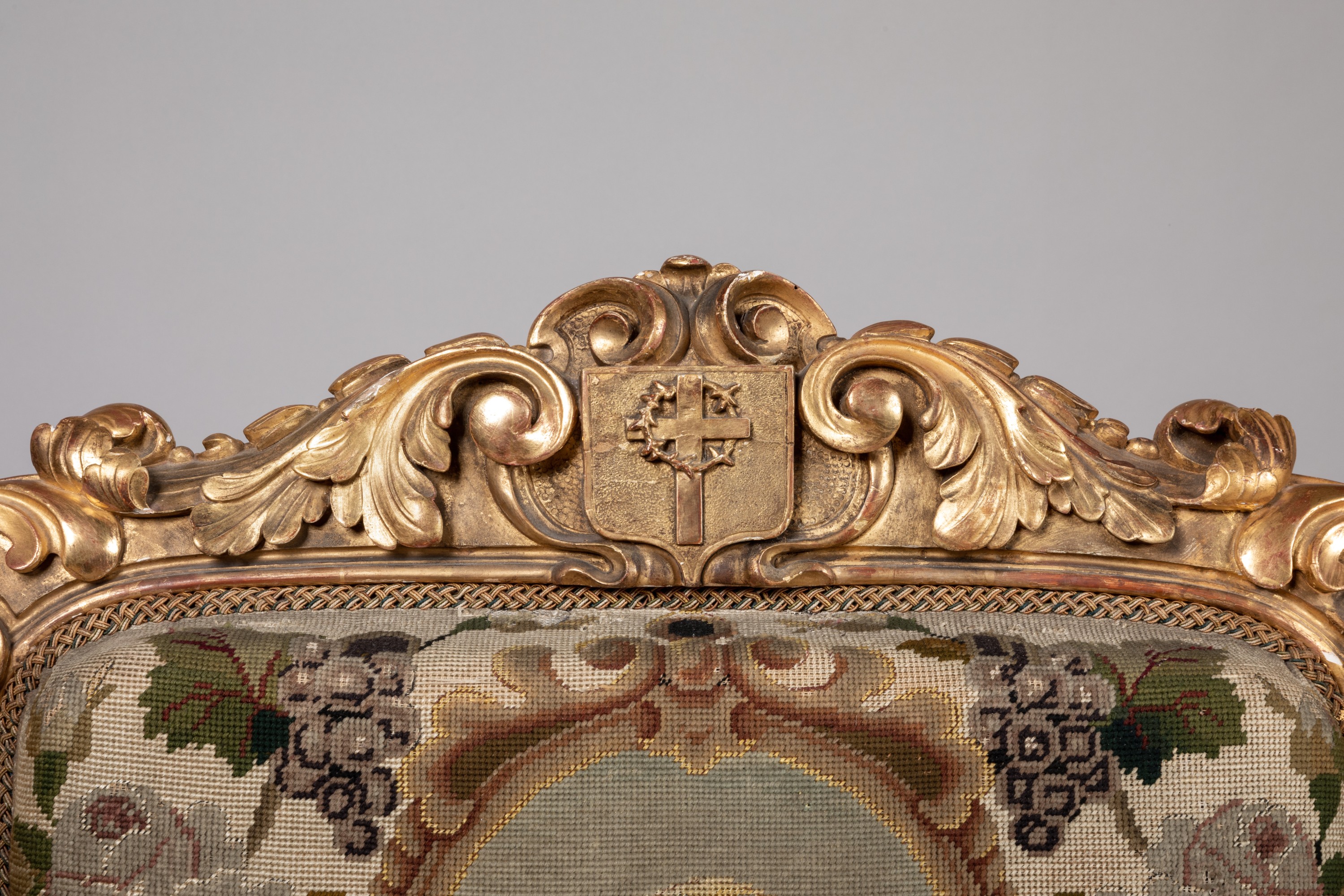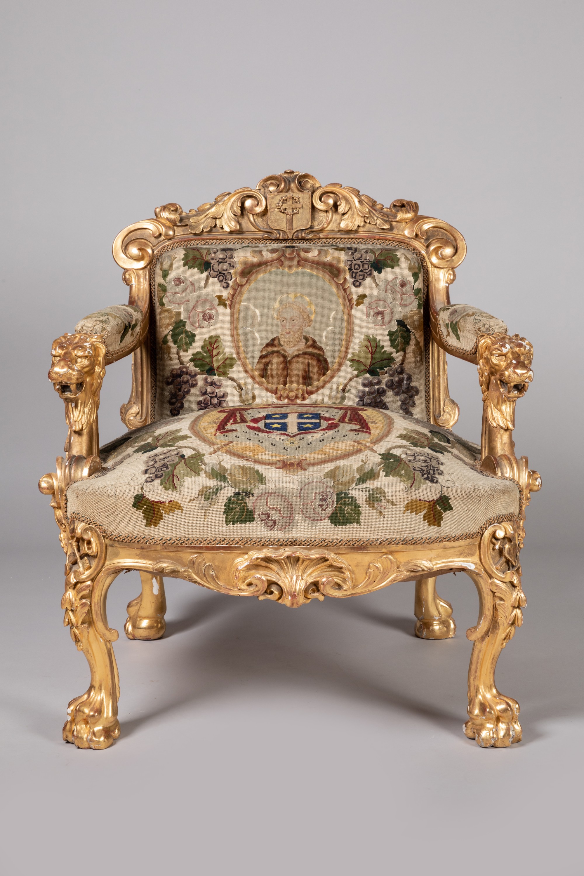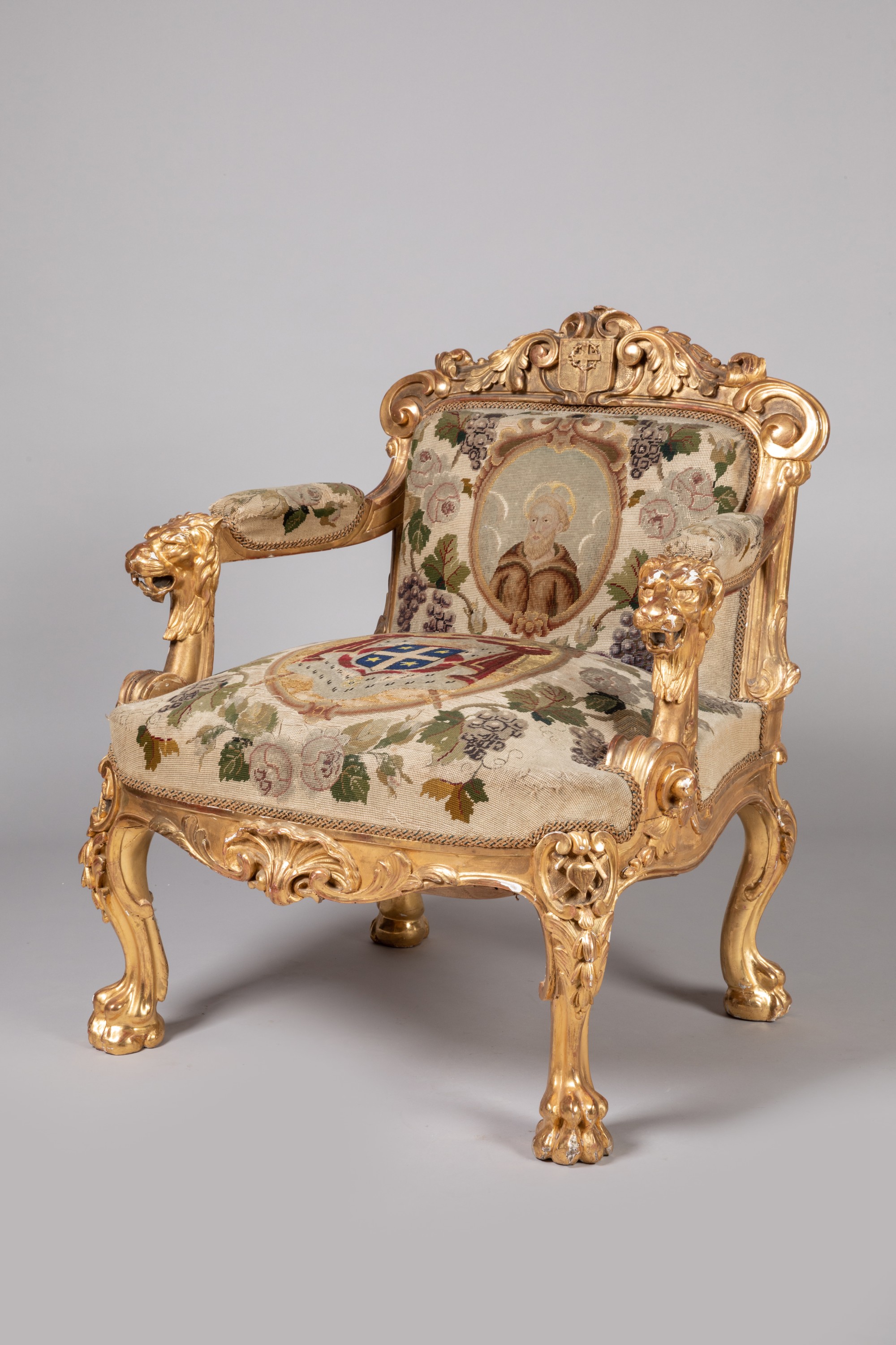 en bois doré, mouluré, sculpté et stuqué. L'amortissement figurant une croix et une couronne d'épines dans un cartouche entouré de feuilles d'acanthe traitées en rinceaux. L'épaulement à enroulement, les accotoirs à manchettes se prolongeant par des mufles de lion inscrits sur des consoles. La ceinture offre au centre une coquille Saint-Jacques entourée de feuilles d'acanthe. Les pieds antérieurs sont surmontés à gauche de deux clés entrecroisées et à droite d'un cur transpercé de deux épées. Les quatre pieds se terminent chacun par des griffes de lion.