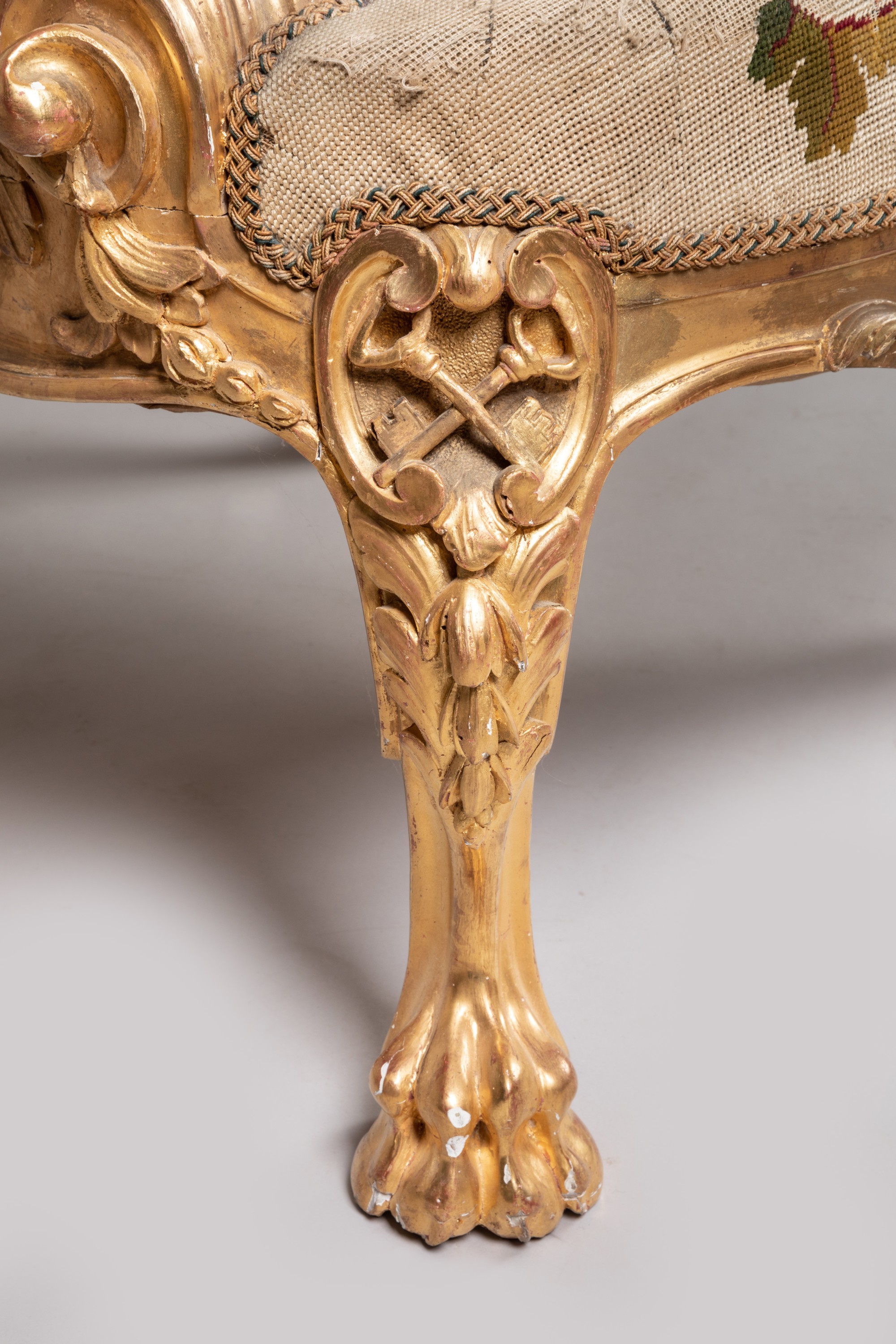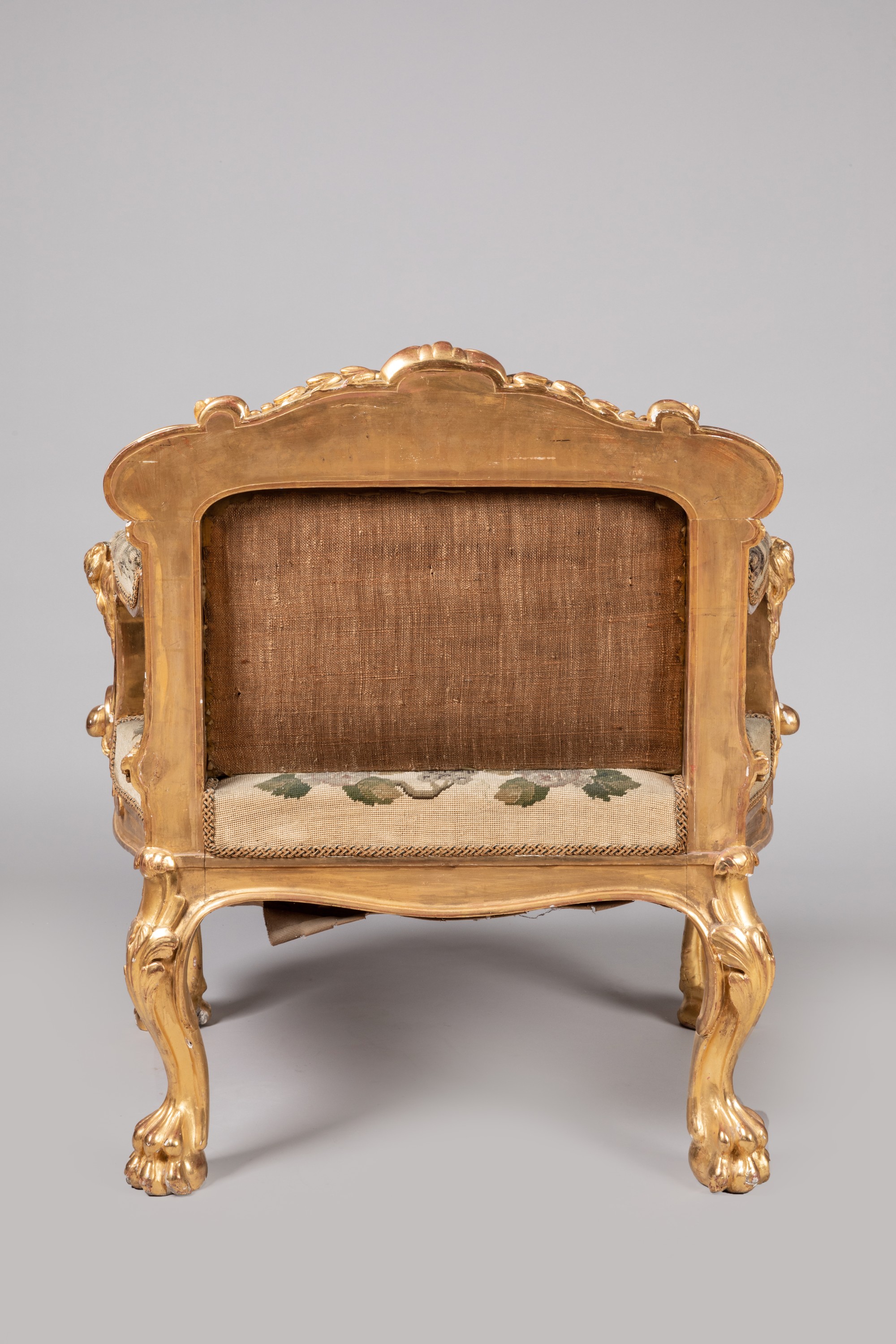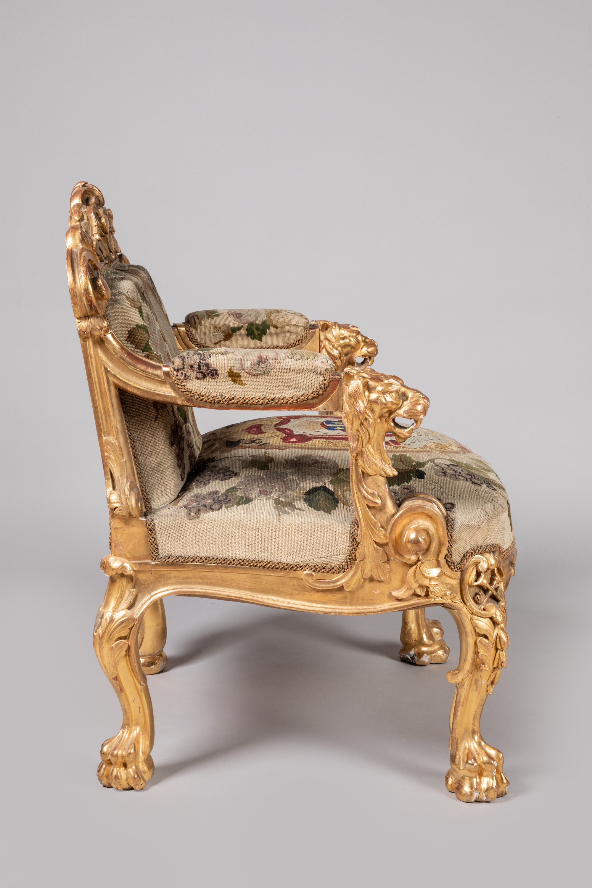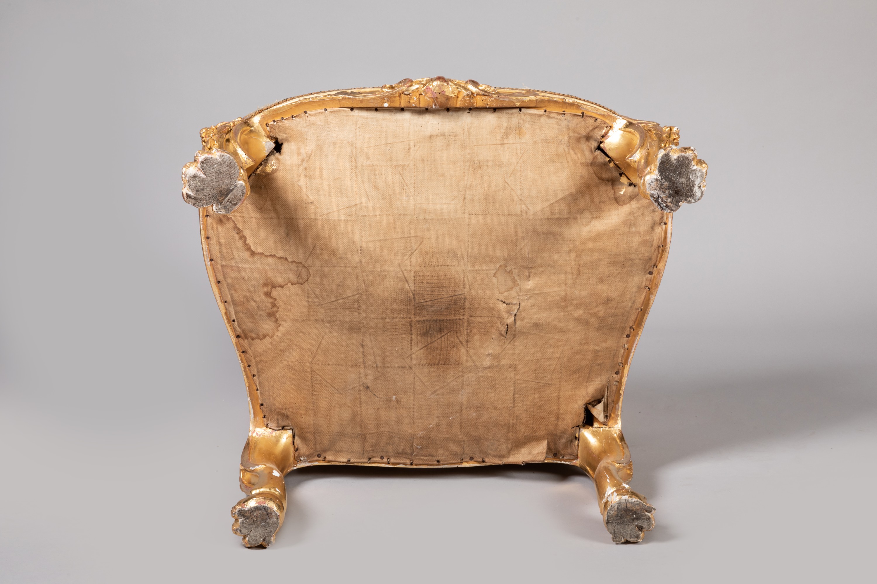 en bois doré, mouluré, sculpté et stuqué. L'amortissement figurant une croix et une couronne d'épines dans un cartouche entouré de feuilles d'acanthe traitées en rinceaux. L'épaulement à enroulement, les accotoirs à manchettes se prolongeant par des mufles de lion inscrits sur des consoles. La ceinture offre au centre une coquille Saint-Jacques entourée de feuilles d'acanthe. Les pieds antérieurs sont surmontés à gauche de deux clés entrecroisées et à droite d'un cur transpercé de deux épées. Les quatre pieds se terminent chacun par des griffes de lion.