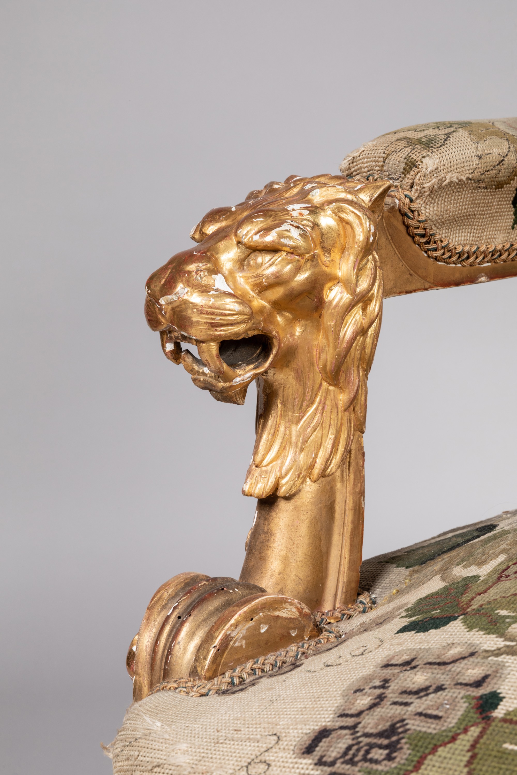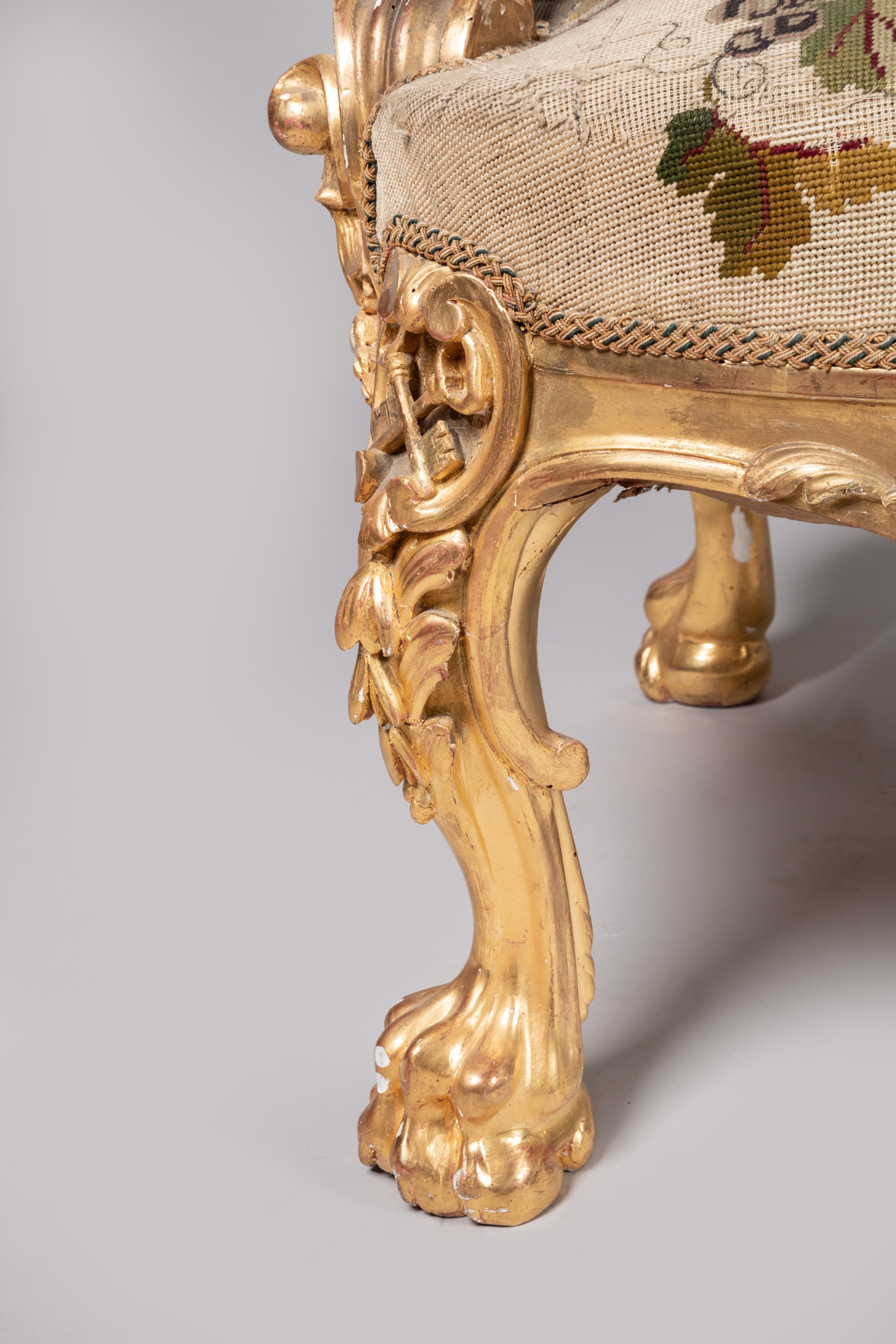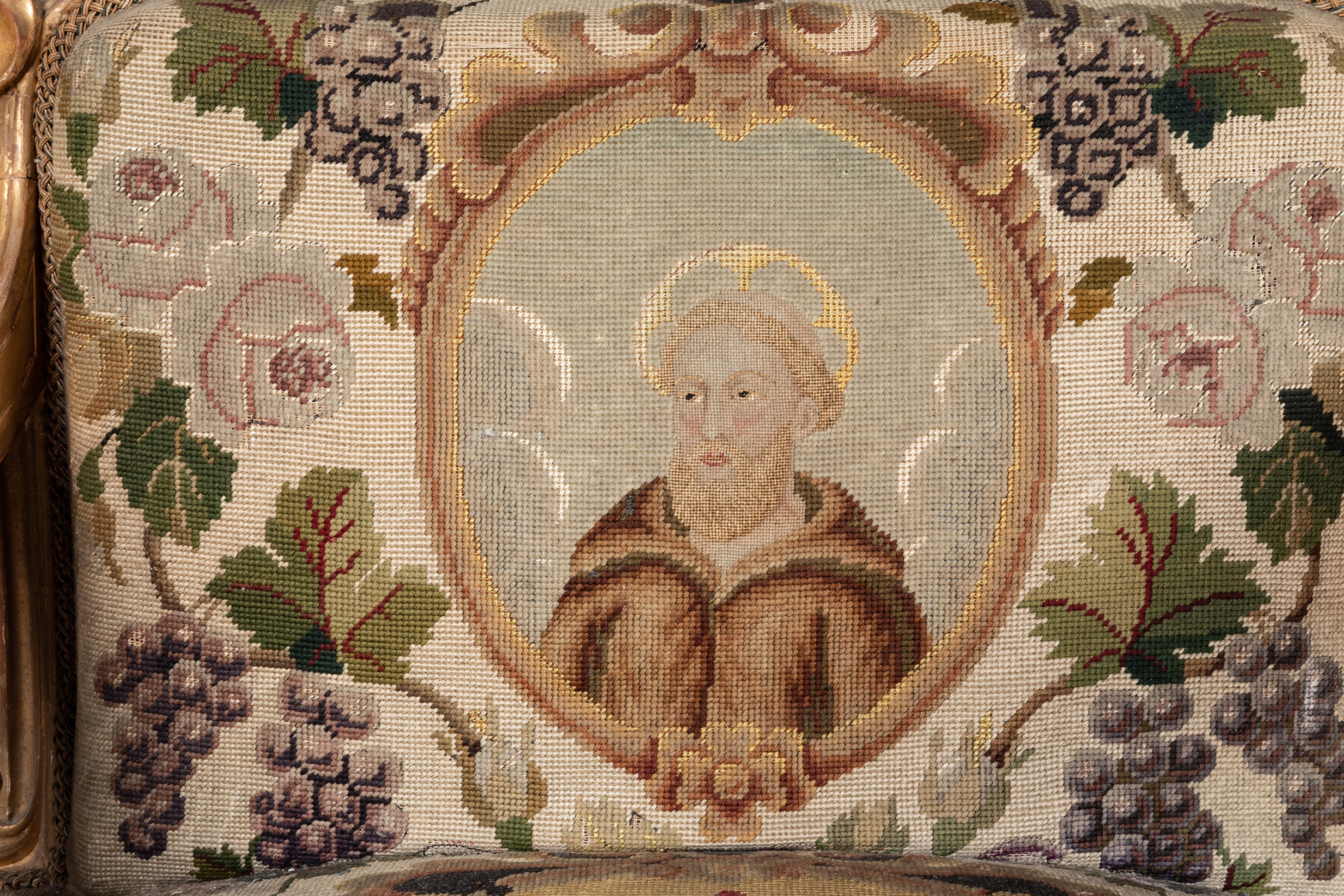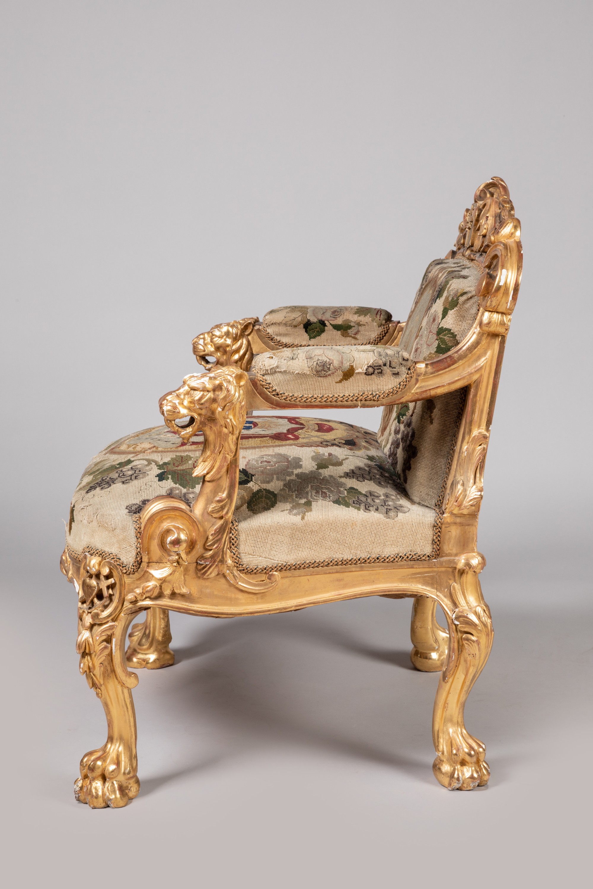 A French mid-19th century episcopal chair having belonged to Cardinal Morlot. Gilded, moulded, carved and stuccoed wood with needlepoint tapestry upholstery.