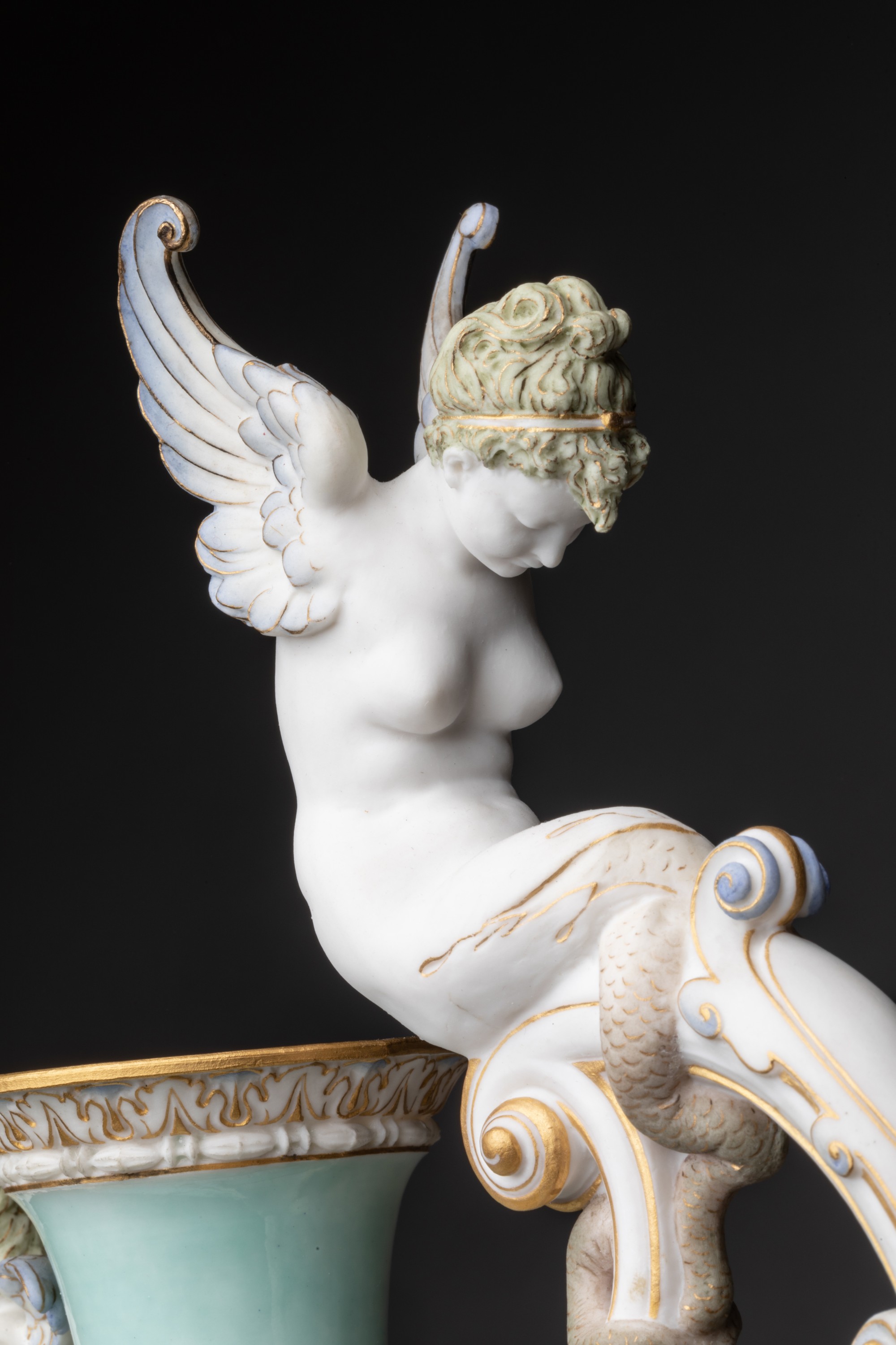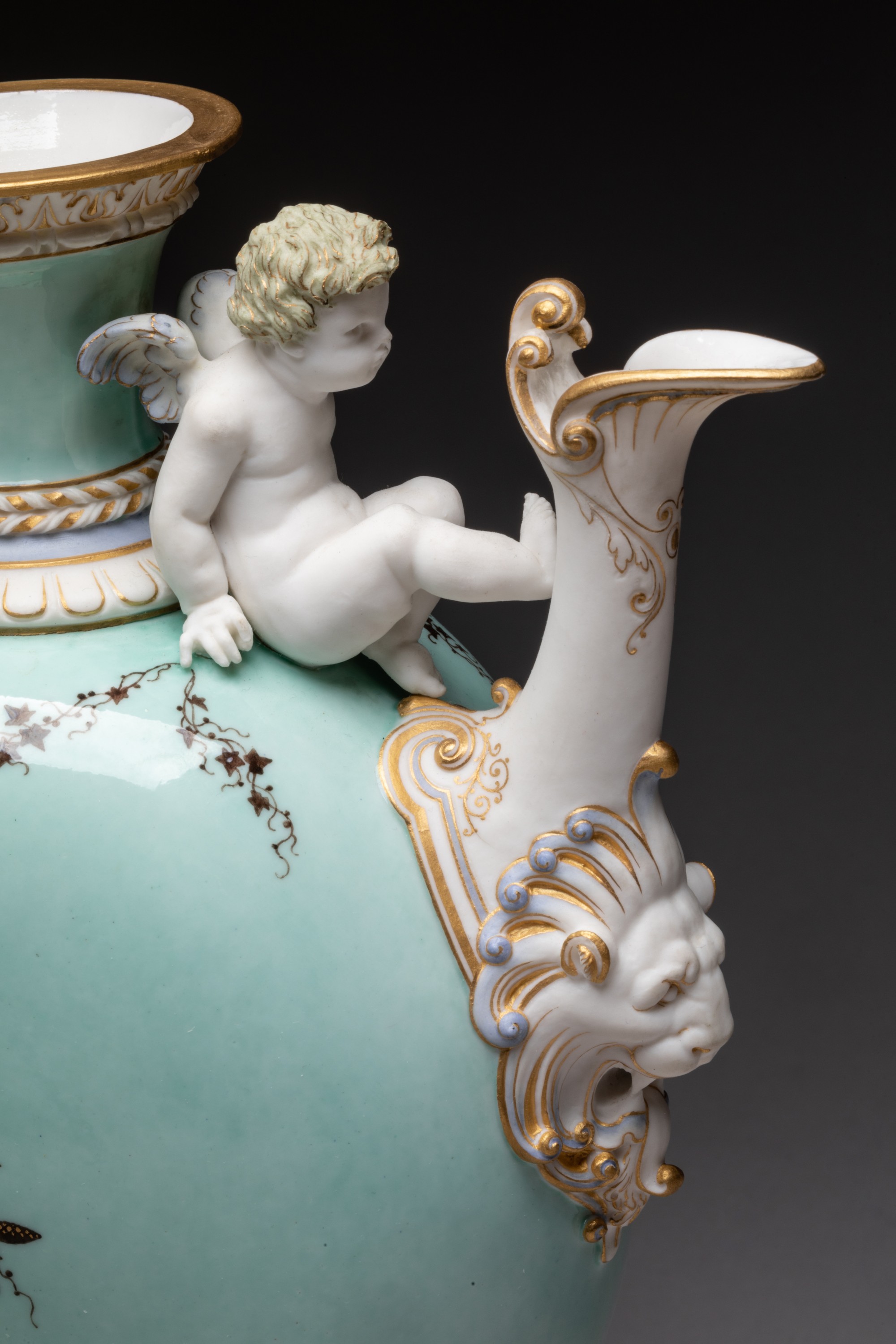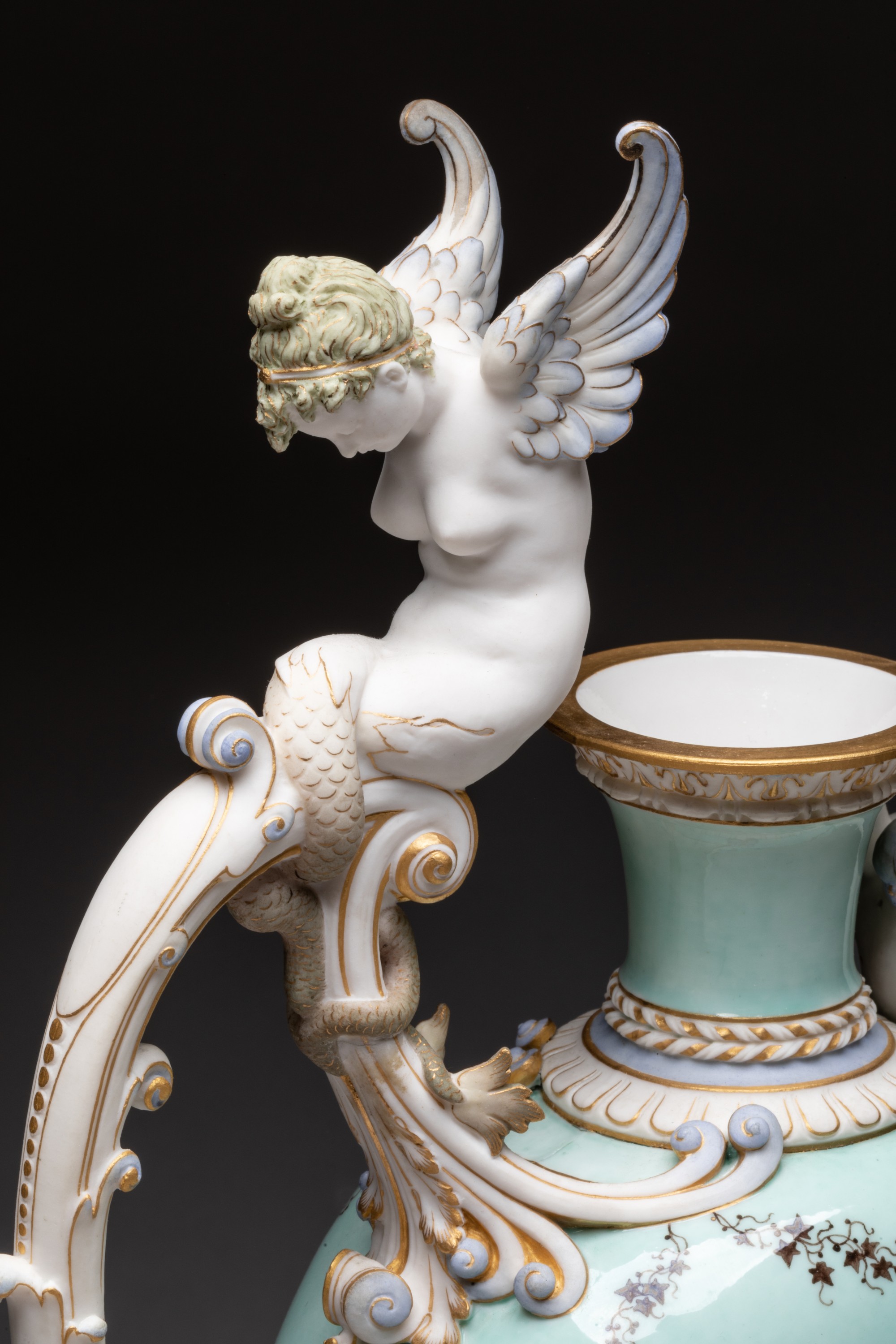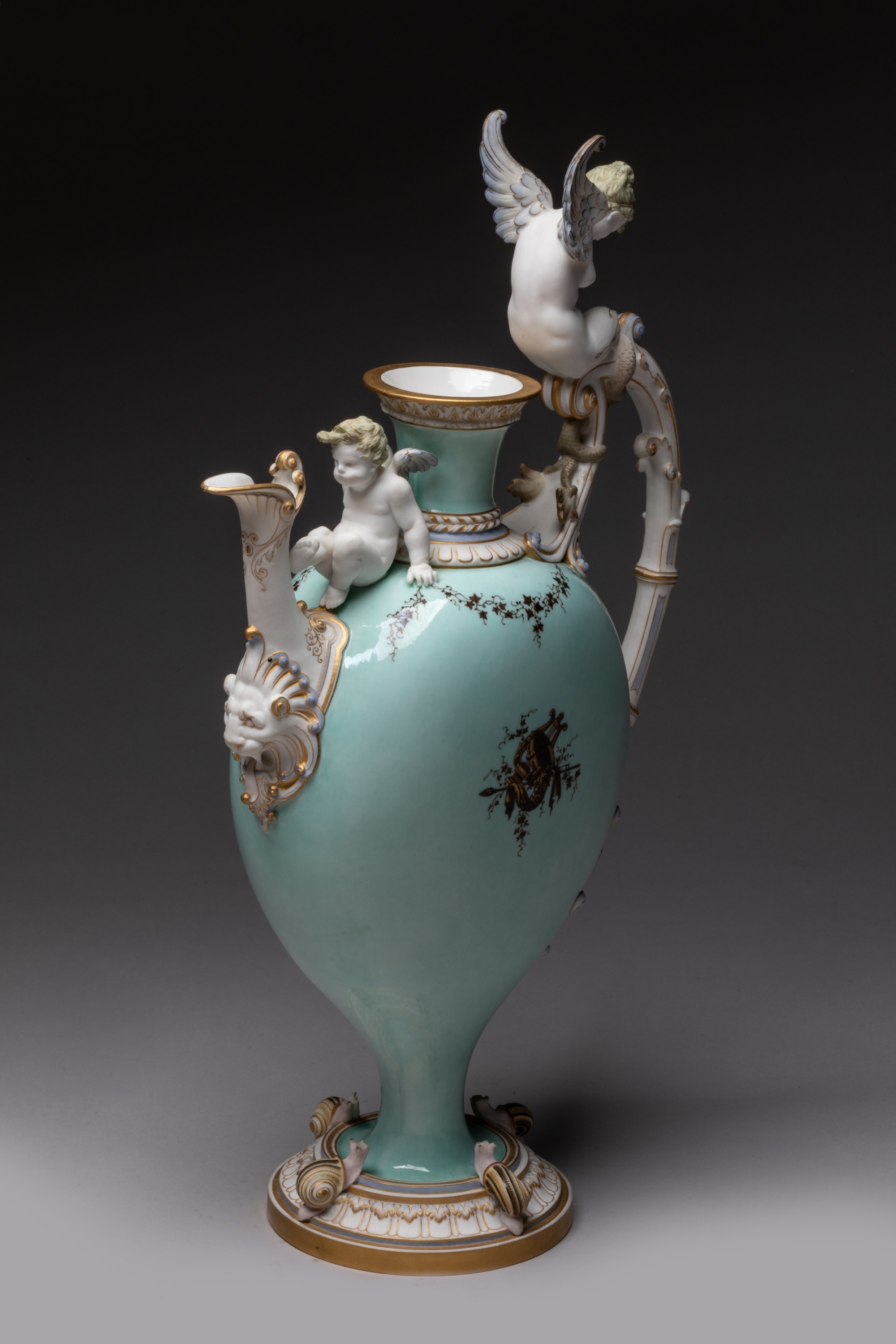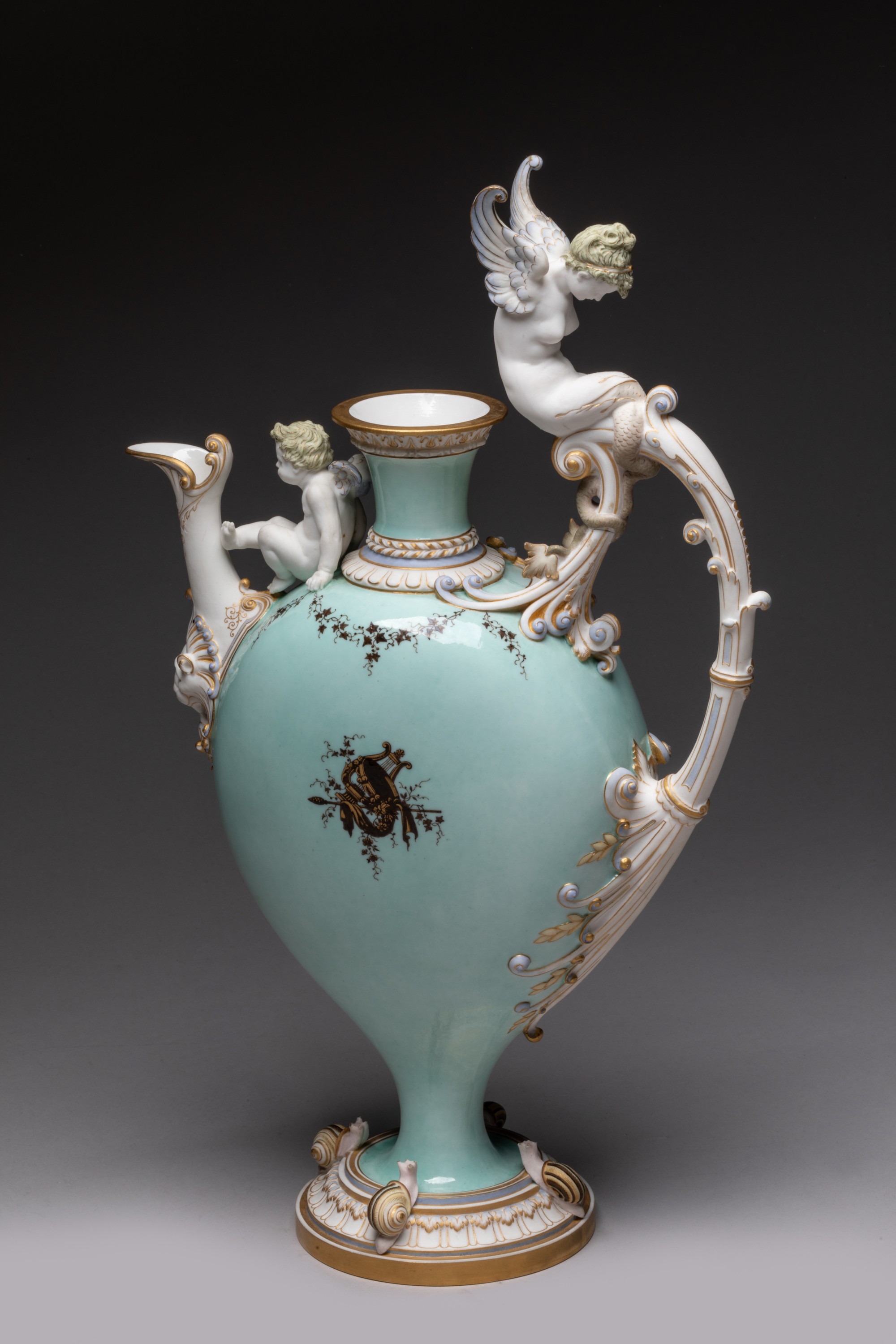 Aiguière en porcelaine nouvelle de forme balustre à panse aplatie sur piédouche nommée buire de Blois, l'anse surmontée d'une sirène ailée et terminée par des feuilles d'acanthe en relief, le déversoir orné dun mufle de lion, un amour assis sur l'épaulement entre le déversoir et le col, quatre escargots sur le piédouche, décor en brun et or sur fond vert pâle de trophées de musique et draperies sur des deux faces de la panse et de guirlandes de lierre sur lépaulement, l'anse, le déversoir, la sirène et l'amour en biscuit rehaussés dor mat.