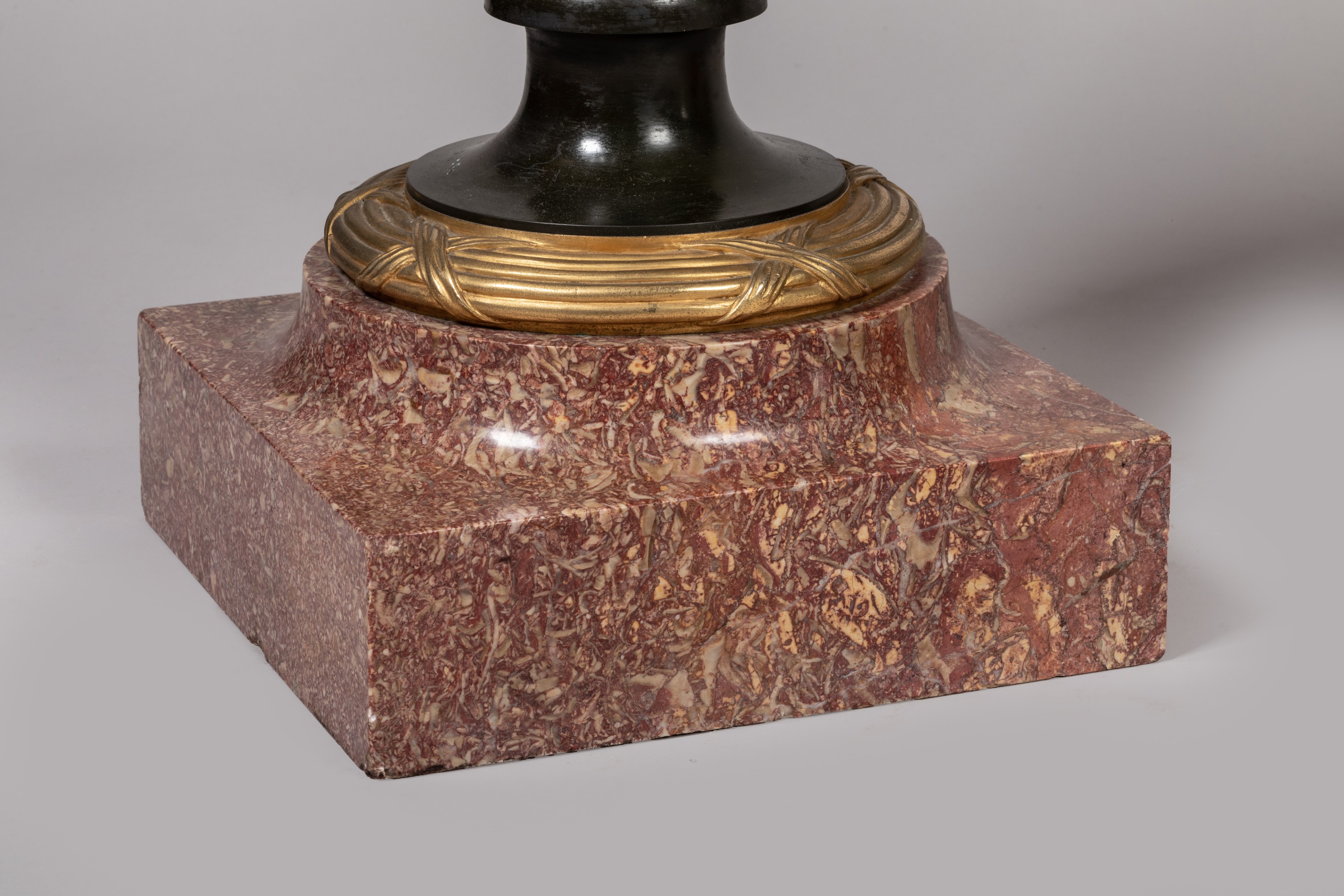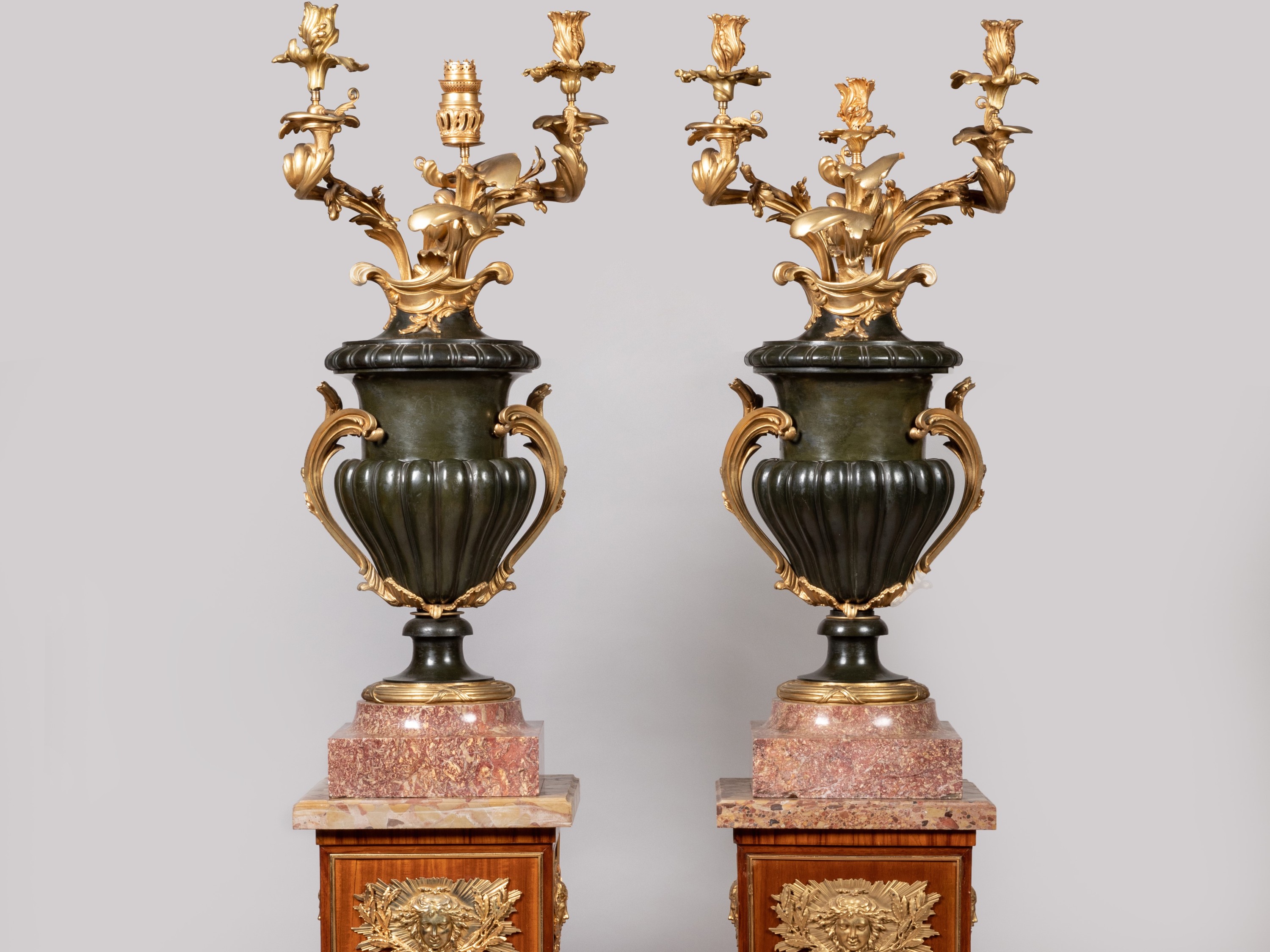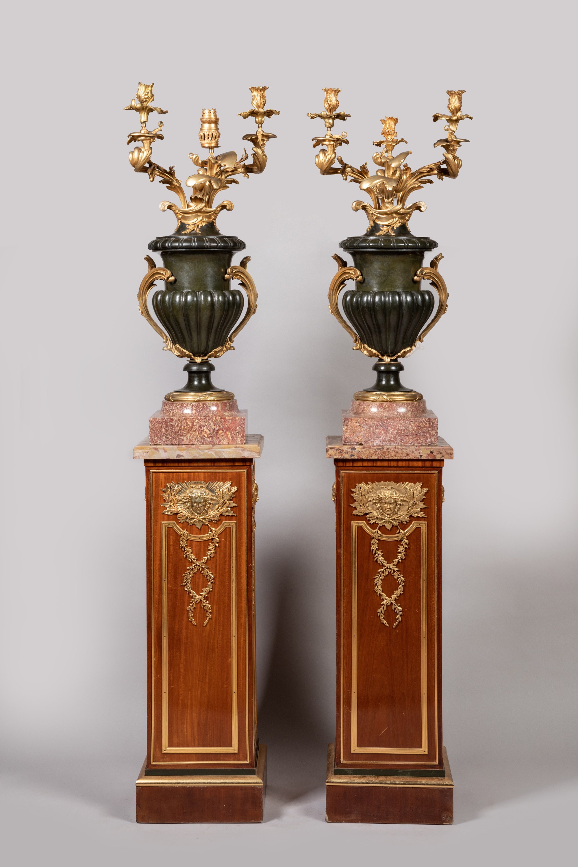 Paire de candélabres dans des vases Médicis posés sur leurs gaines